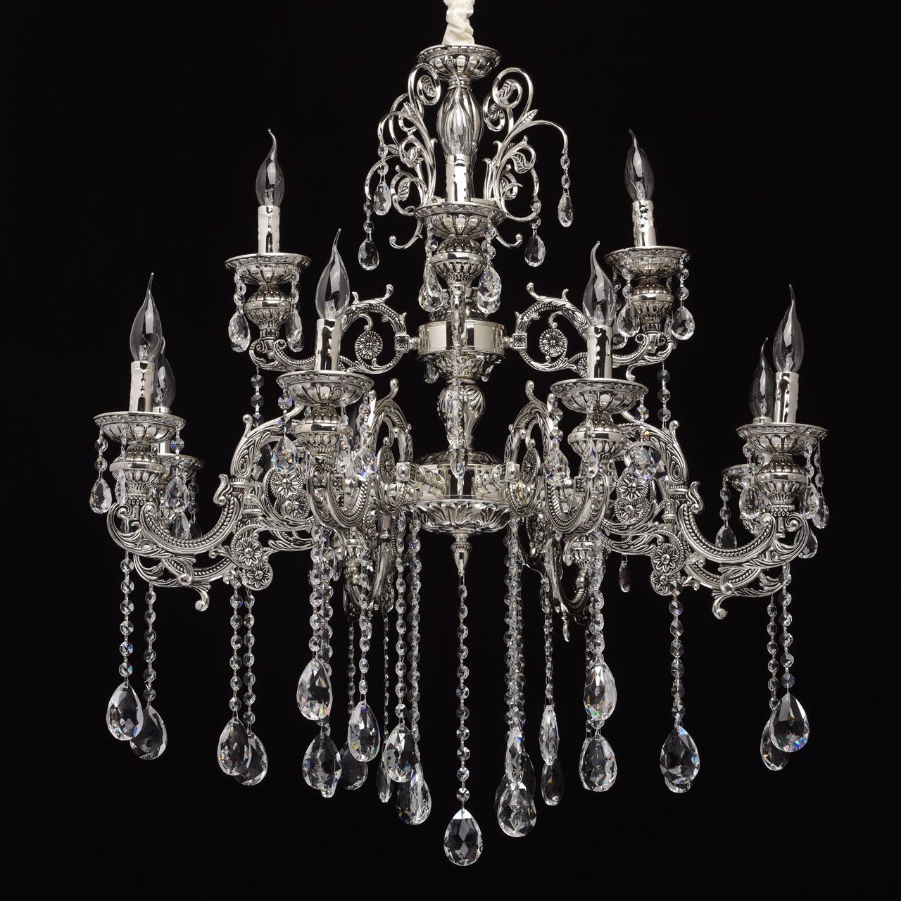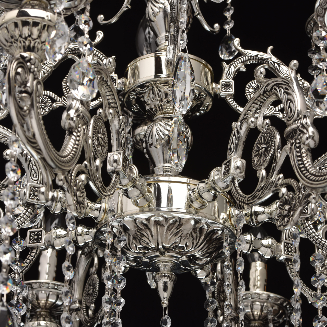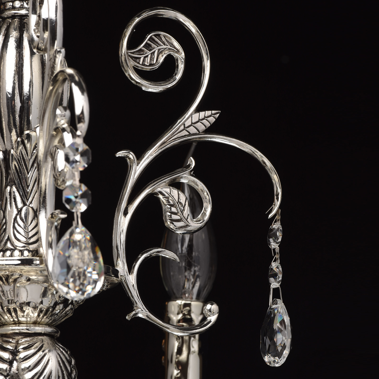 Помпезный стиль люстры из коллекции «Селена» не оставит равнодушным ценителей классических традиций в интерьере. Хромированное металлическое основание, дополненное эффектом патины цвета черненого серебра восхищает продуманным резным декором. Изящные узоры выгодно подчеркивают витиевато изогнутые рожки и объемные широкие розетки из металла. Декоративные элементы в растительной стилистике делают люстру по-настоящему очаровательной, но главная изюминка светильника – элегантные хрустальные подвесы. Их ослепительный блеск наполнит обстановку волшебной игрой света.Преимущества модели