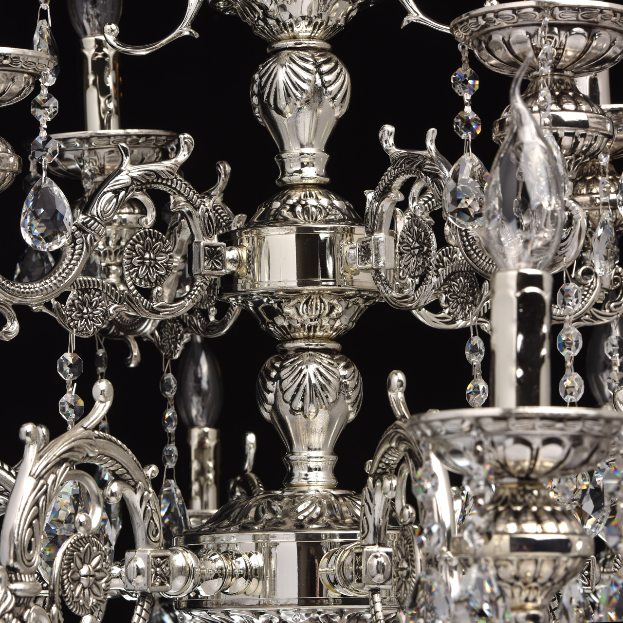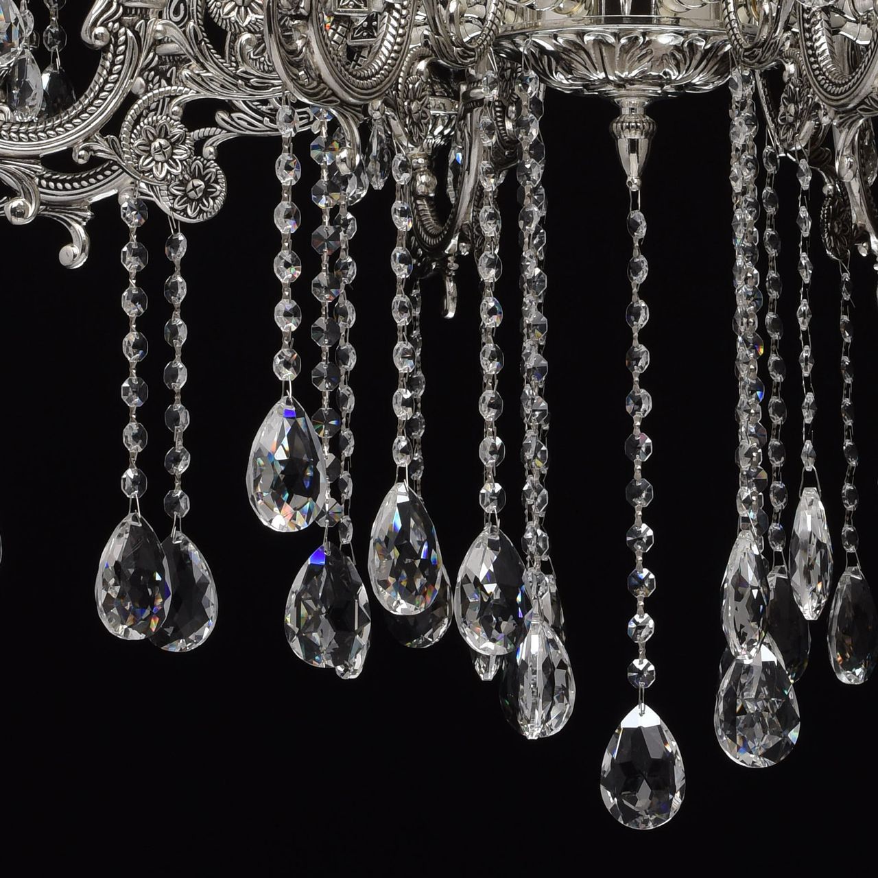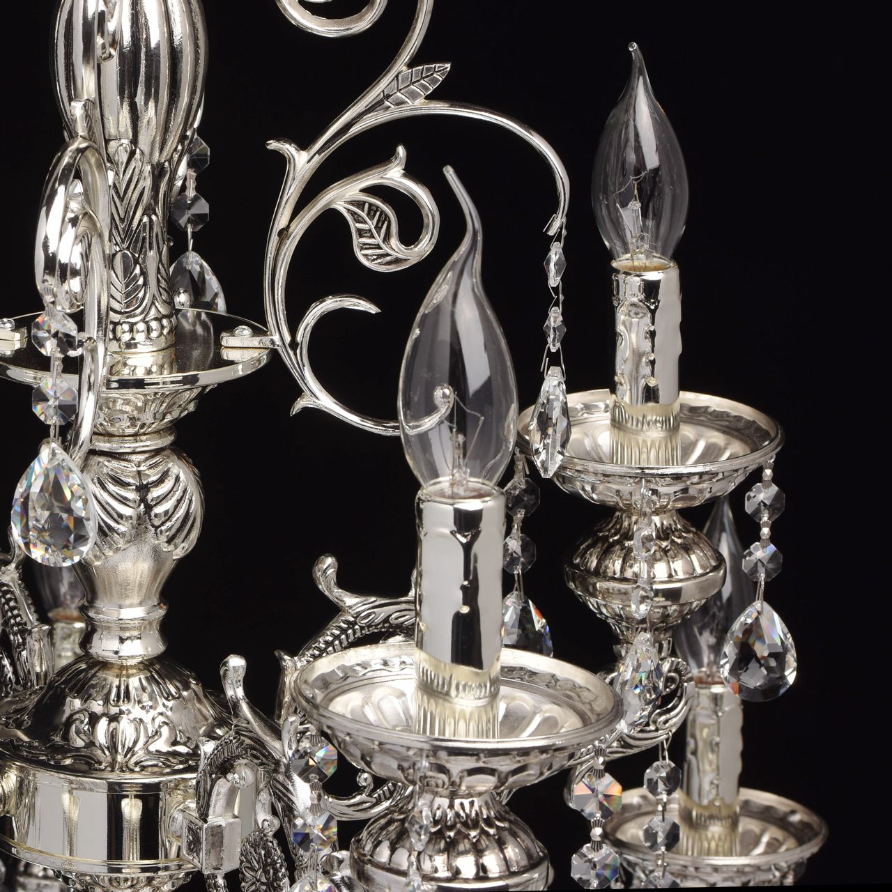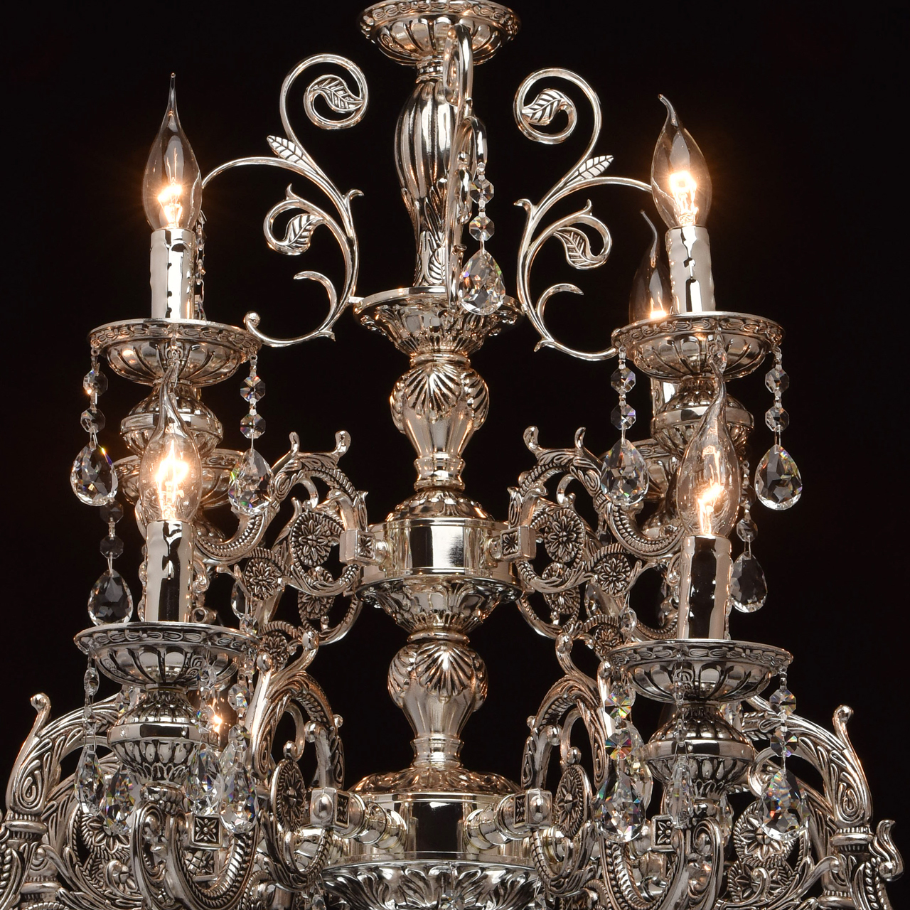 Помпезный стиль люстры из коллекции «Селена» не оставит равнодушным ценителей классических традиций в интерьере. Хромированное металлическое основание, дополненное эффектом патины цвета черненого серебра восхищает продуманным резным декором. Изящные узоры выгодно подчеркивают витиевато изогнутые рожки и объемные широкие розетки из металла. Декоративные элементы в растительной стилистике делают люстру по-настоящему очаровательной, но главная изюминка светильника – элегантные хрустальные подвесы. Их ослепительный блеск наполнит обстановку волшебной игрой света.Преимущества модели