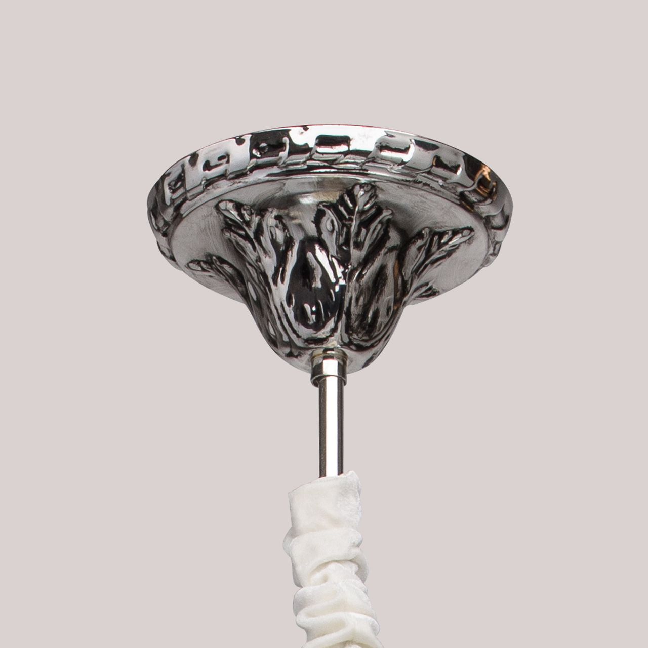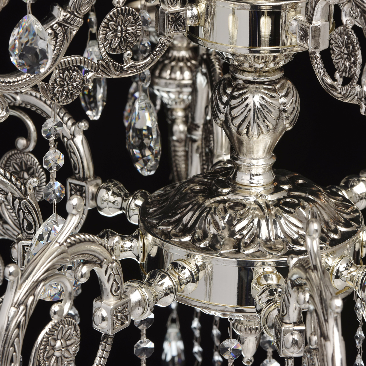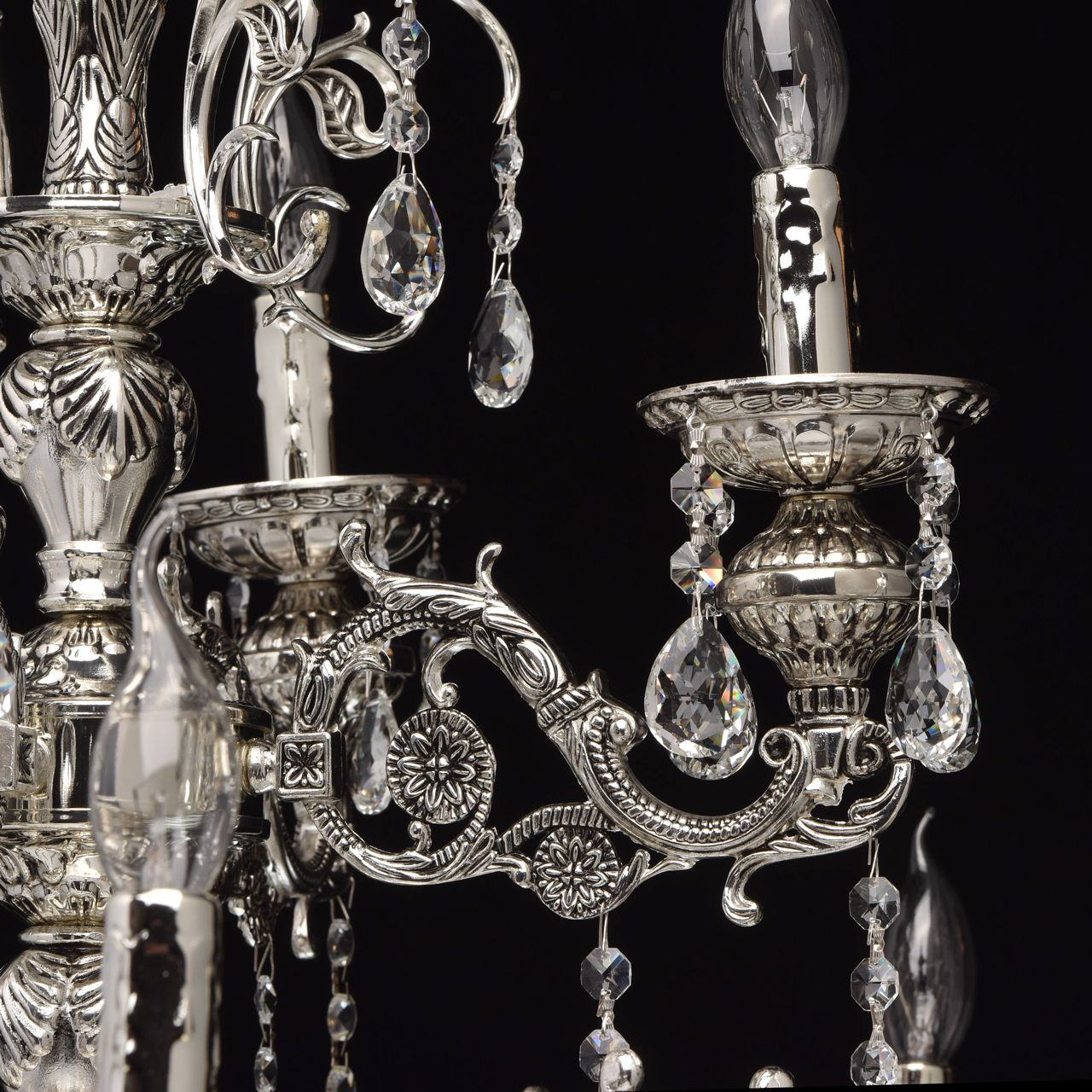 Арматура светильника выполнена из комбинации сплавов металлов, гальванизирована в цвет хрома и патинирована. Основание светильника, корпус и декоративный элемент под розеткой выполнены из стали. Рожки, элементы центральной оси, декоративные элементы, декоративные розетки выполнены из сплава алюминия по технологии художественного литья. Светильник декорирован подвесками из хрусталя формы октагон и миндаль.Тип помещения