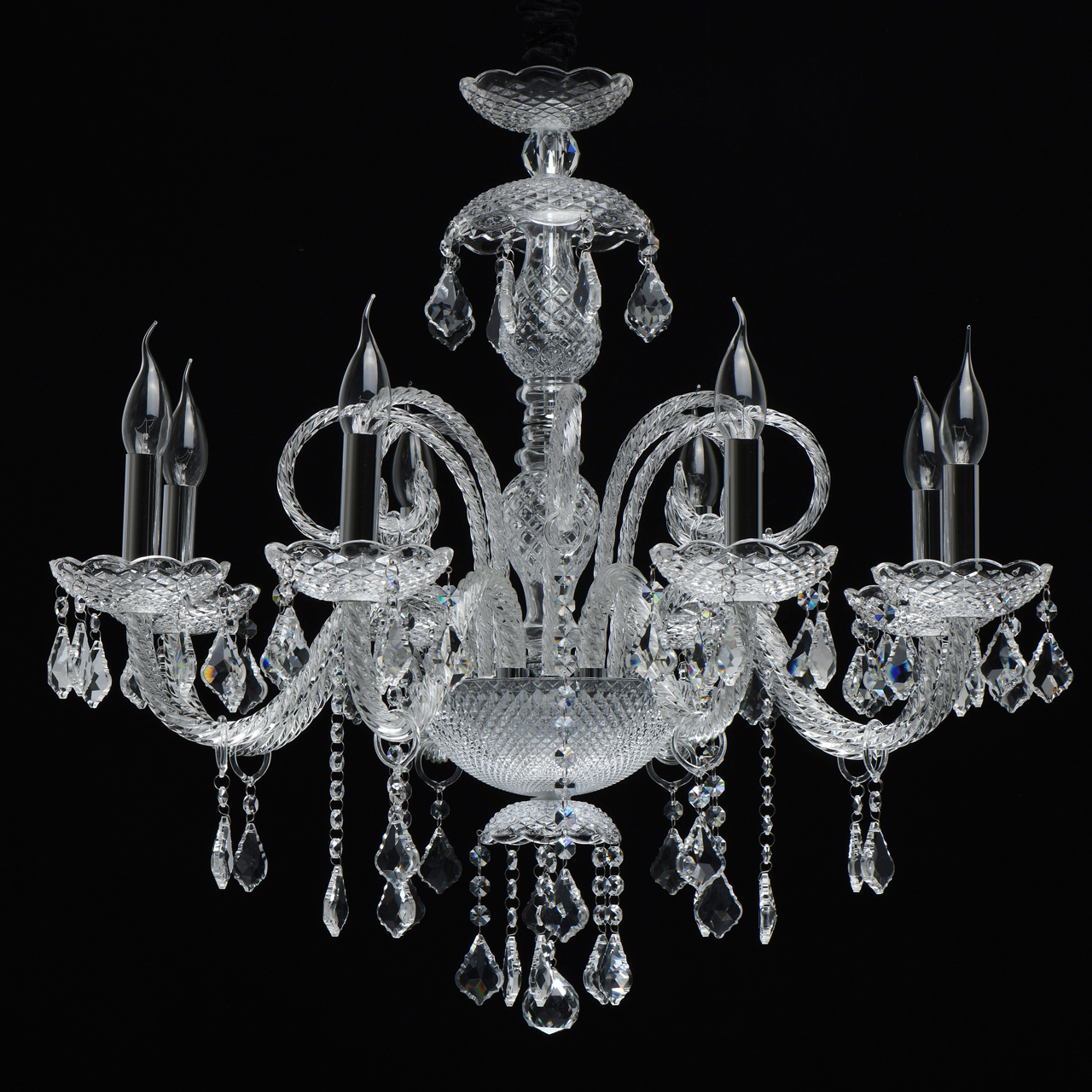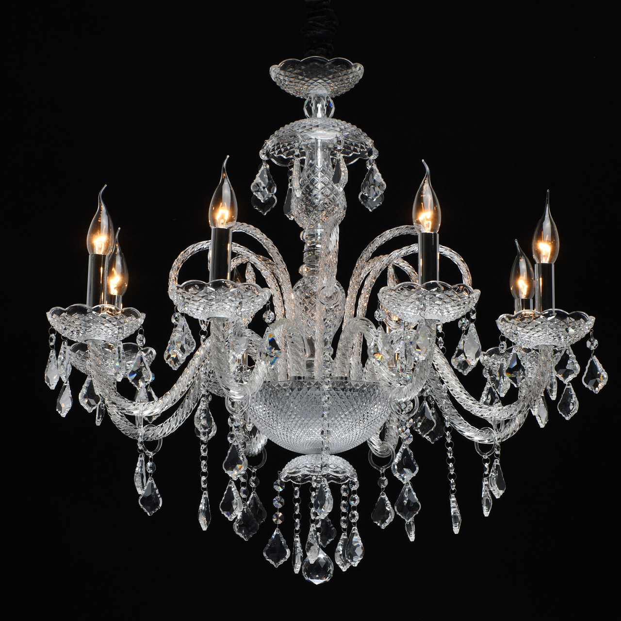 Классическая форма свечи для интерьеров в традиционном стиле. Основание из резного стекла украшает корпус и розетки светильника, выглядит как ручная работа. Хрустальный декор, подвески и цепочки из прозрачных октагонов создают игру света. Регулируемая высота подвеса за счет звеньев цепи.Стилевые решения интерьера