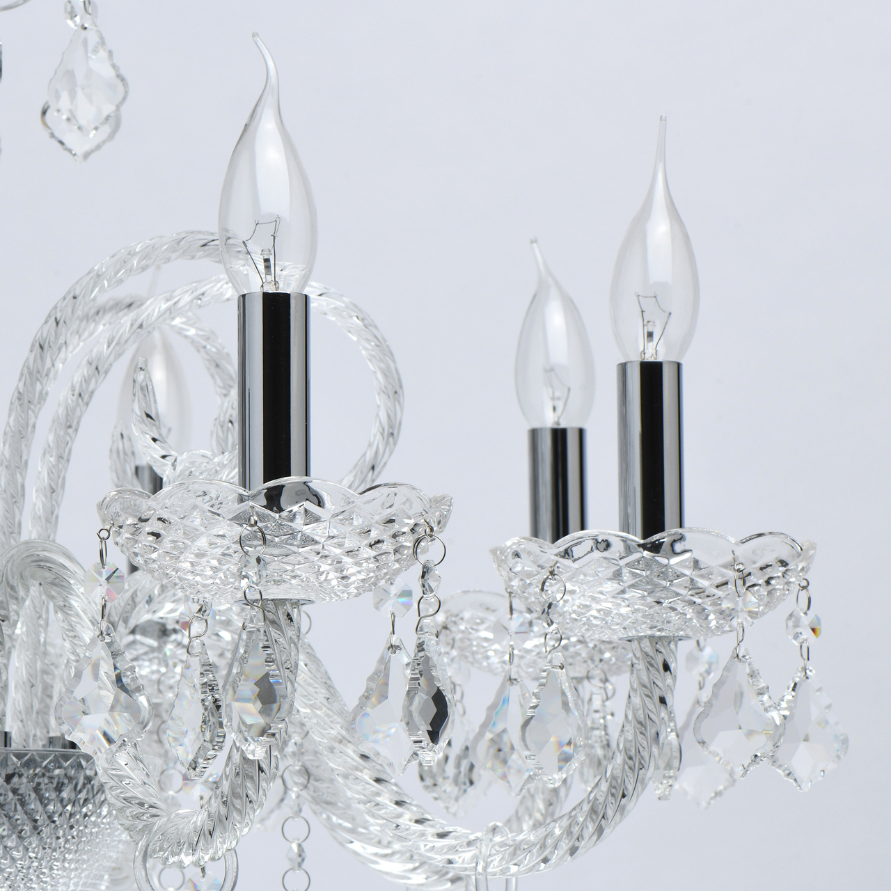 Основание светильника выполнено из металла и гальванизировано в цвет хрома. Рожки светильника выполнены из стекла гутным способом. Основание декорировано прозрачным стеклом, отлитым в сложную форму. Светильник декорирован прозрачным хрусталем формы октагон, шар и дубовый лист.Тип помещения