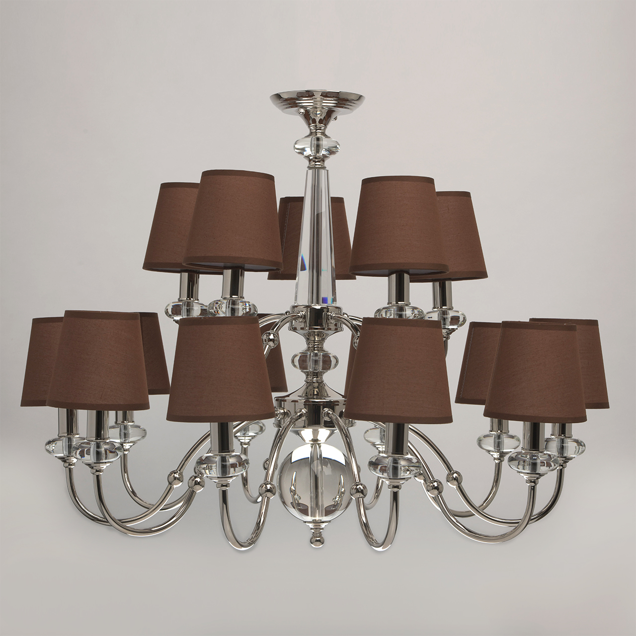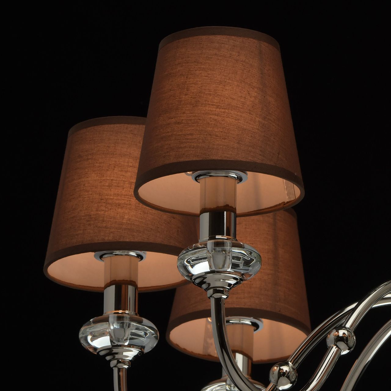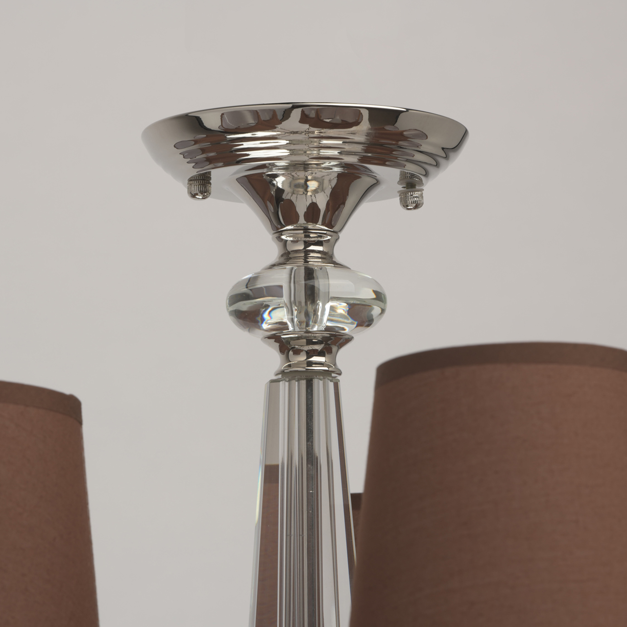 Металлическое основание гальванизировано в цвет хрома. Потолочная чаша, центральная декоративная розетка, декор на рожках изготовлены по технологии токарной обработки. Рожки изготовлены по технологии проката на роликовом станке. Декоративные розетки, декоративные элементы на центральном стержне выполнены из массива хрусталя. Абажуры выполнены из текстиля коричневого цвета с термостойким акрилом внутри. Абажуры прошиты.Тип помещения