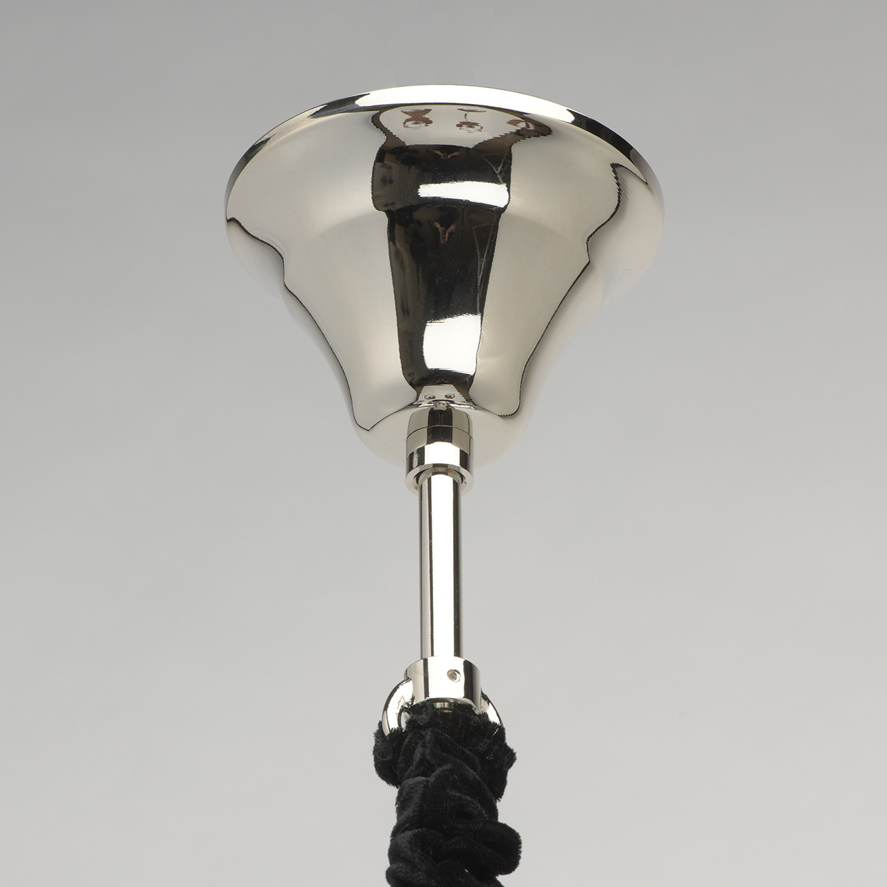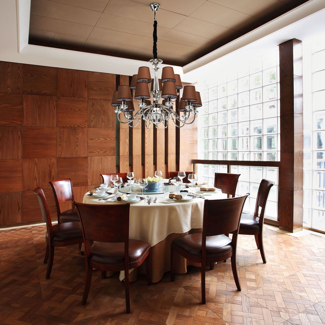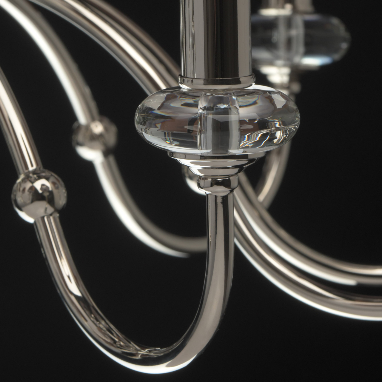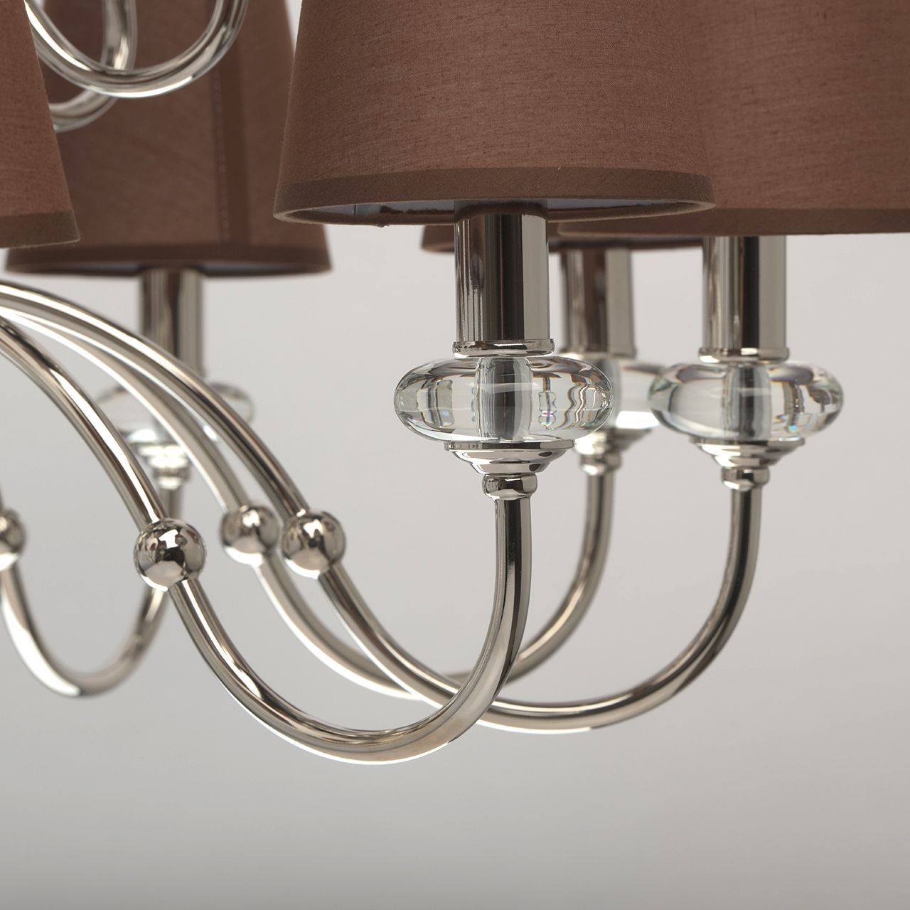 Металлическое основание гальванизировано в цвет хрома. Потолочная чаша, центральная декоративная розетка, декор на рожках изготовлены по технологии токарной обработки. Рожки изготовлены по технологии проката на роликовом станке. Декоративные розетки, декоративные элементы на центральном стержне выполнены из массива хрусталя. Абажуры выполнены из текстиля коричневого цвета с термостойким акрилом внутри. Абажуры прошиты.Тип помещения