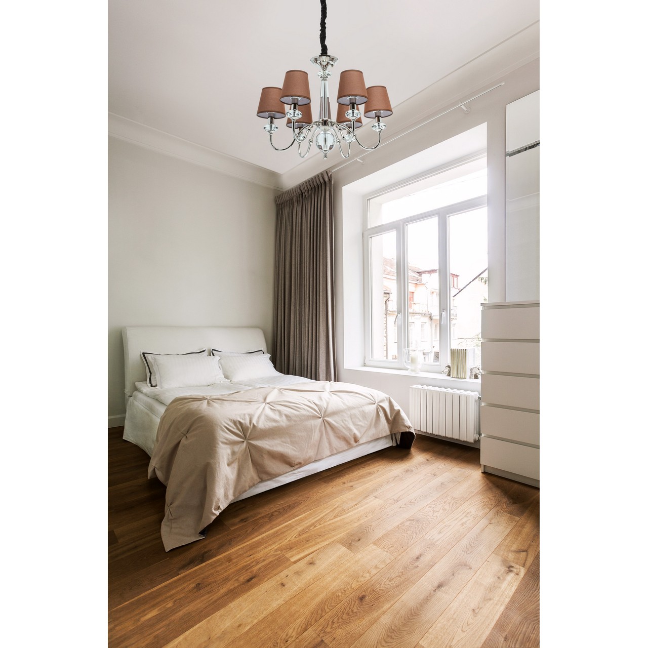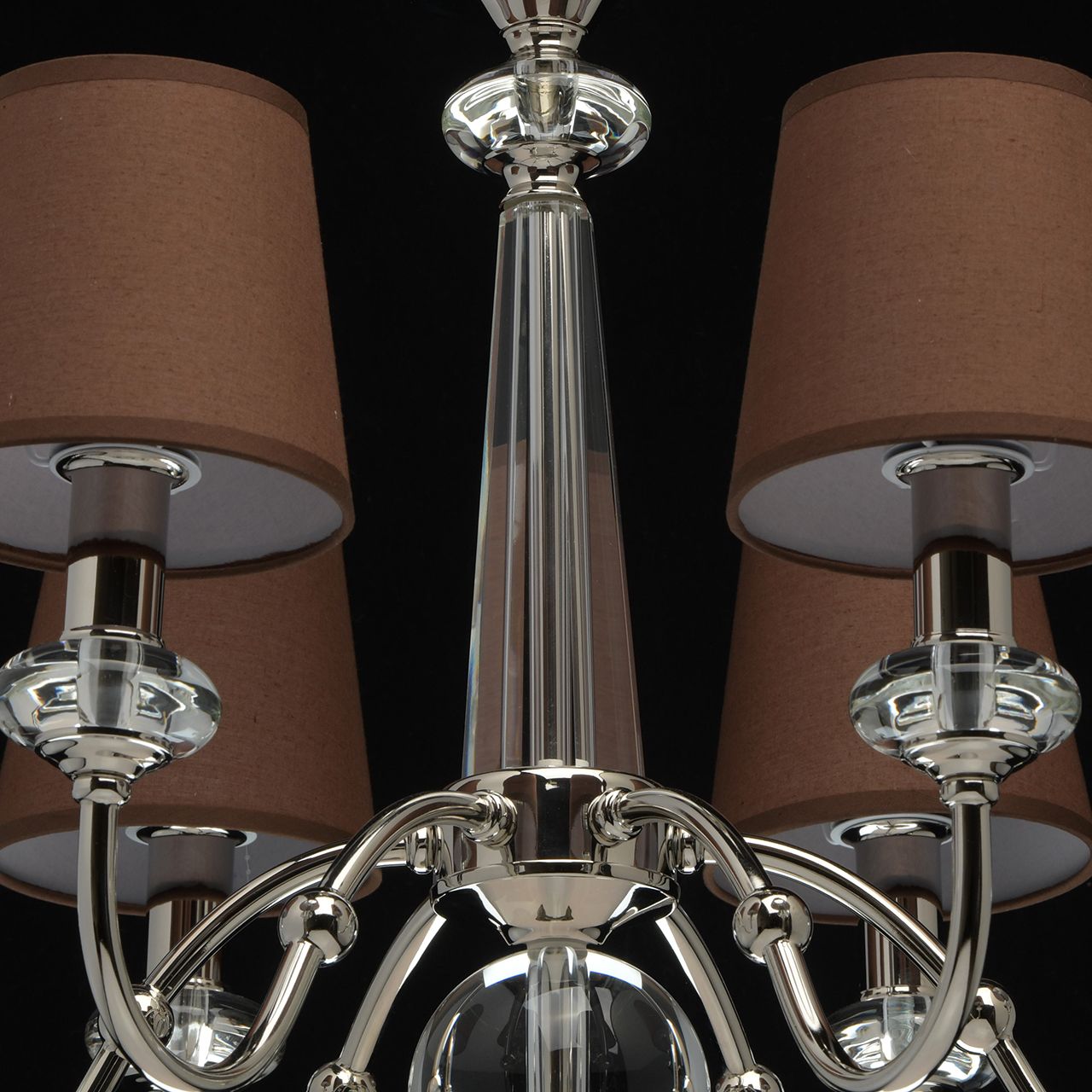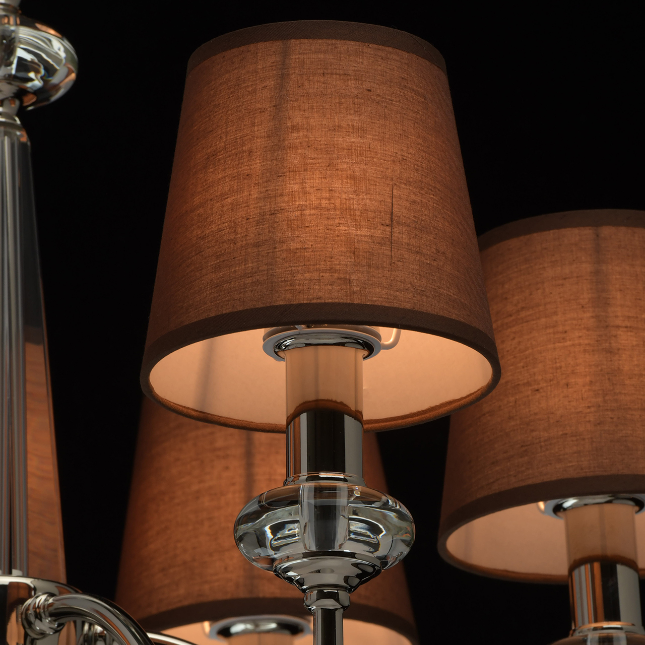 Металлическое основание гальванизировано в цвет хрома. Потолочная чаша, центральная декоративная розетка, декор на рожках изготовлены по технологии токарной обработки. Рожки изготовлены по технологии проката на роликовом станке. Декоративные розетки, декоративные элементы на центральном стержне выполнены из массива хрусталя. Абажуры выполнены из текстиля коричневого цвета с термостойким акрилом внутри. Абажуры прошиты.Тип помещения