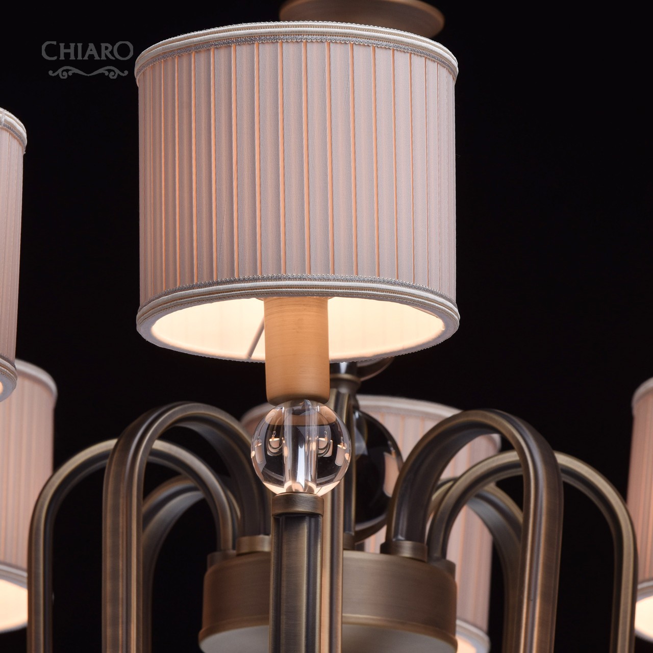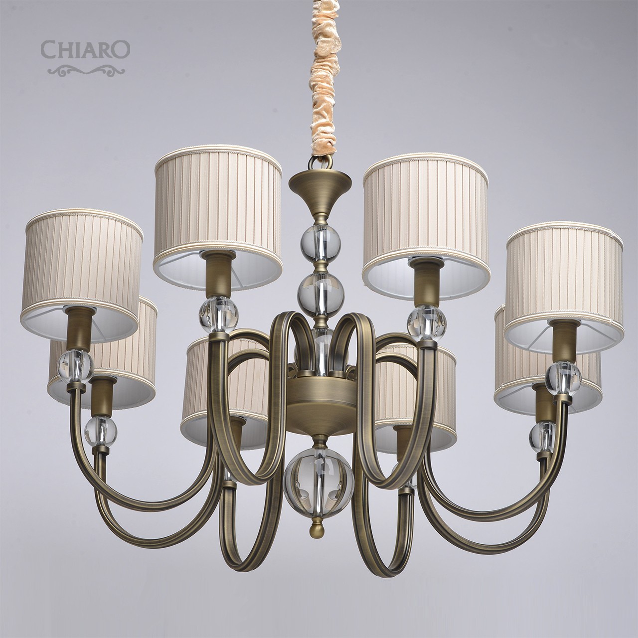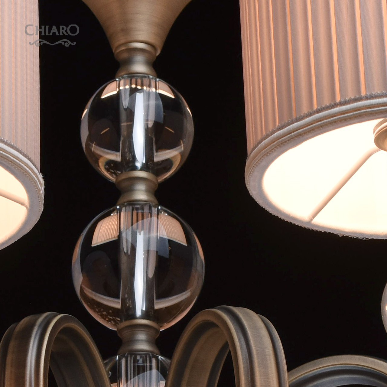Люстра из коллекции «София» привлекает сочетанием необычных деталей, приятной мягкой цветовой гаммой и множеством других достоинств. Основание сделано из металла, гальванизировано в цвет античной латуни с эффектом патины, что придает светильнику дополнительное благородство и делает его стилизованным под старину. Рожок рельефный, профилированный, интересной формы. Люстра декорирована крупными округлыми элементами из массива хрусталя у основания светильника. Помимо прозрачных хрустальных украшений, изюминкой люстры являются необычные гофрированные тканевые абажуры нежного оттенка кофе с молоком. Это изящный и изысканный предмет интерьера, призван подчеркнуть безупречный вкус владельца. Площадь освещения порядка 16 кв.м.Преимущества модели