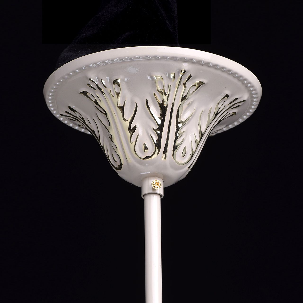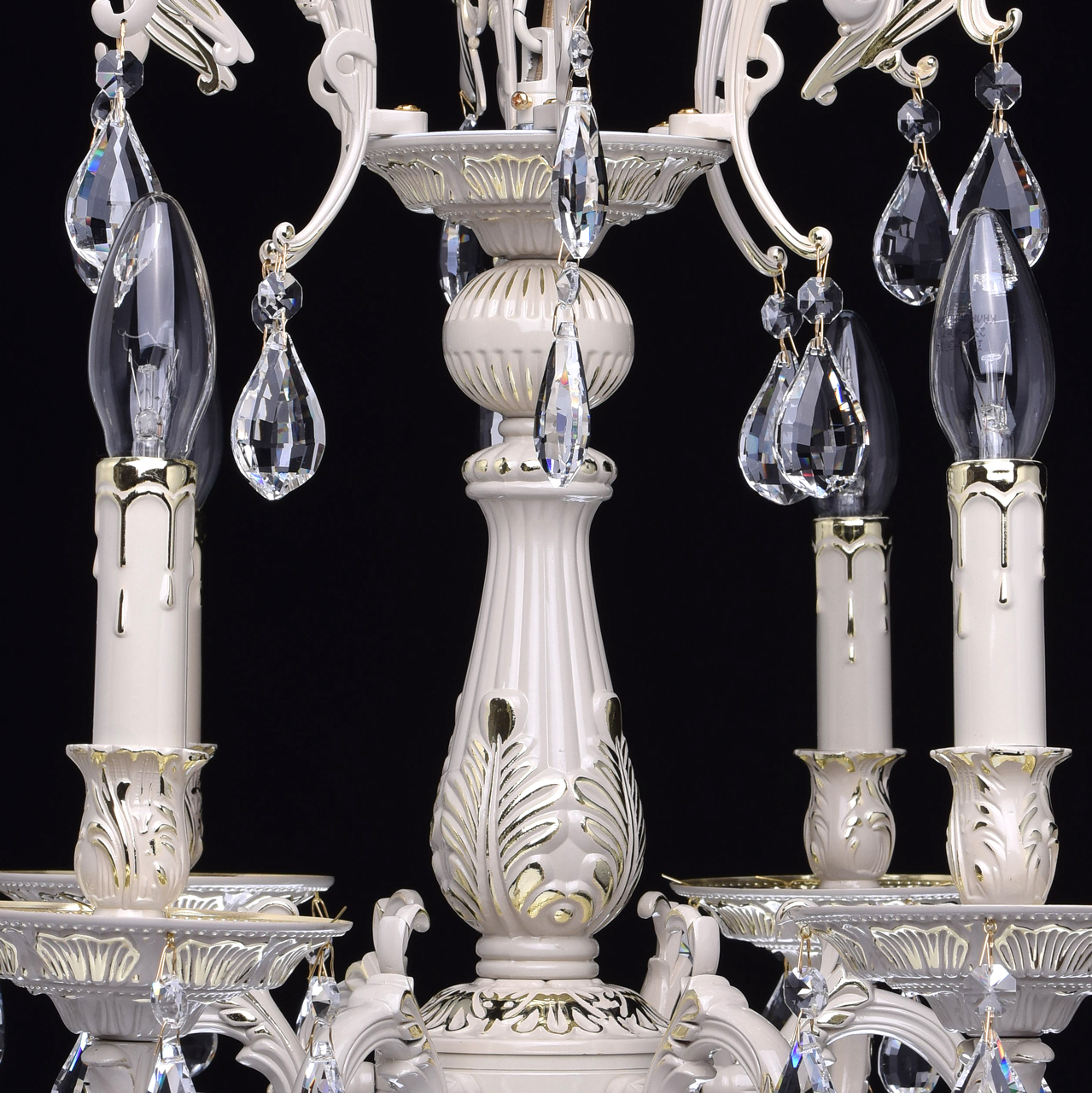Арматура светильника выполнена из комбинации сплавов металлов и обработана по сложной технологии: сначала гальванизирована, затем окрашена в цвет слоновой кости с фисташковым оттенком, далее выступающие части орнамента зачищены до гальванического покрытия. Основание светильника выполнено из сплава железа по технологии прессования. Рожки, центральная ось, декоративные элементы и декоративные розетки выполнены из сплава алюминия с цинком по технологии художественного литья в кокиль под давлением. Светильник декорирован подвесками из хрусталя категории "a-grade" сложной огранкиТип помещения