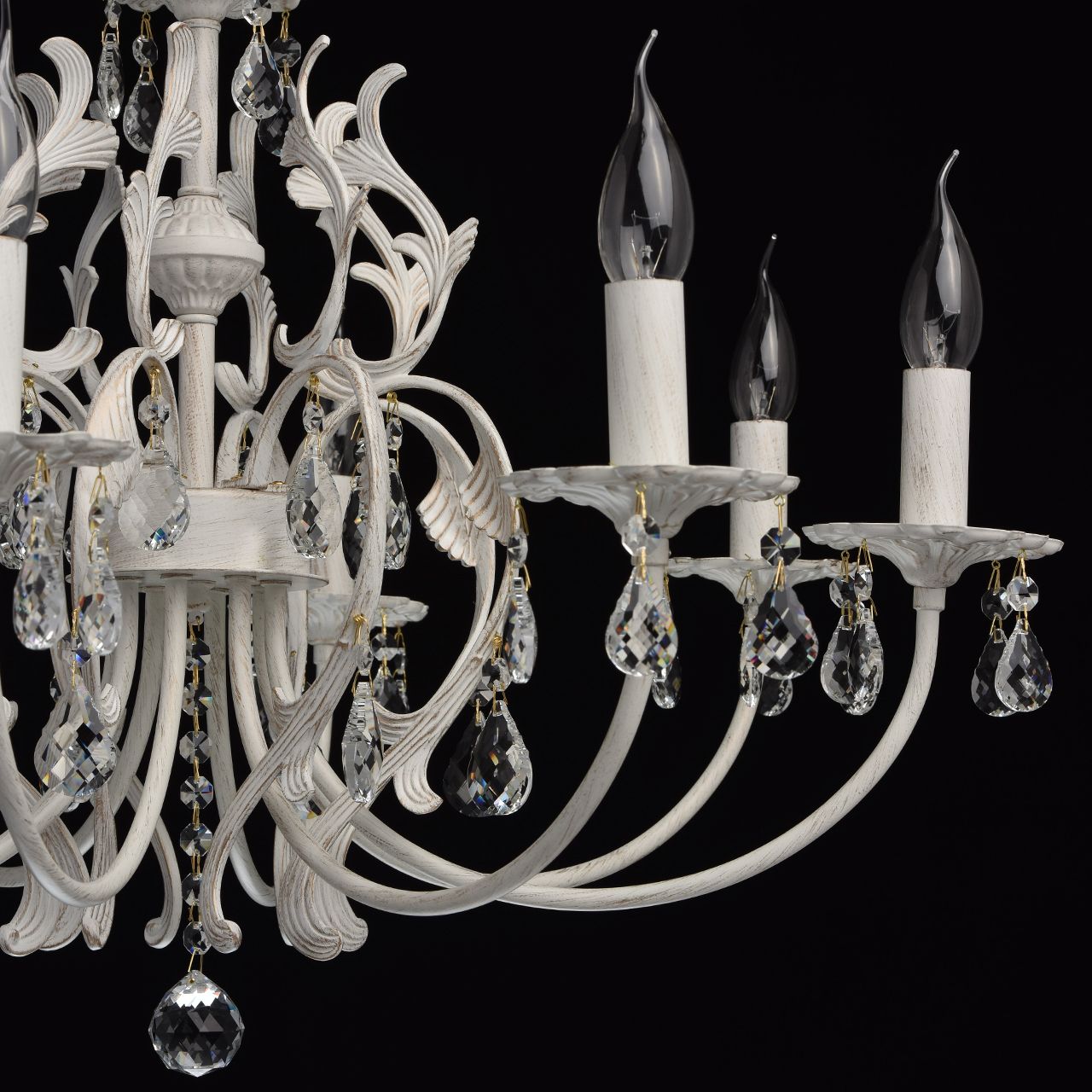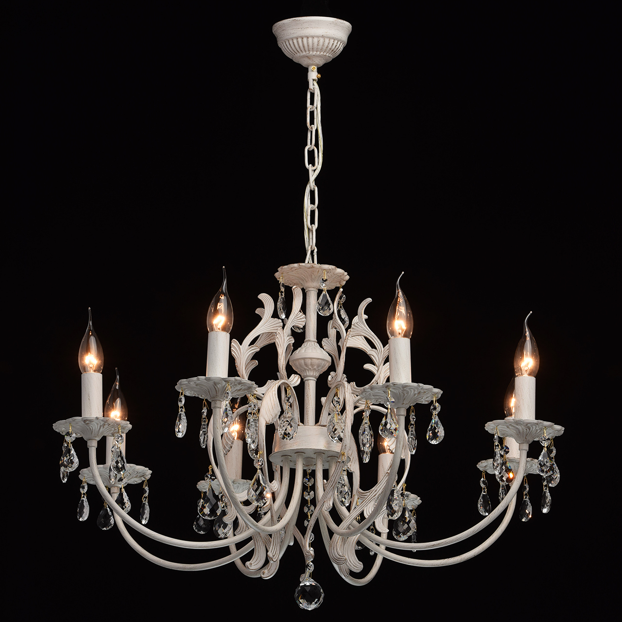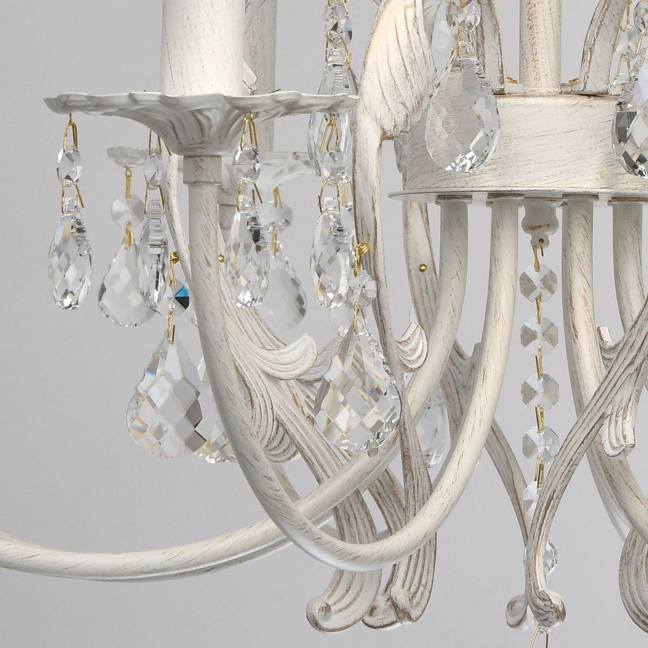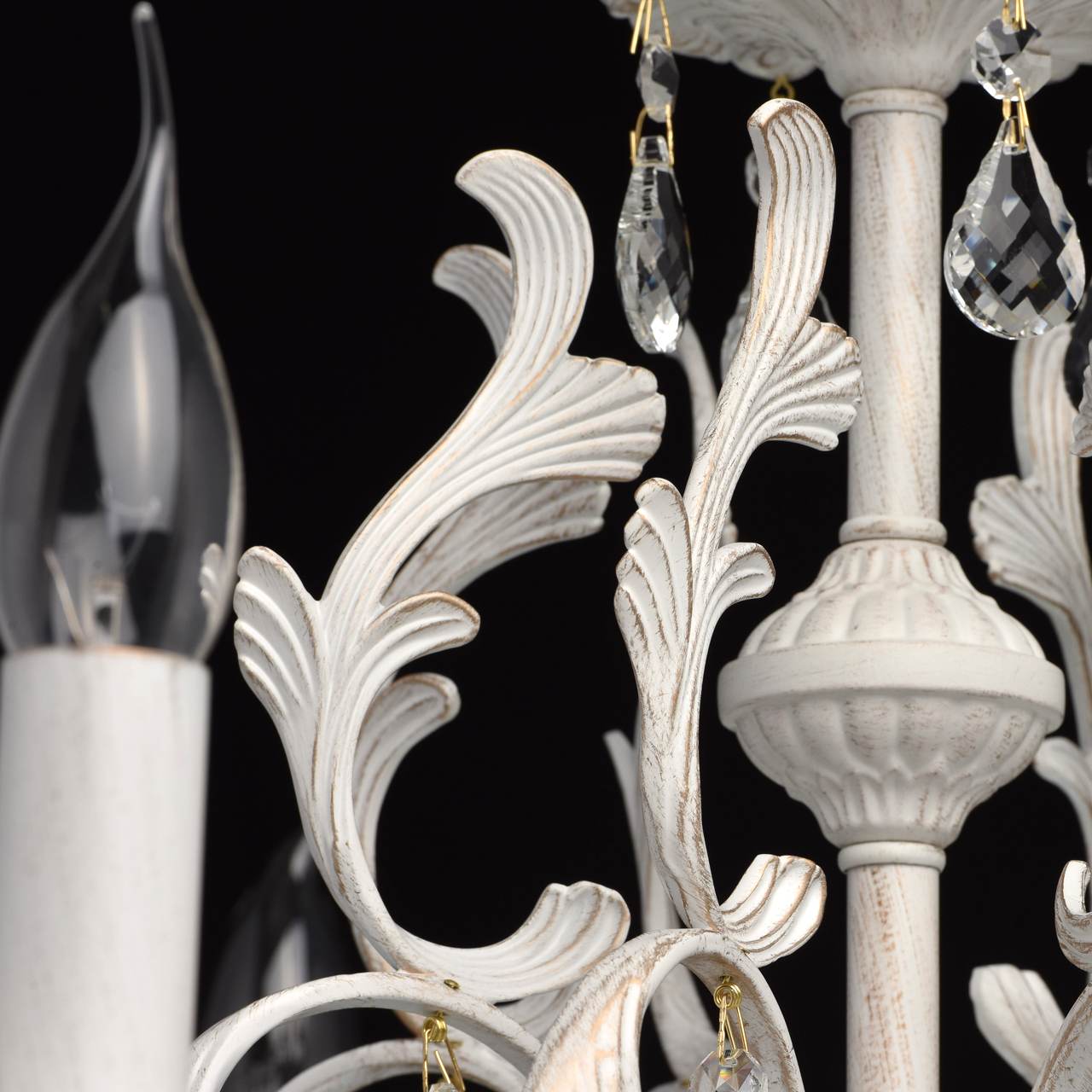 Роскошный дизайн в классическом стиле Классическая форма плафонов-свечей имеет высокие параметры освещения – идеально для больших помещений Хрустальные подвески создают волшебную игру света Премиальный светильник по привлекательной цене Благородный белый цвет с эффектом патинирования цвета золота позволяет люстре встроиться в интерьеры выполненные в любой цветовой гамме. 2 варианта по количеству рожков дают возможность осветить смежные помещения в одном стидеСтилевые решения интерьера
