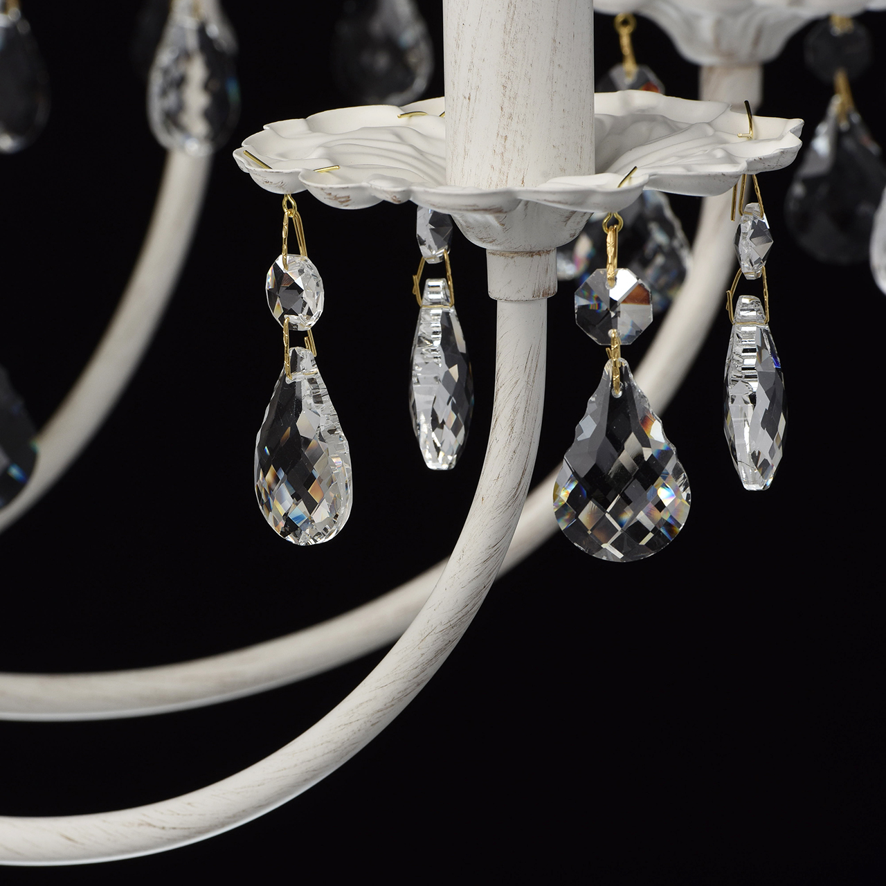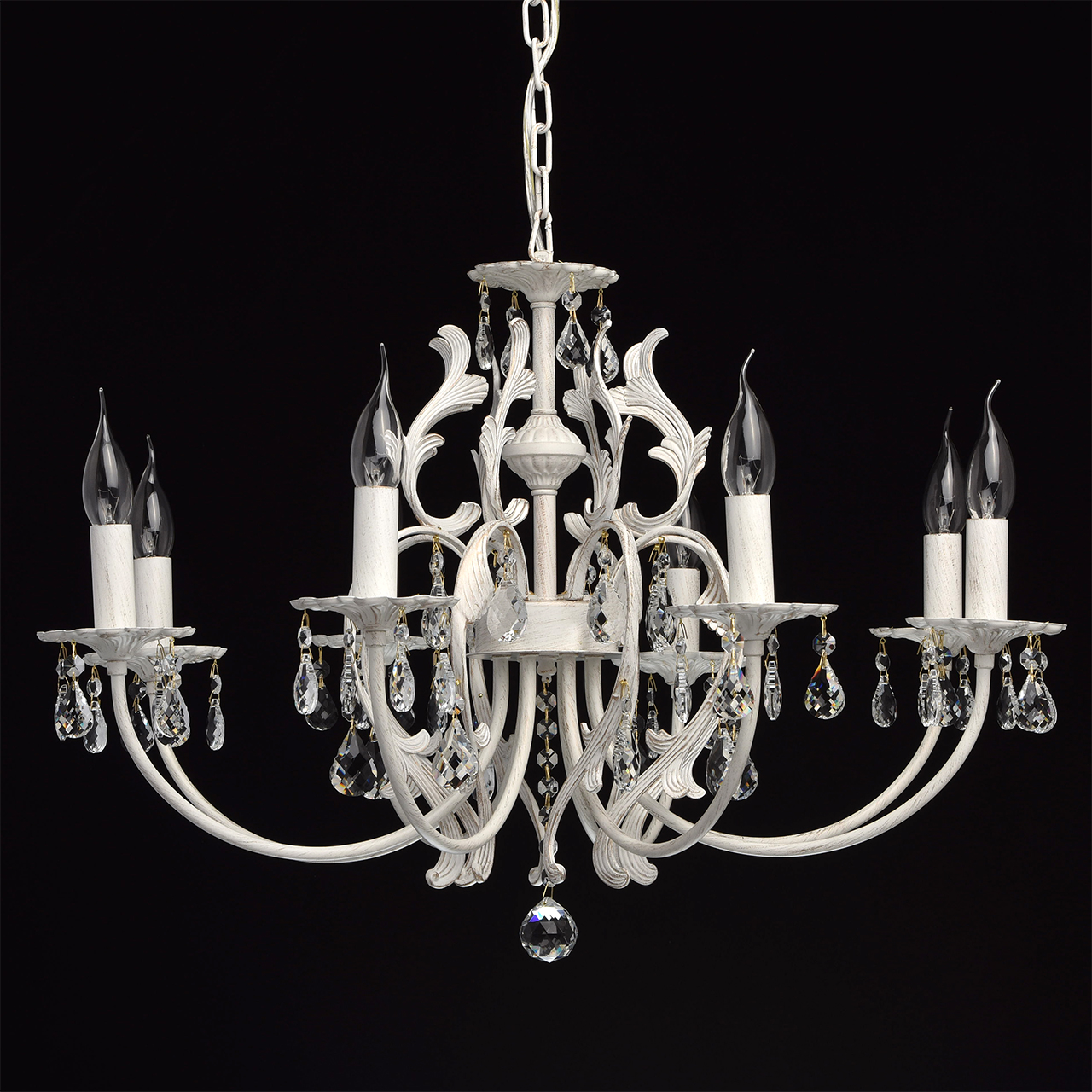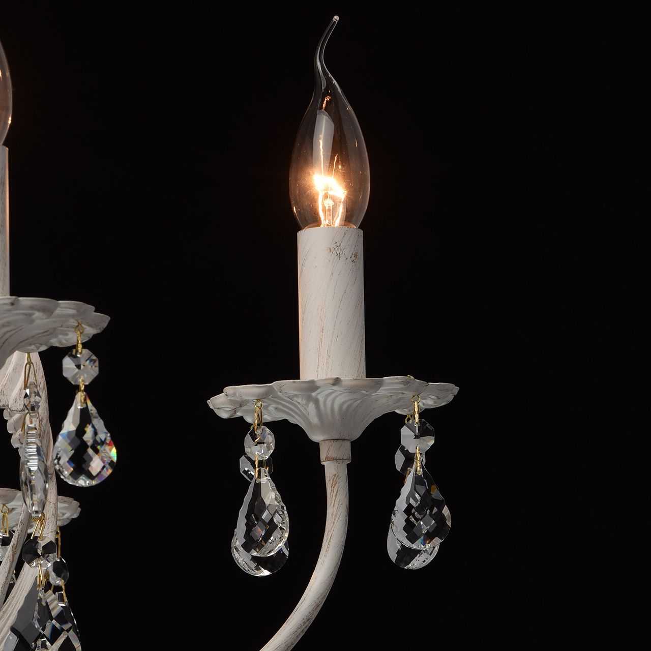 Роскошный дизайн в классическом стиле Классическая форма плафонов-свечей имеет высокие параметры освещения – идеально для больших помещений Хрустальные подвески создают волшебную игру света Премиальный светильник по привлекательной цене Благородный белый цвет с эффектом патинирования цвета золота позволяет люстре встроиться в интерьеры выполненные в любой цветовой гамме. 2 варианта по количеству рожков дают возможность осветить смежные помещения в одном стидеСтилевые решения интерьера