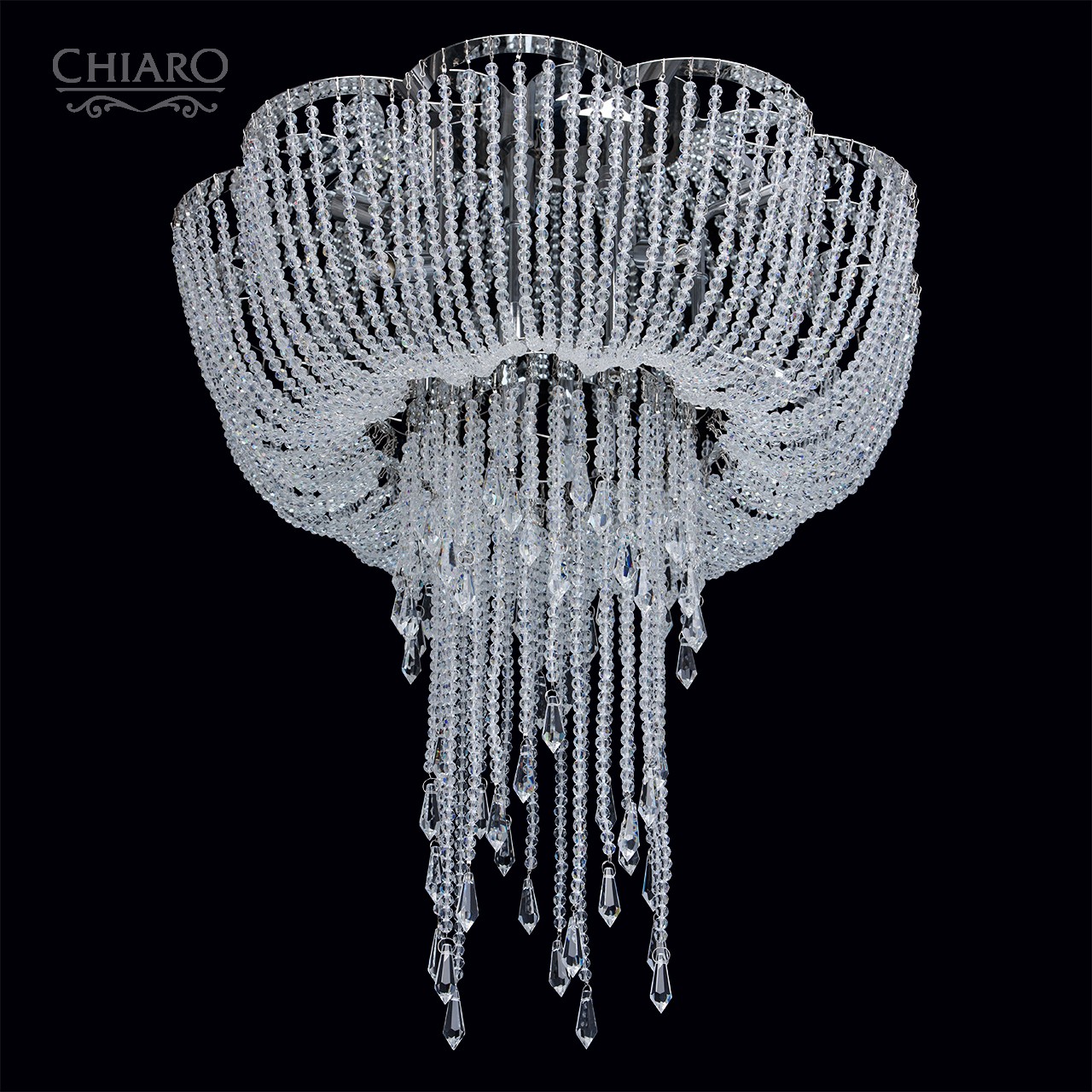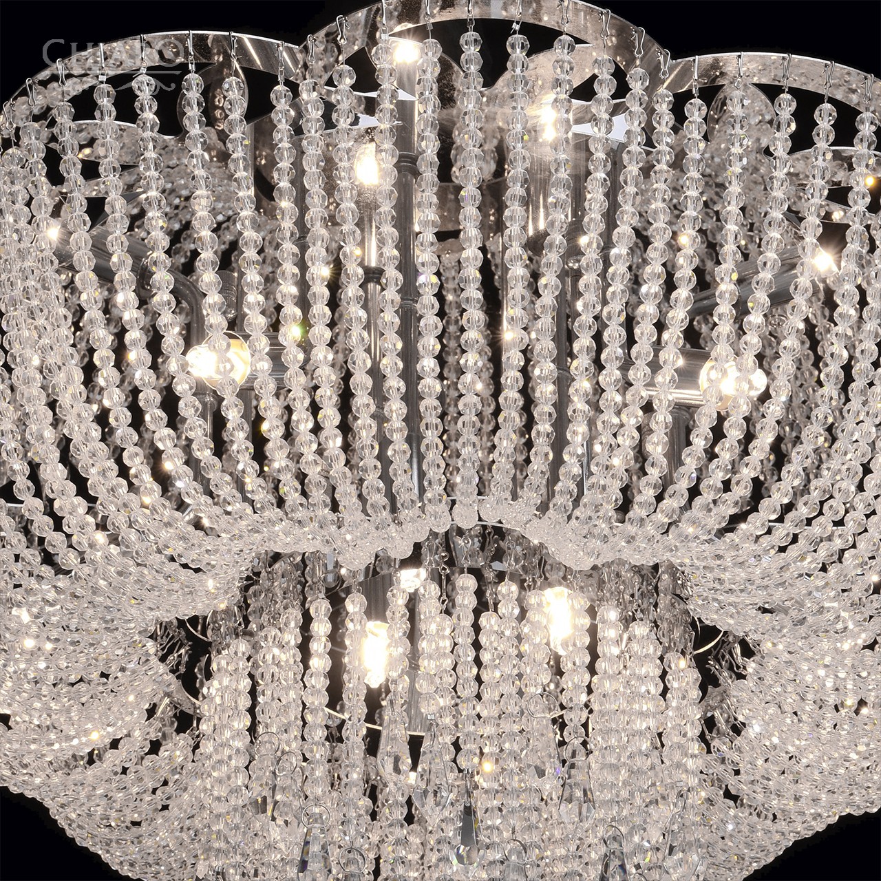 Можно бесконечно смотреть, как переливается свет в хрустальных гранях у светильника Сюзанна из стиля Кристал. Великолепная люстра предназначена для такого интерьера, где роскошь и красота сплетаются в едином ансамбле стиля, где присутствуют классические элементы оформления пространства или предметы из французских стилей барокко и рококо. Металлическая хромированная арматура представлена в форме собранного к низу балдахина, на нити которого нанизаны хрустальные бусины. Красиво скомпонованные блистающие подвески с каплевидными хрусталиками элегантно ниспадают из центра светильника. Благодаря оригинальной форме и качественному хрустальному богатству этот шедевр превращается в благородную драгоценность интерьера!Преимущества модели