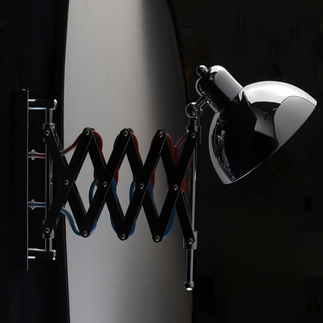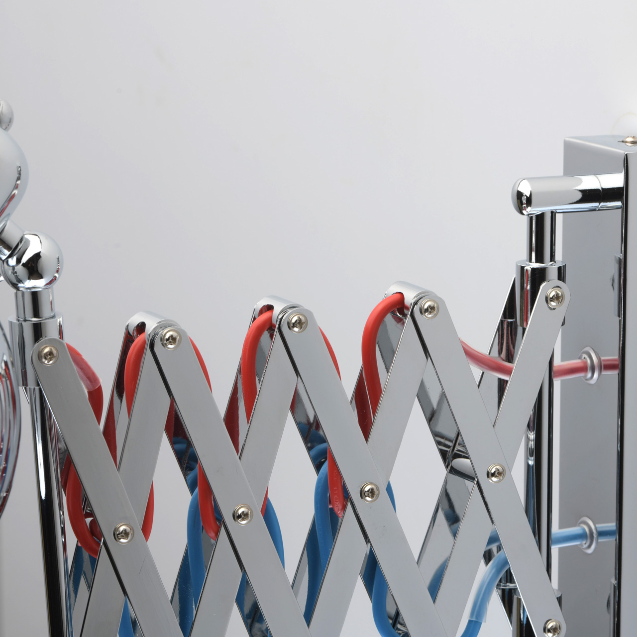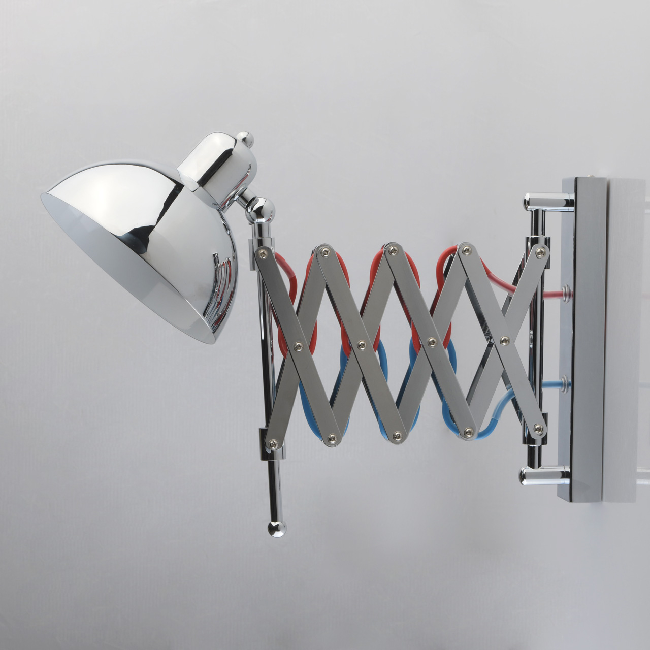 Основание выполнено из сплава металла и гальванизировано в цвет хрома. Плафон изготовлен по технологии обработки на токарном станке, гальванизирован в цвет хрома. Внутренняя поверхность плафона окрашена в белый цвет. Светильник оснащен регулируемой штангой. По штанге пропущен провод красного и синего цветов.Тип помещения