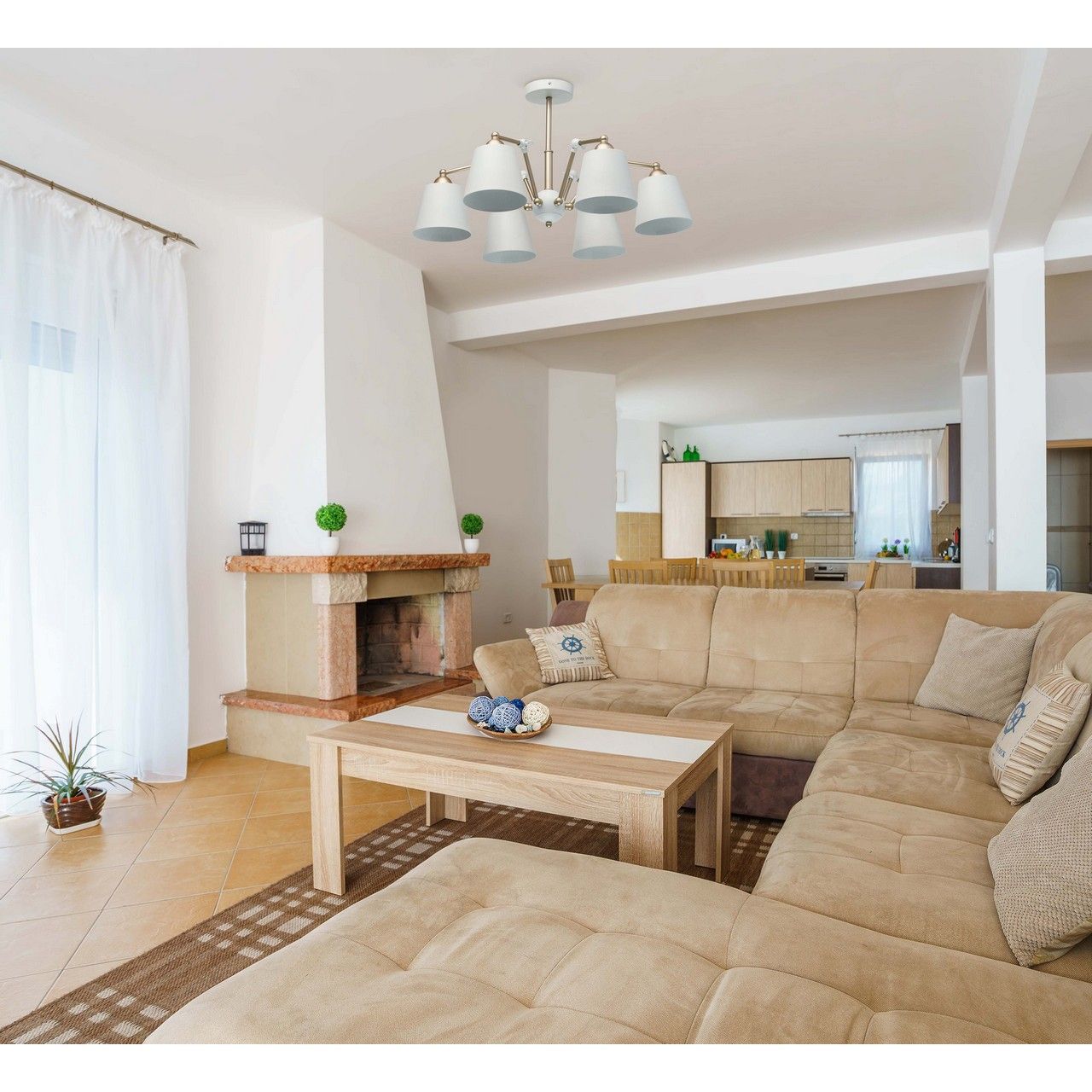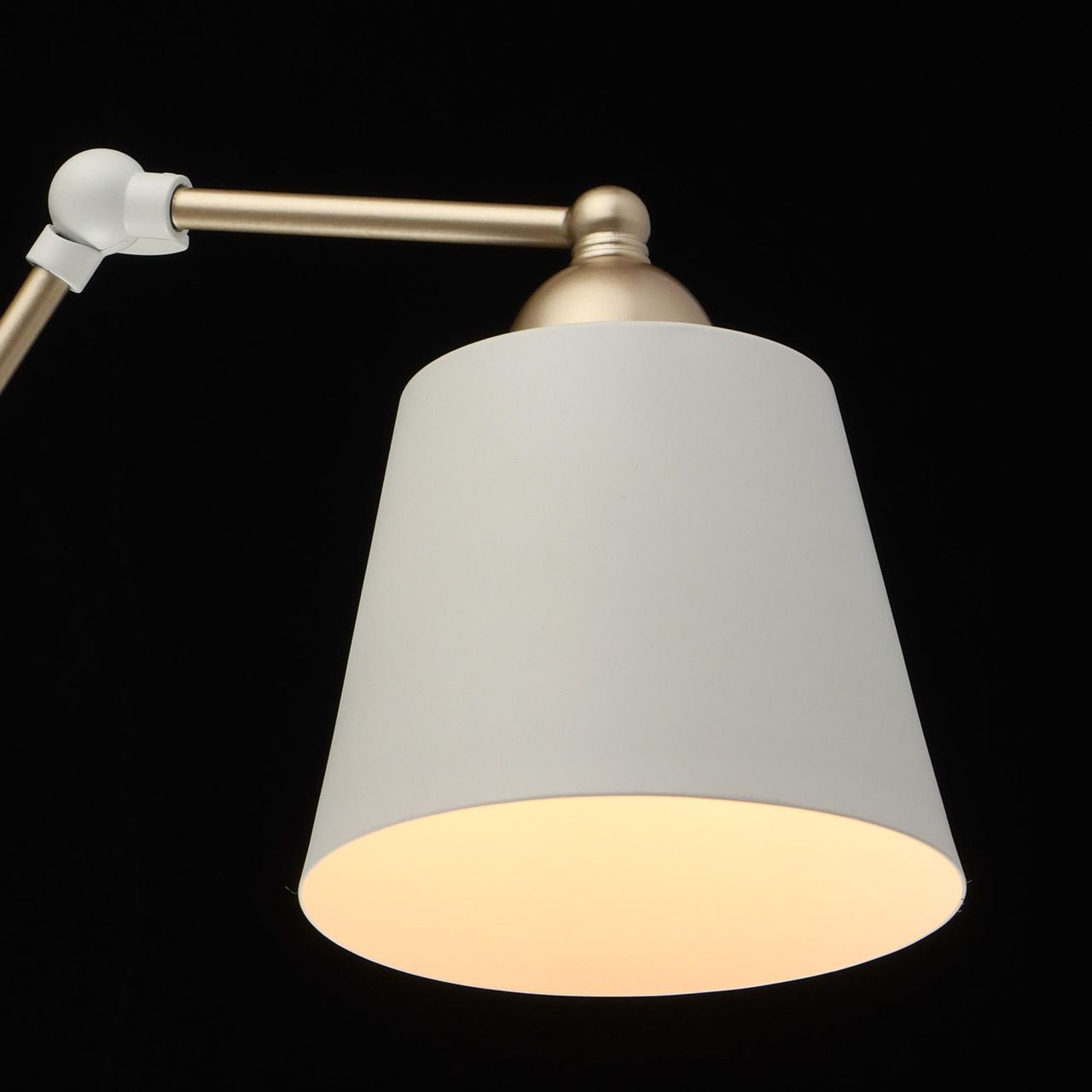 Основание светильника выполнено из металла и окрашено в белый и золотой цвет. Потолочная чаша, корпус: обработка на токарном станке. Рожки: оснащены фиксаторами с возможностью поворота. Плафоны: металл, внутренняя часть окрашена в белый глянцевый цвет.Тип помещения