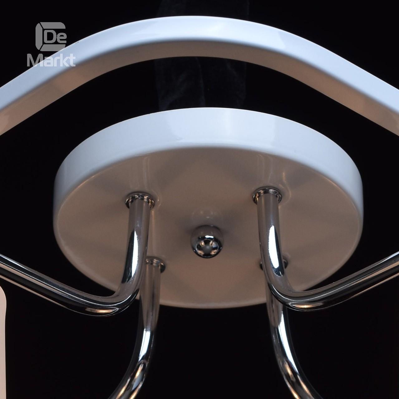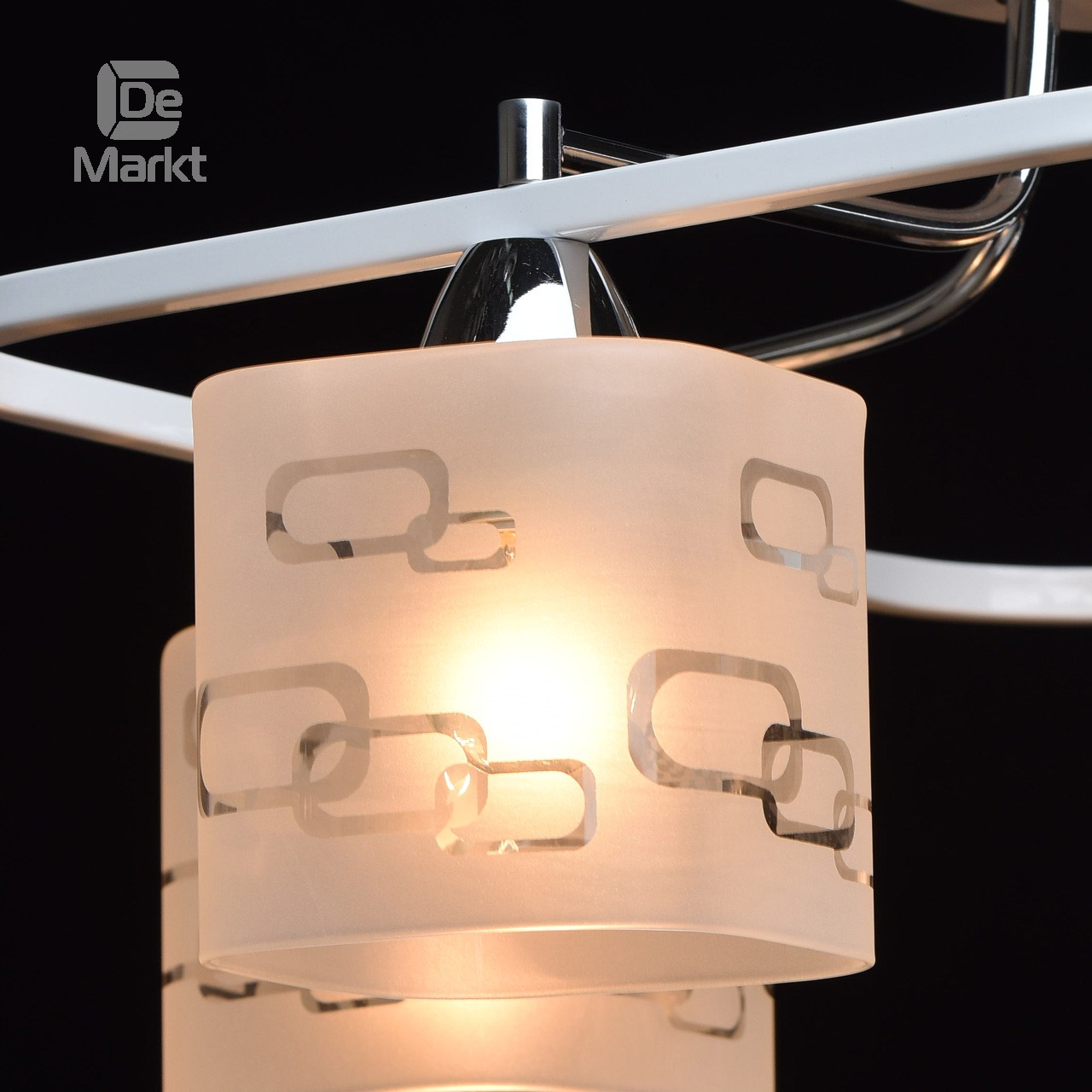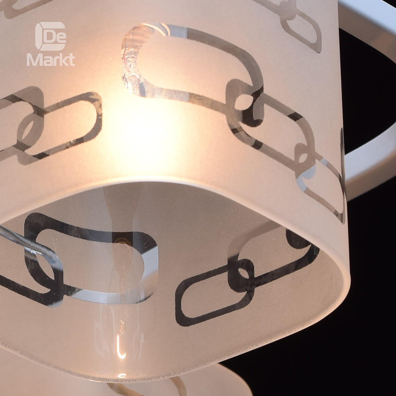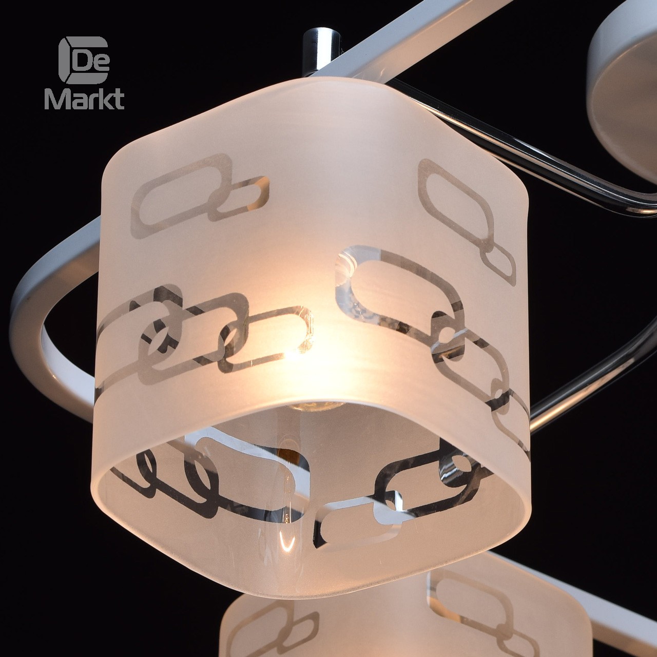 Арматура светильника выполнена из сплава железа. Рожки гальванизированы в цвет хрома. Основание и декоративный квадратный элемент окрашены в белый глянцевый цвет. Светильник декорирован стеклянными плафонами, обработанными по технологии пескоструйного матирования по шаблону. Края плафонов обработаны по технологии оплавления.Тип помещения