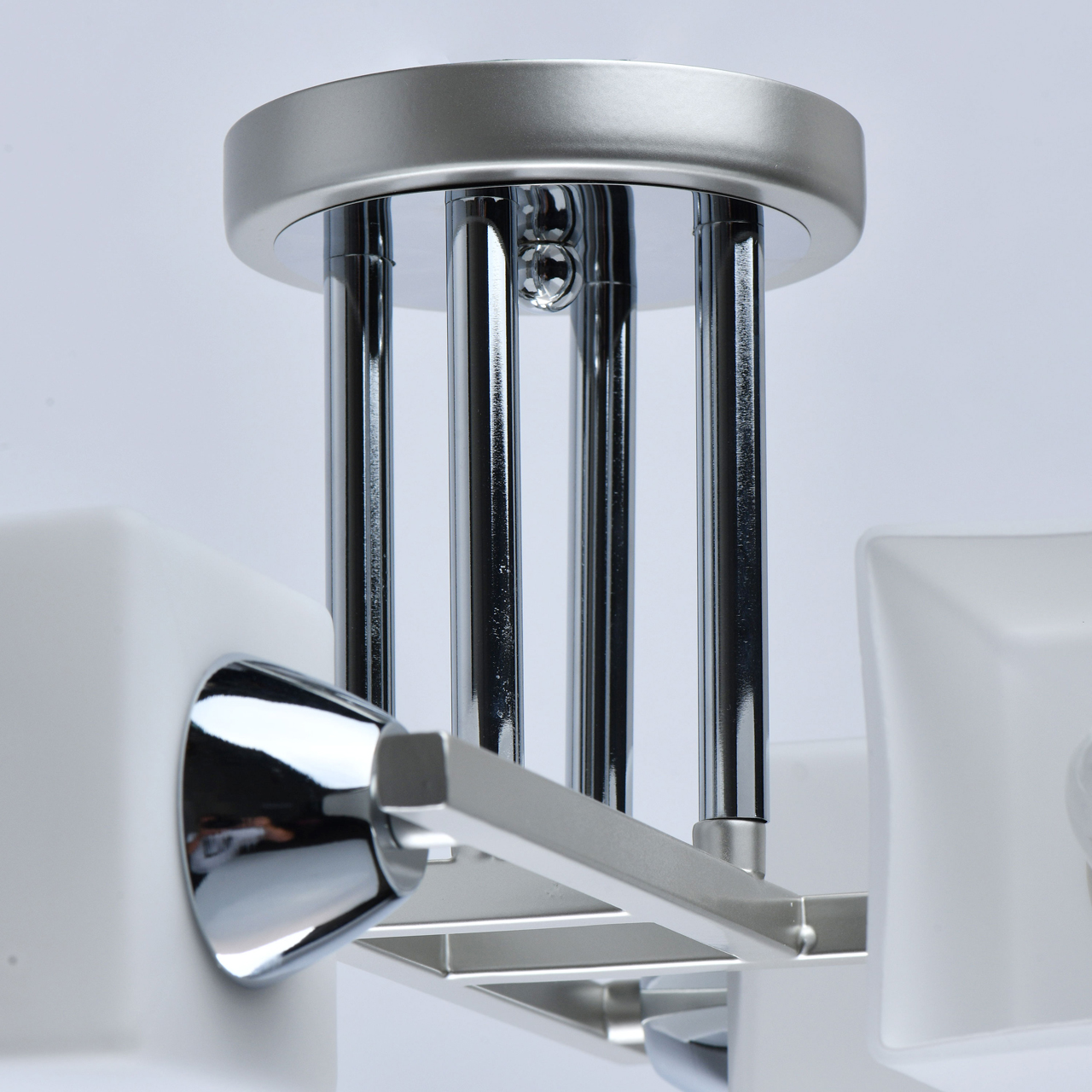 Геометрические формы конструкции поддержаны кубической формой плафонов Актуальная комбинация металлов цвета перламутрового серебра и глянцевого хрома Компактная высота модели идеальна для стандартной высоты потолка. Плафоны матового белого стекла создают мягкое освещениеСтилевые решения интерьера