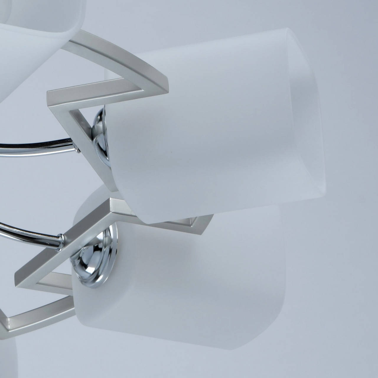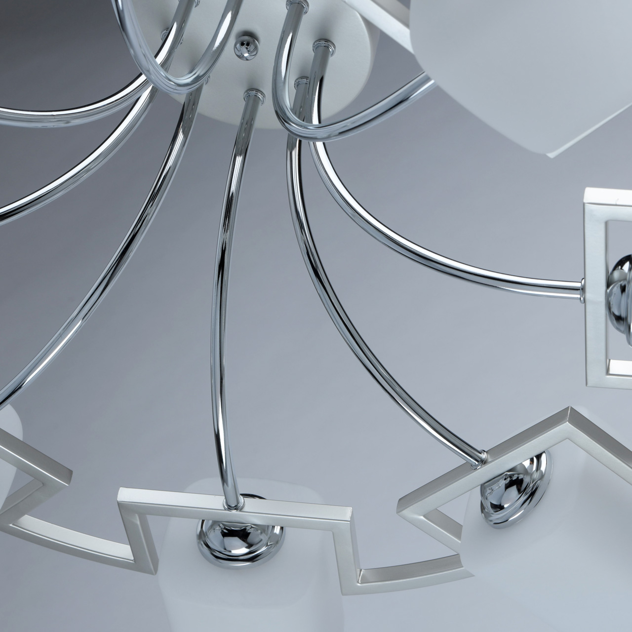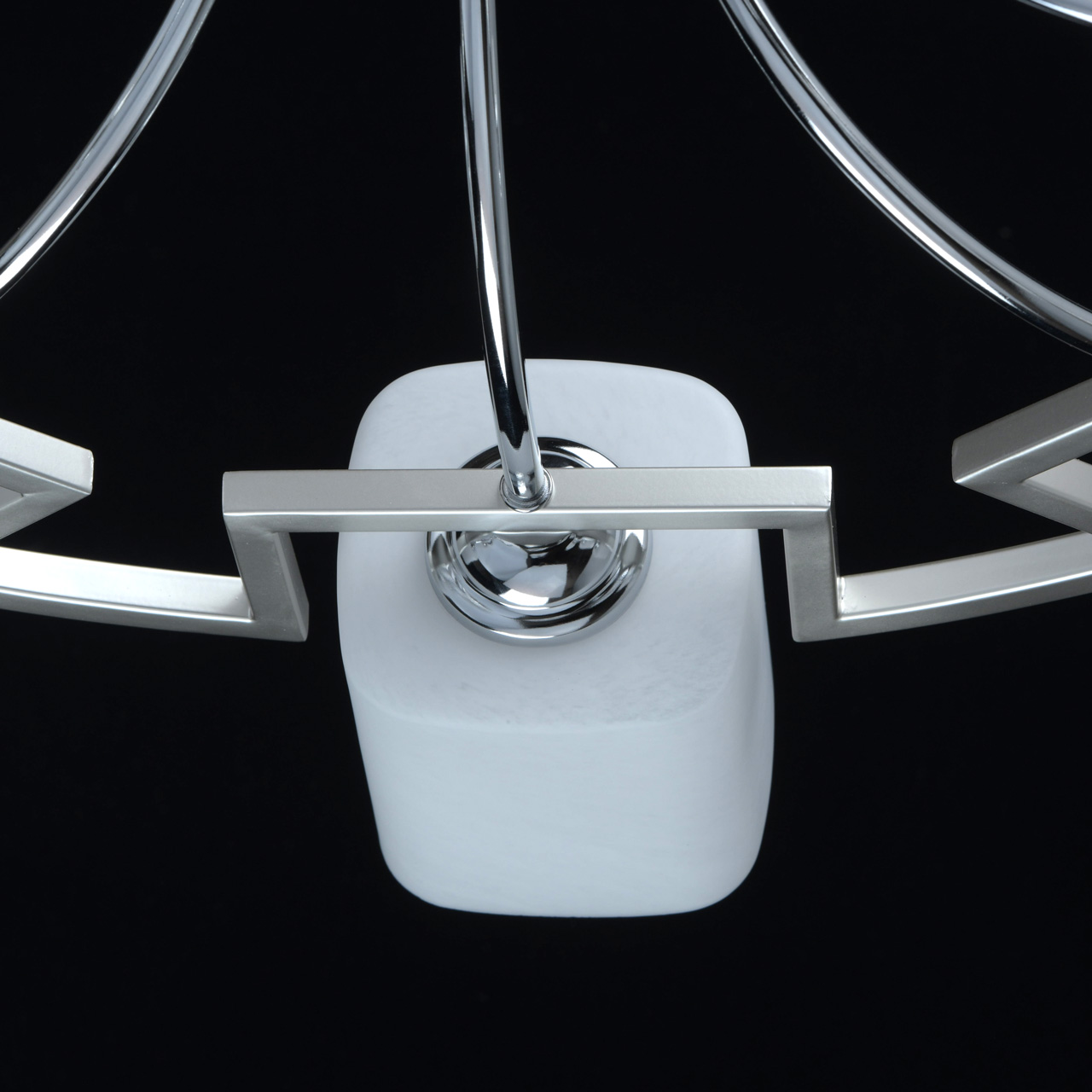 Основание светильника выполнено из металла. Рожки гальванизированы в цвет хрома. Держатели плафонов и потолочная чаша окрашены в цвет серебра. Светильник декорирован плафонами из алебастрового стекла, отлитыми в форму. Плафоны матированы.Тип помещения
