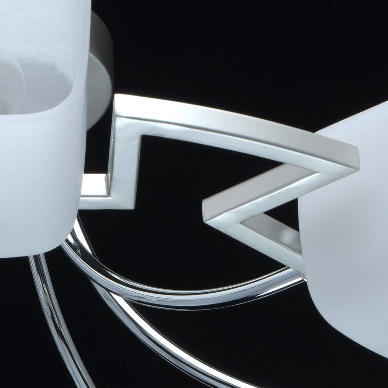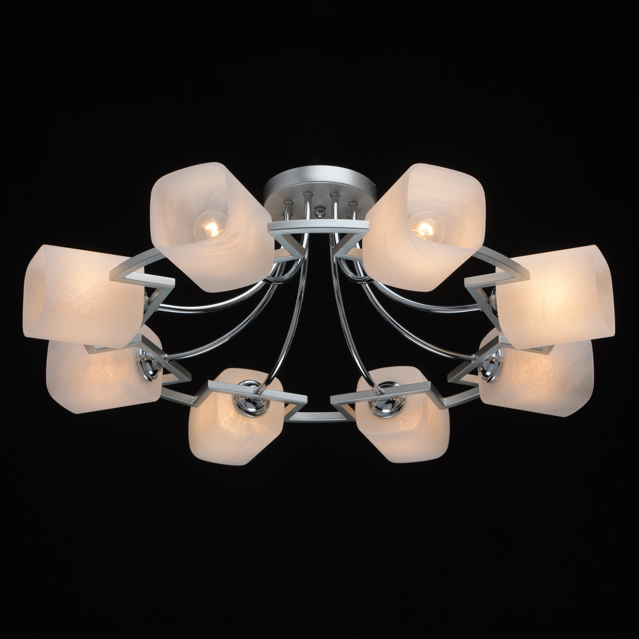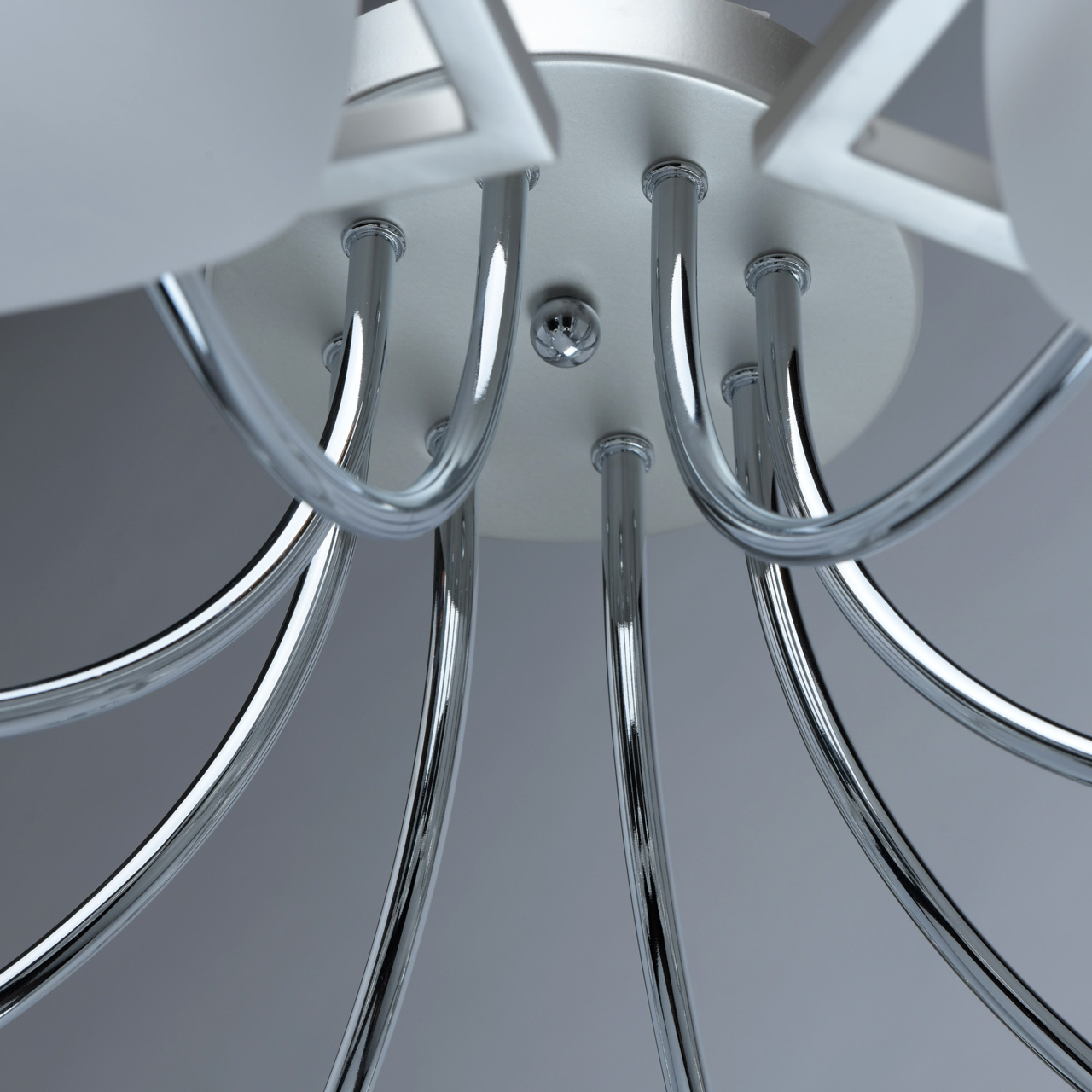 Основание светильника выполнено из металла. Рожки гальванизированы в цвет хрома. Держатели плафонов и потолочная чаша окрашены в цвет серебра. Светильник декорирован плафонами из алебастрового стекла, отлитыми в форму. Плафоны матированы.Тип помещения