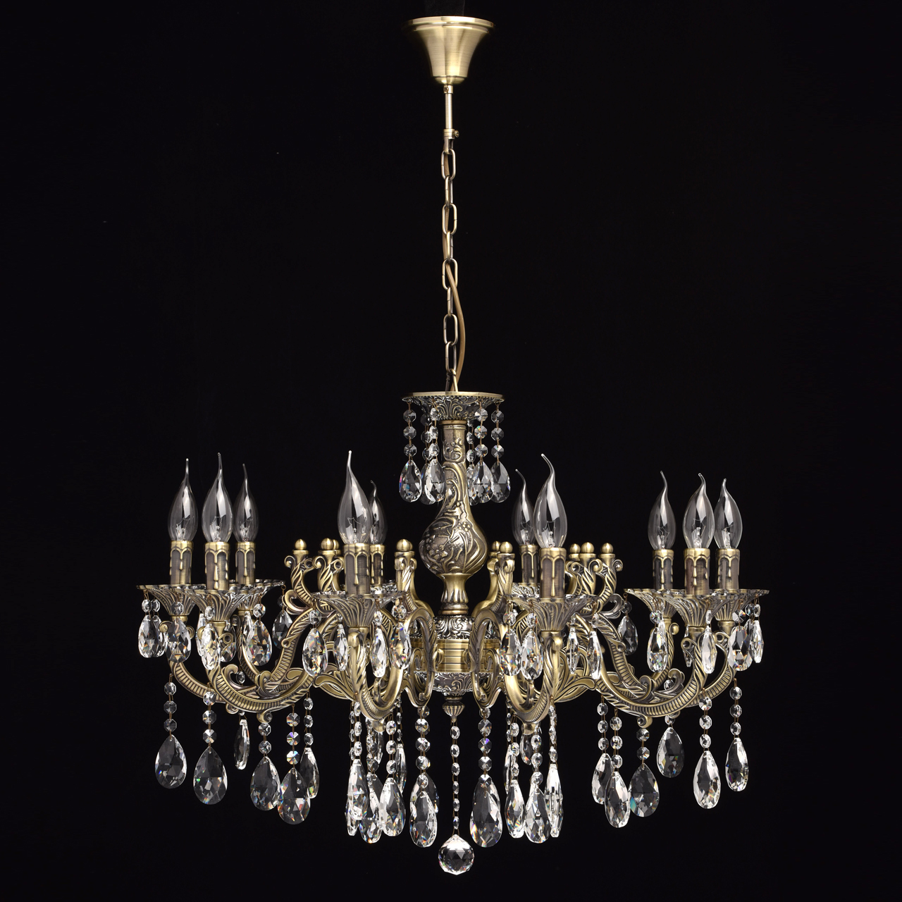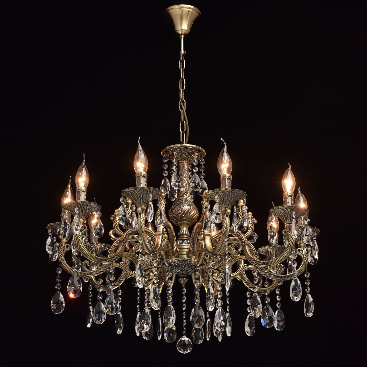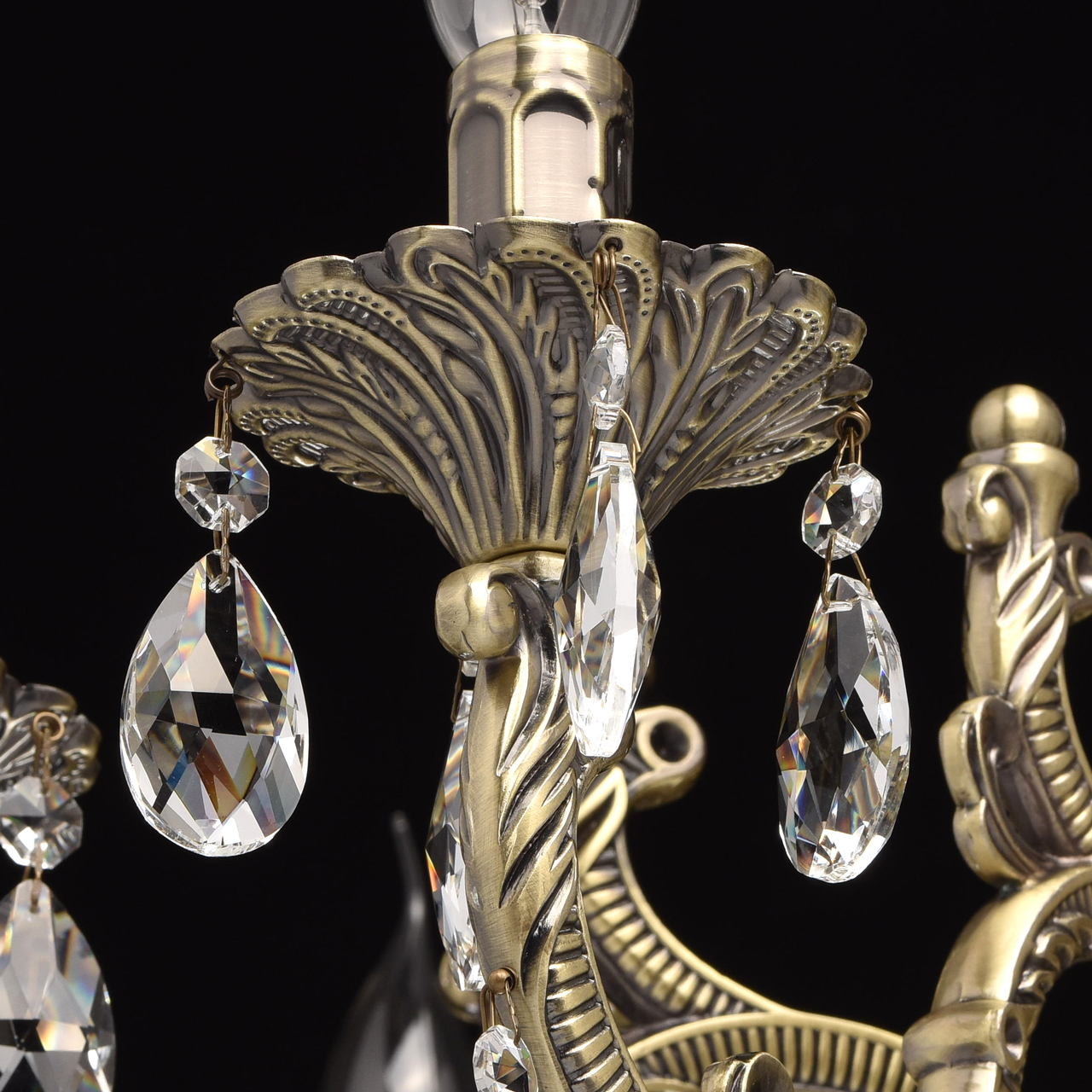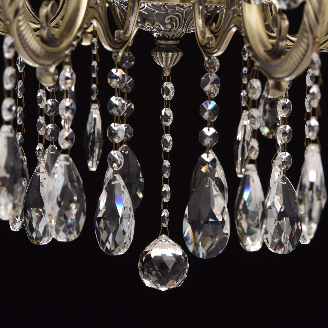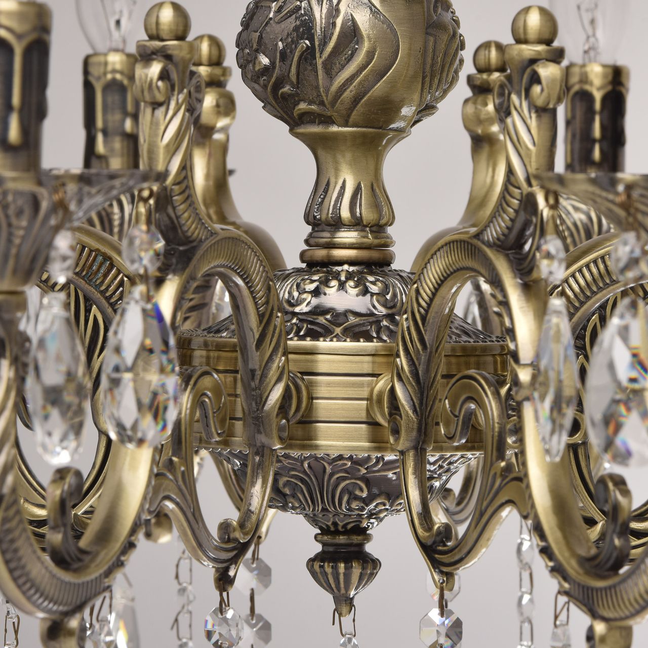 Арматура светильника выполнена из комбинации сплавов металлов и гальванизирована в цвет античной бронзы, с последующим патинированием и лакированием. Основание выполнено из металла по технологии прессования. Рожки и центральная часть выполнены из сплава алюмининия по технологии художественного литья. Декор: подвески из прозрачного хрусталя 4 видов в форме октагонов, миндаля и шара.Тип помещения