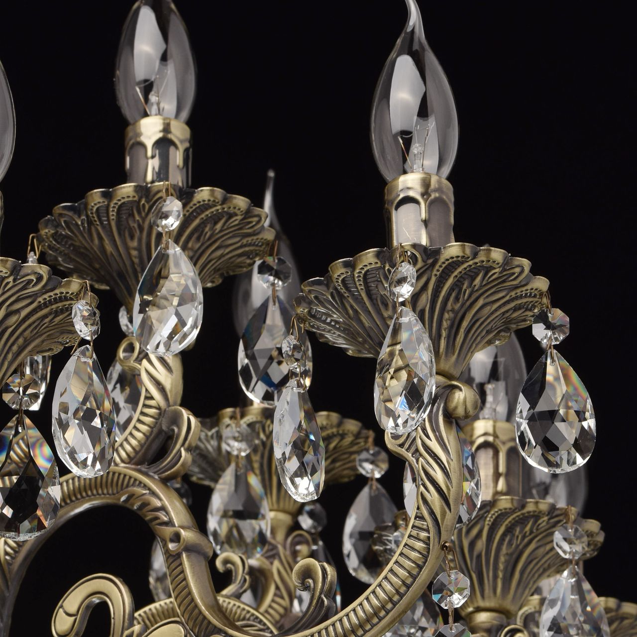 Арматура светильника выполнена из комбинации сплавов металлов и гальванизирована в цвет античной бронзы, с последующим патинированием и лакированием. Основание выполнено из металла по технологии прессования. Рожки и центральная часть выполнены из сплава алюмининия по технологии художественного литья. Декор: подвески из прозрачного хрусталя 4 видов в форме октагонов, миндаля и шара.Тип помещения