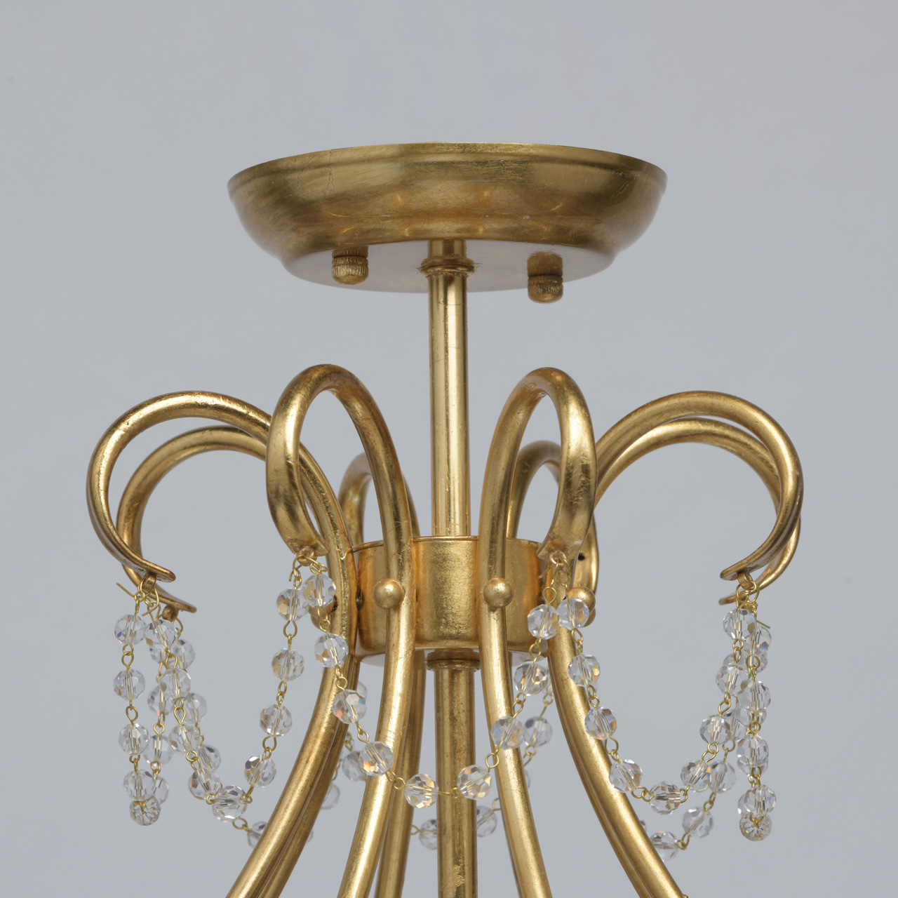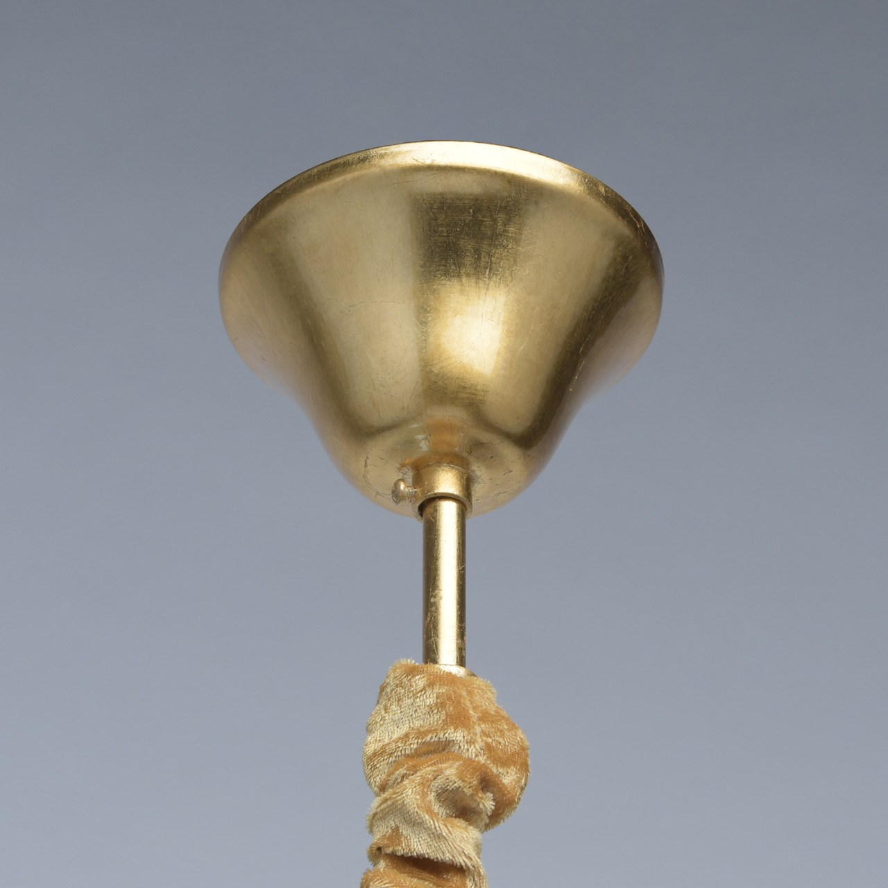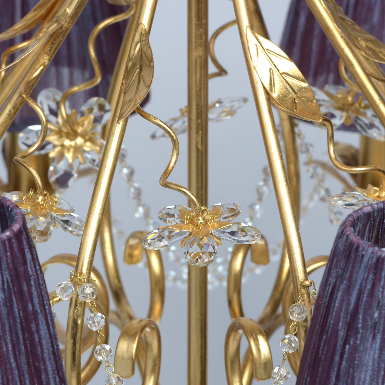 Основание выполнено из металла и покрыто сусальным золотом. Потолочная чаша, корпус - обработка на токарном станке. Декоративные розетки, листья - прессование. Рожки, декоративные элементы - прокат на роликовом станке. Текстильные абажуры выполнены из жатой органзы сиреневого цвета. Абажуры изнутри декорированы кантом. Декор: хрустальные бусы и хрусталь формы миндаль.Тип помещения