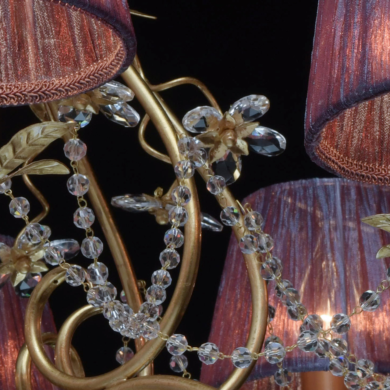 Металлическое основание покрыто сусальным золотом. Текстильные абажуры сиреневого цвета. Декор - хрусталь.Технология производства