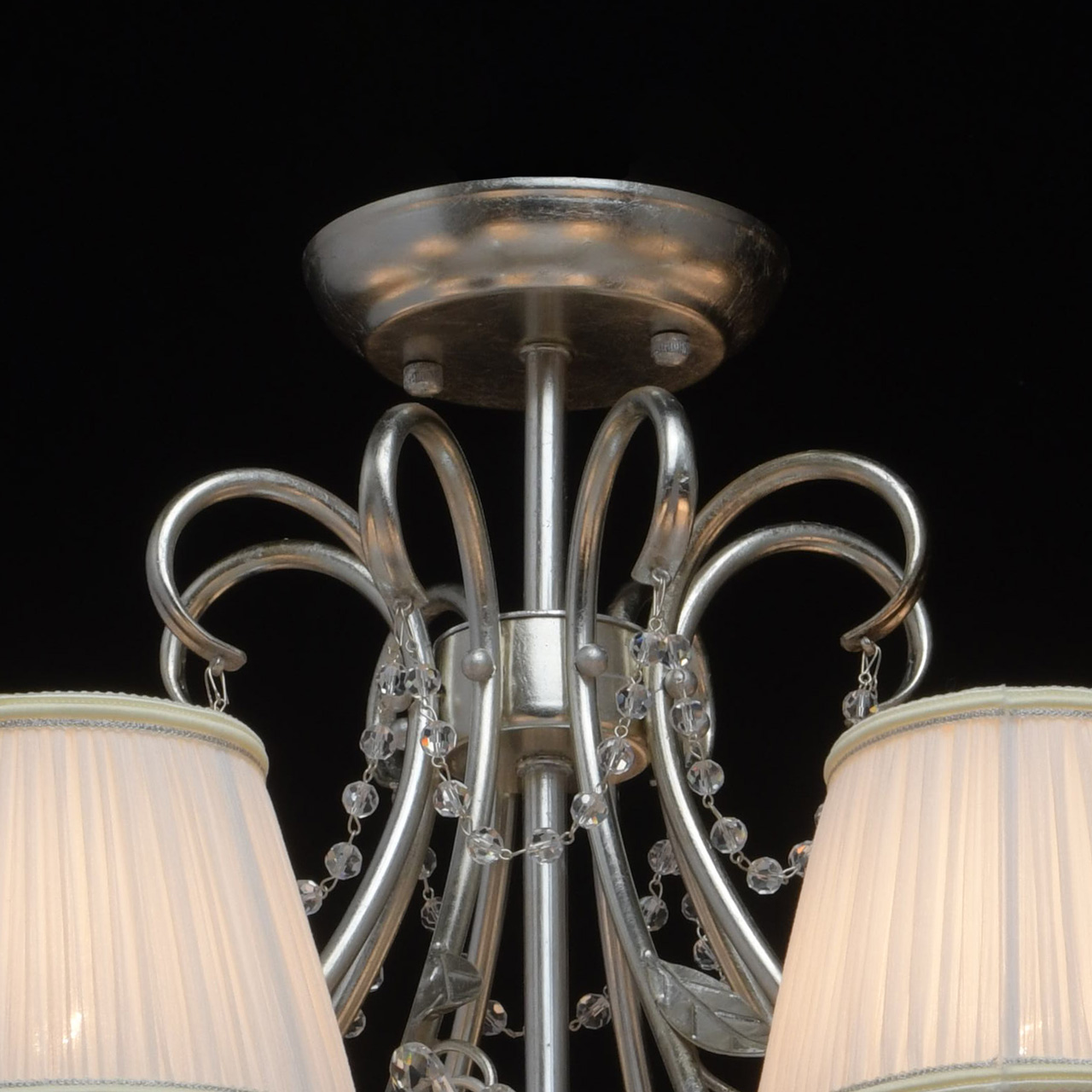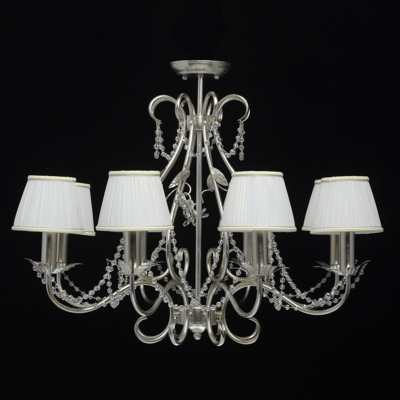 Основание выполнено из металла и покрыто сусальным серебром. Потолочная чаша, корпус - обработка на токарном станке. Декоративные розетки, листья - прессование. Рожки, декоративные элементы - прокат на роликовом станке. Текстильные абажуры белого цвета декорированы кантом вверху и внизу. Декор: хрустальные бусы и хрусталь формы миндаль.Тип помещения