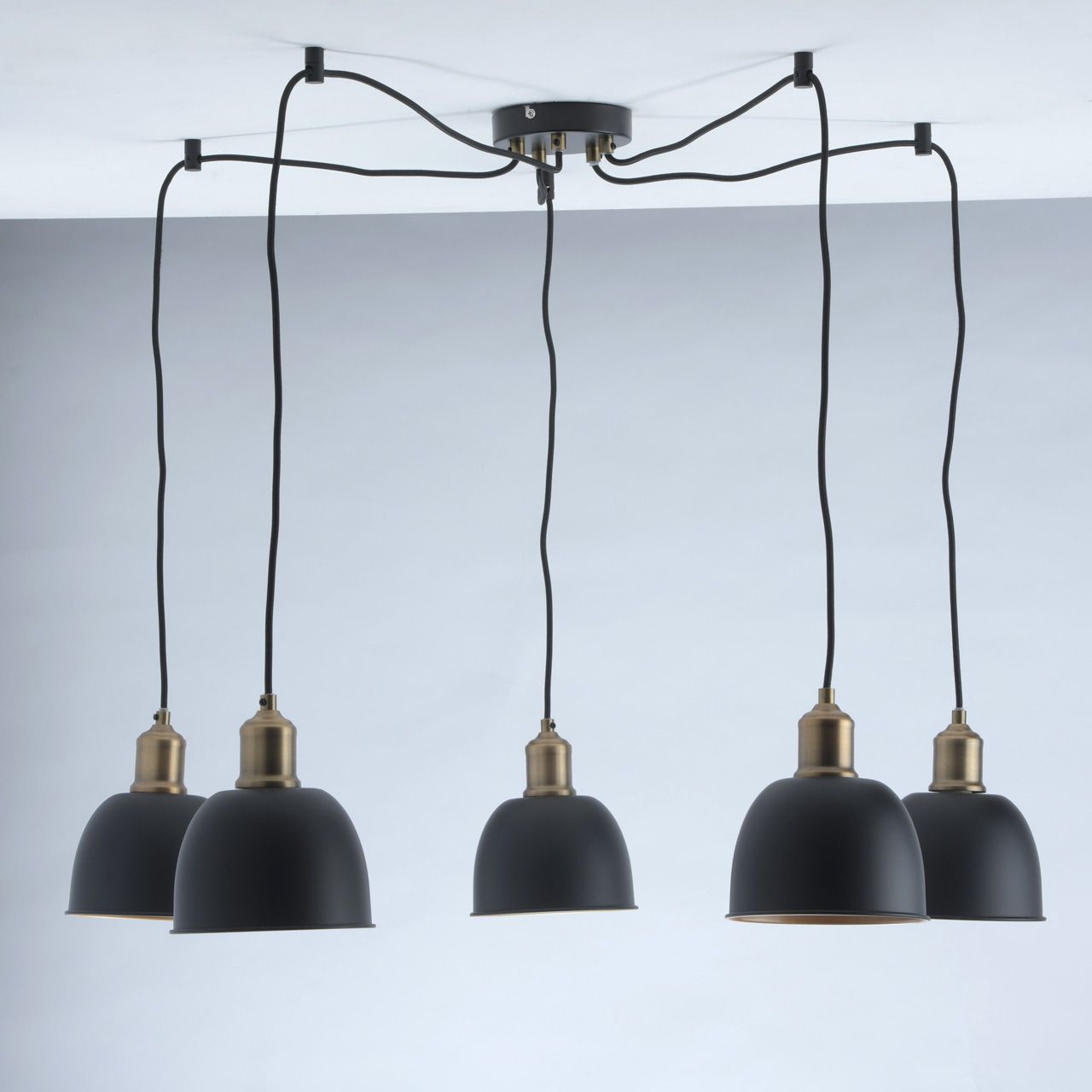 Основание и плафоны выполнены из металла. Потолочная чаша выполнена по технологии прессования, окрашена в черный цвет. Держатели плафонов гальванизированы в цвет бронзы, патинированы. Плафоны изготовлены по технологии обработки на токарном станке, по внешней поверхности окрашены в черный цвет, по внутренней поверхности окрашены в золотой цвет. Электрические шнуры в текстильной оплётке черного цвета.Тип помещения