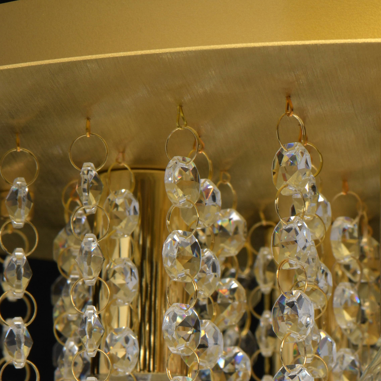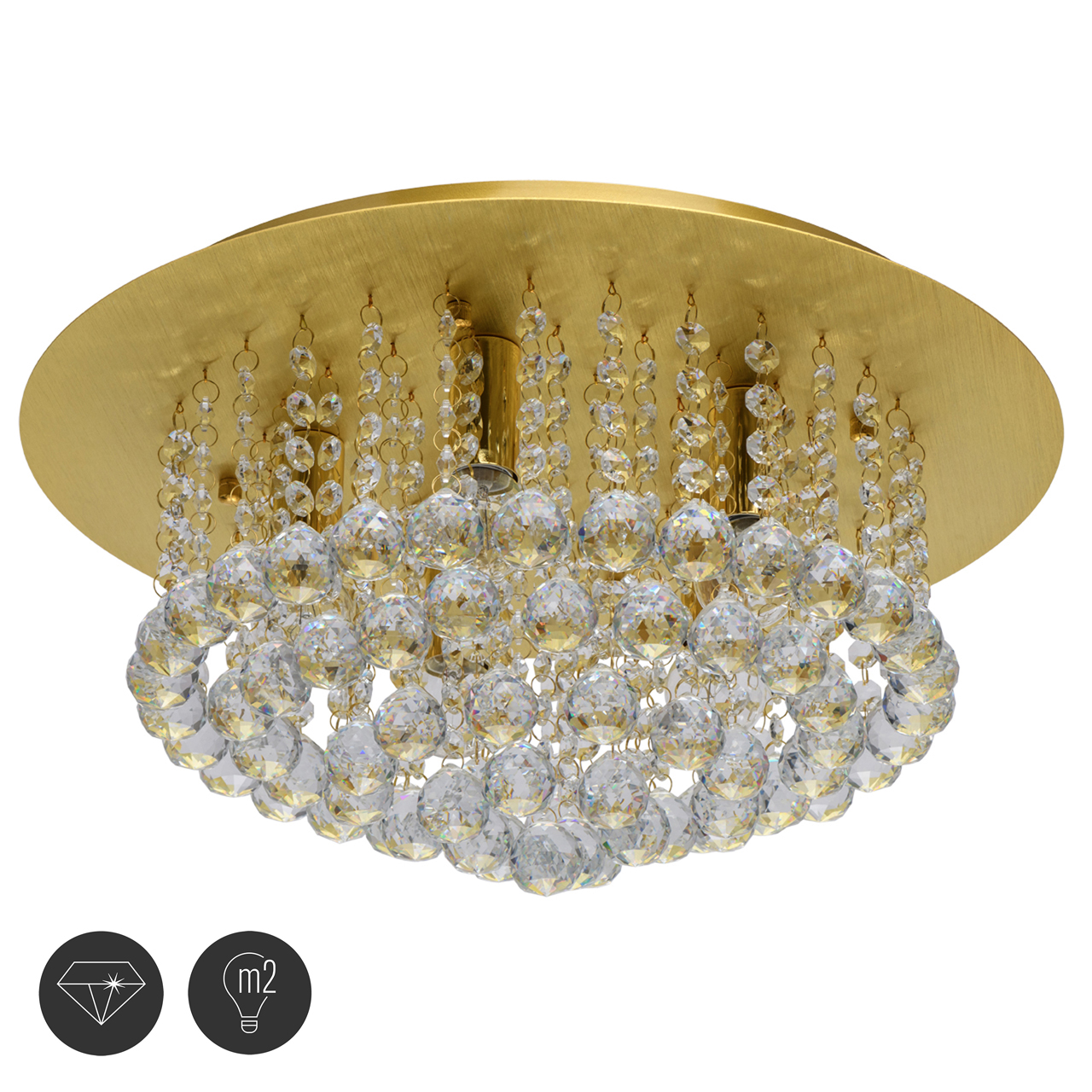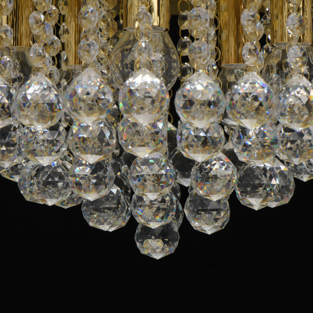 Основание светильника выполнено из комбинации сплавов металлов и окрашено в цвет матового самородного золота. Потолочная чаша выполнена из металла и закрыта листом из сплава алюминия. Лист обработан по технологии брашинг и оксидирование. Напатронники выполнены из сплава алюминия и гальванизированы в цвет золота. Светильник декорирован прозрачным хрусталем формы октагон и шар.Тип помещения