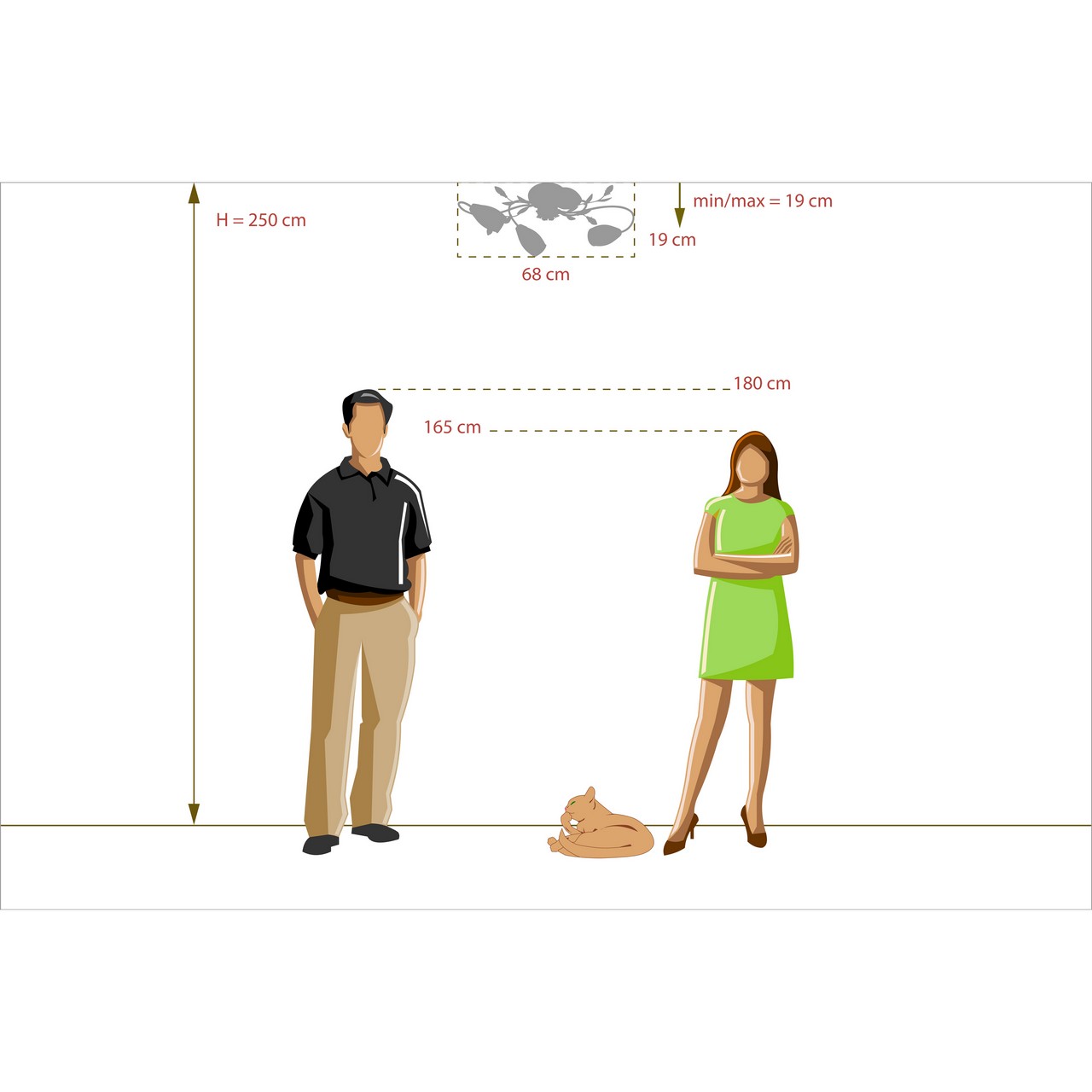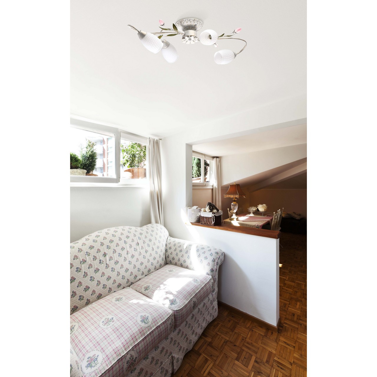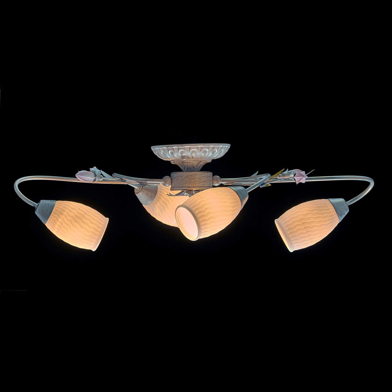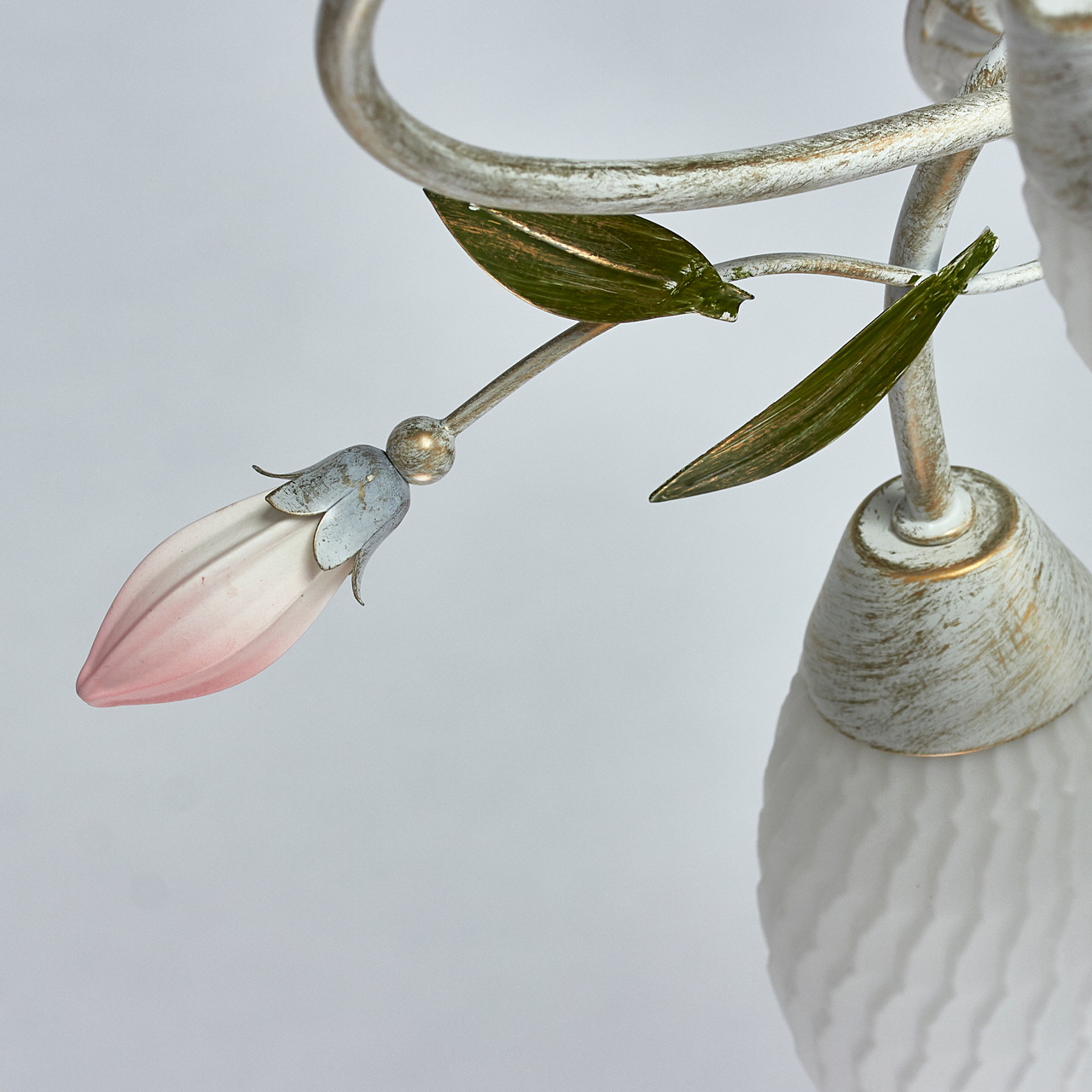 Основание светильника выполнено из металла и обработано по технологии хай-лайт, где основной цвет белый и декоративный слой золотого цвета. Плафоны из стекла отлиты в сложную форму и окрашены изнутри в белый цвет. Декоративные элементы в виде листьев окрашены в зеленый цвет. Декор в виде бутонов выполнен из фарфора и окрашен в розовый цвет.Тип помещения