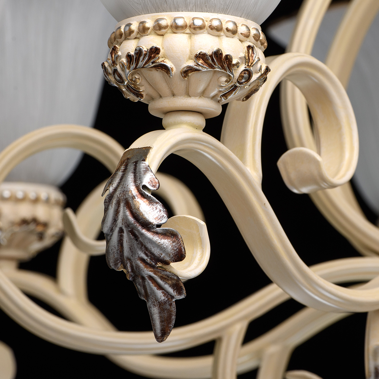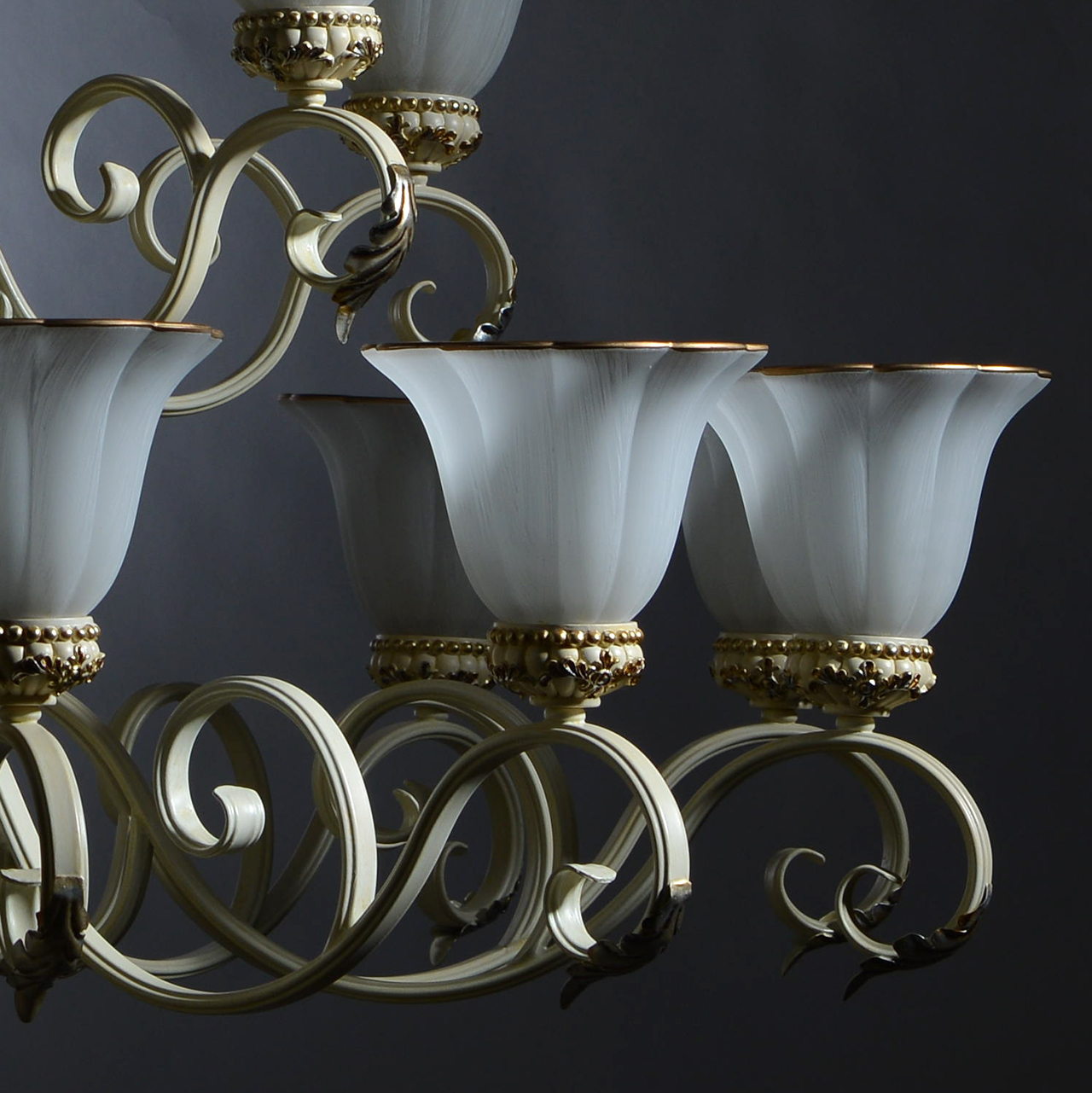 Кованое металлическое основание молочного цвета, плафоны из стекла с перламутровым отблеском и декоративной крашеной каёмкойТехнология производства