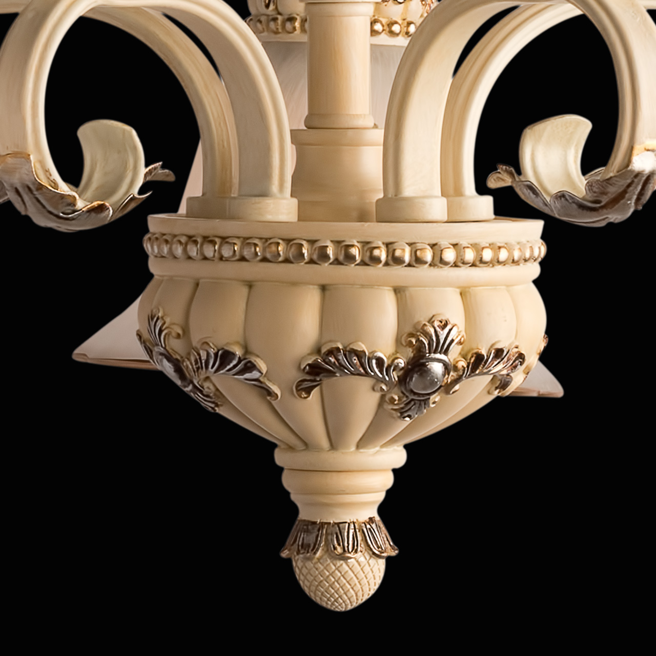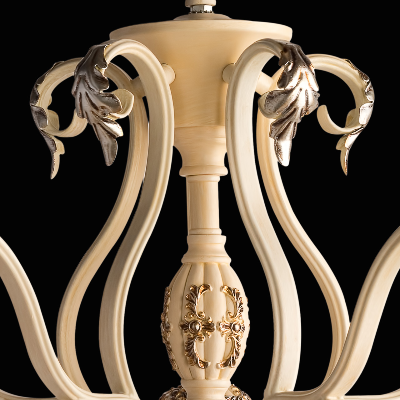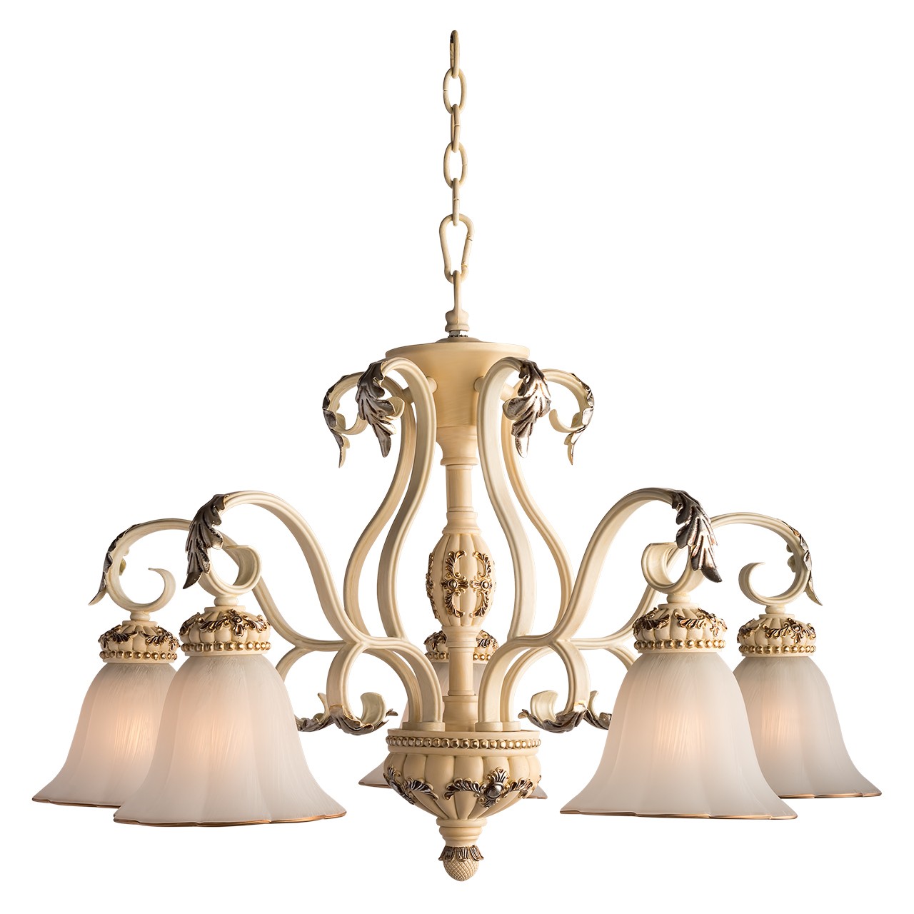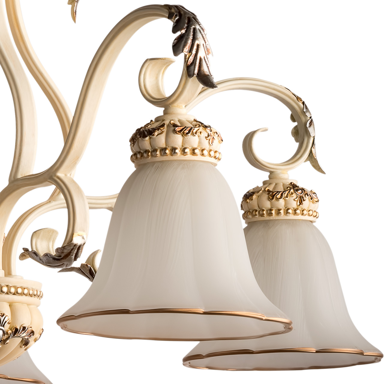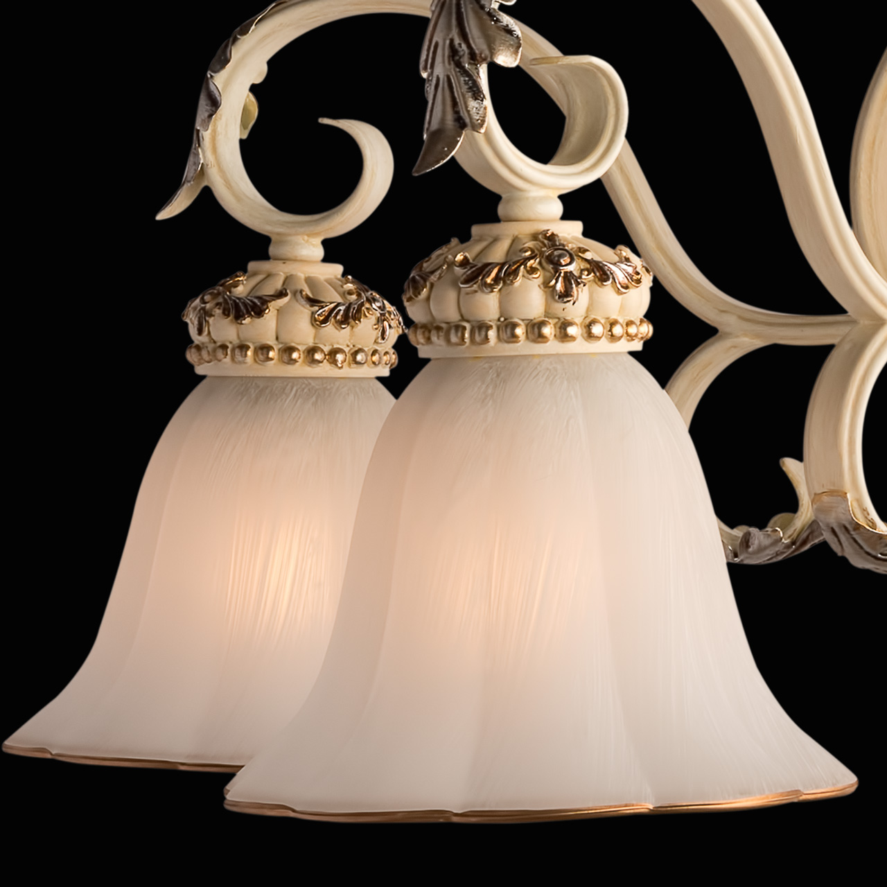 Грациозность и красота облика - визитная карточка светильников из коллекции Версаче. Витиеватые линии металлического основания окрашены в пастельно-кремовый оттенок с лёгким эффектом старения. Отдельные элементы арматуры выделены золотистой краской, так же как и волнистая кайма на матированных плафонах, выполненных в виде стеклянных колокольчиков. Светильник Версаче имеет отличные показатели освещенности, чтобы стать достоянием просторного зала с элементами старины, с обилием декора в стиле Кантри. Светильник такого затейливого дизайна подойдёт и для оформления столовой, гостиной, кухонной зоны. Обилие тёплых лучей от ламп накаливания сможет осветить пространство до 25 кв.м.Преимущества модели