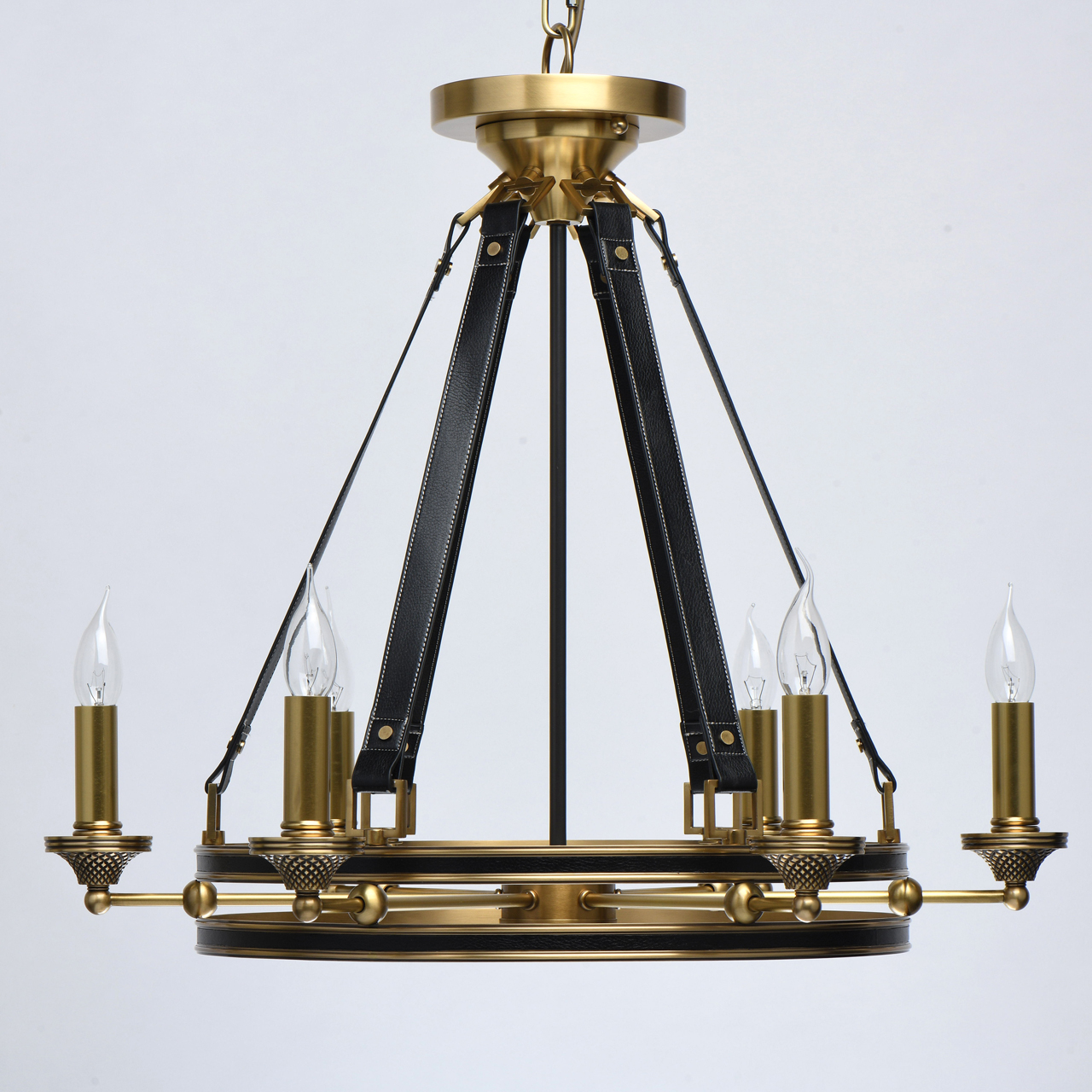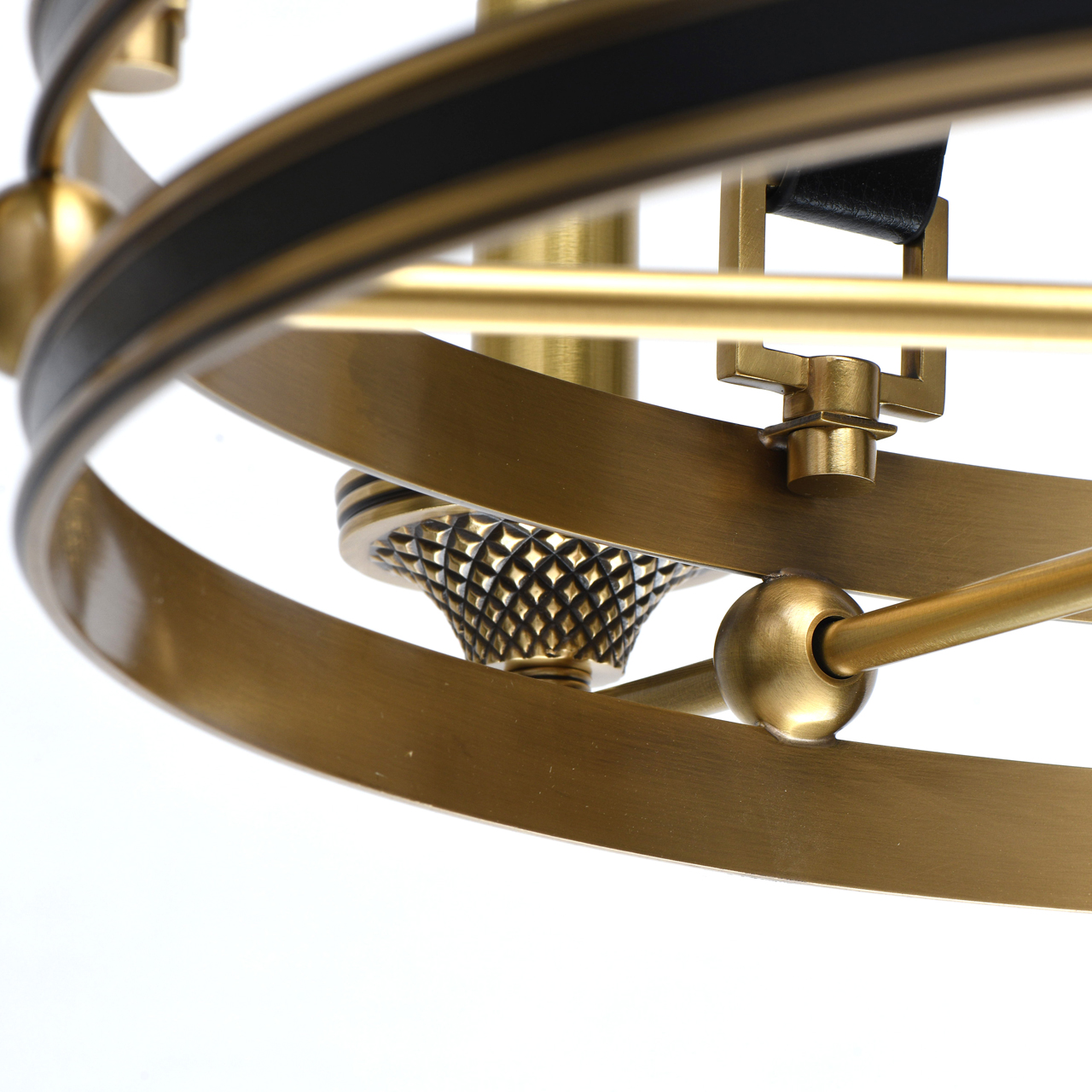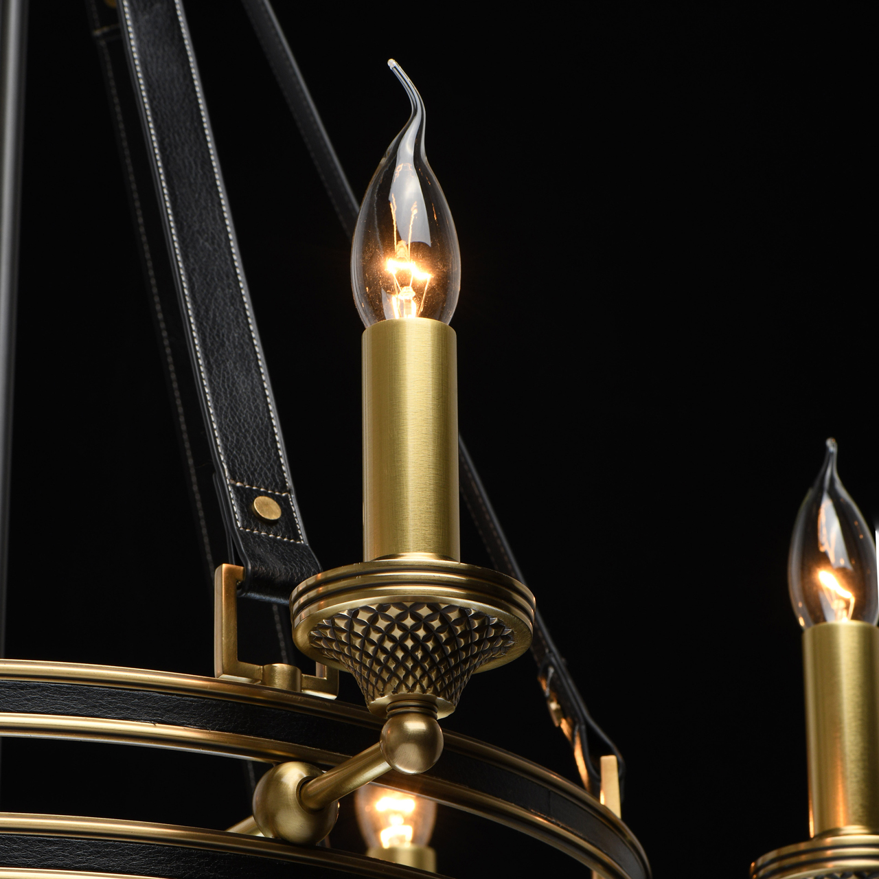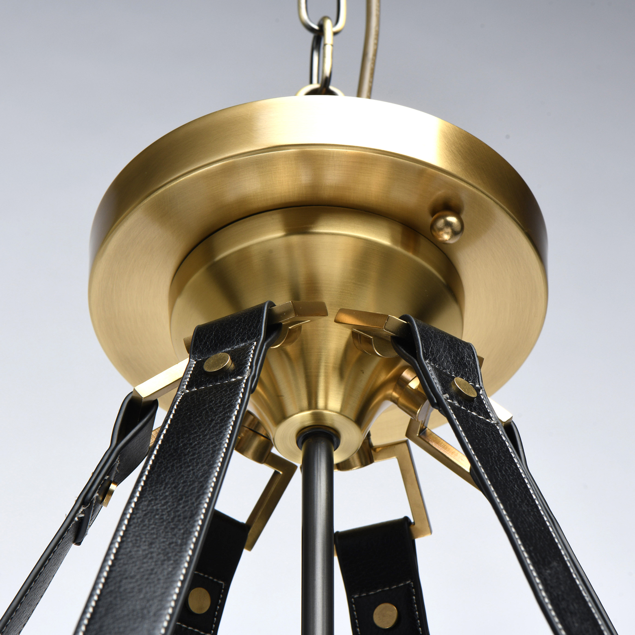 Основание светильника выполнено из латуни. Каркас декорирован черной кожей. Декоративные розетки градуированной формы выполнены по технологии художественного литья и оксидированы. Декоративные подвесы также выполнены из черной кожи.Тип помещения