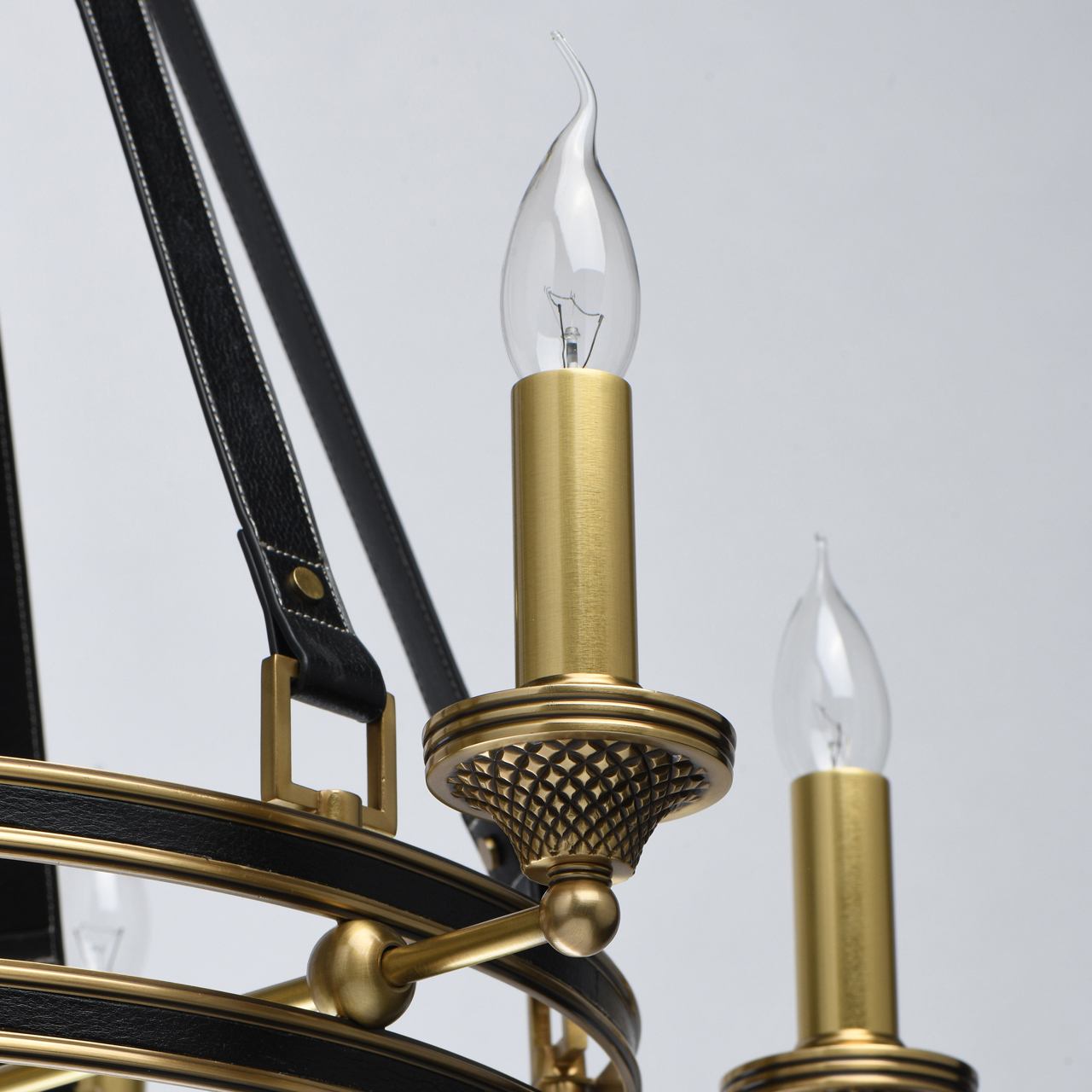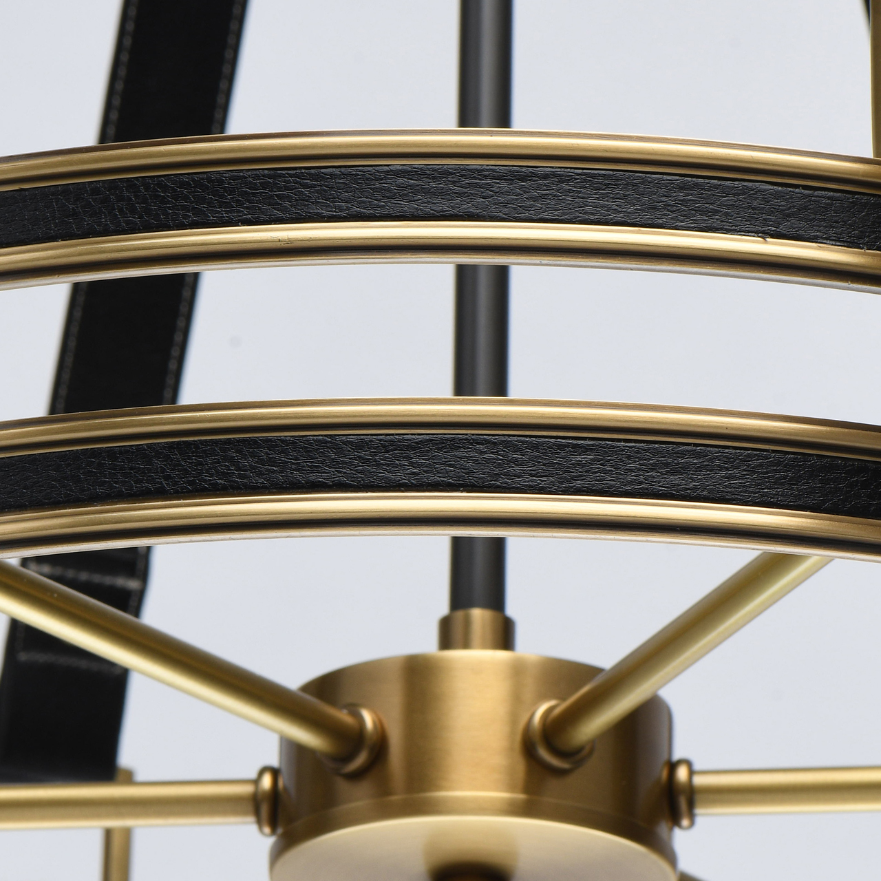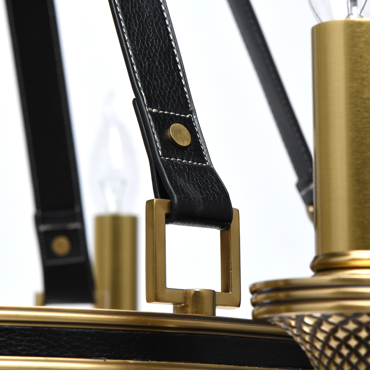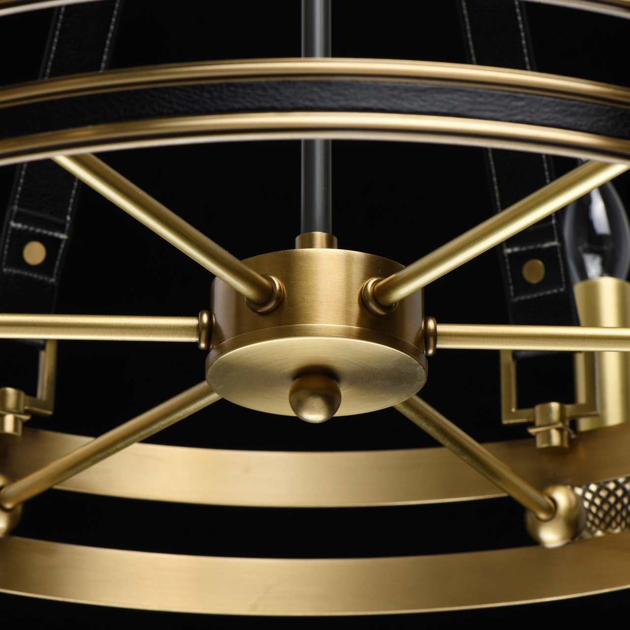 Основание светильника выполнено из латуни. Каркас декорирован черной кожей. Декоративные розетки градуированной формы выполнены по технологии художественного литья и оксидированы. Декоративные подвесы также выполнены из черной кожи.Тип помещения