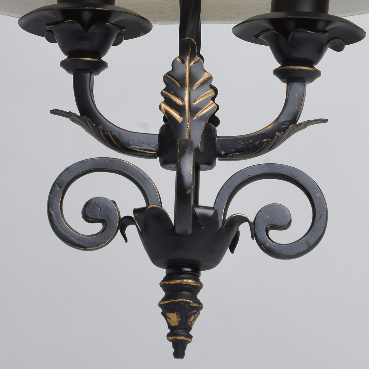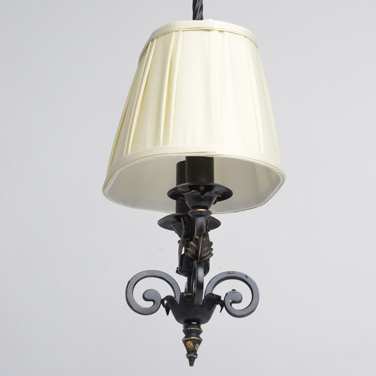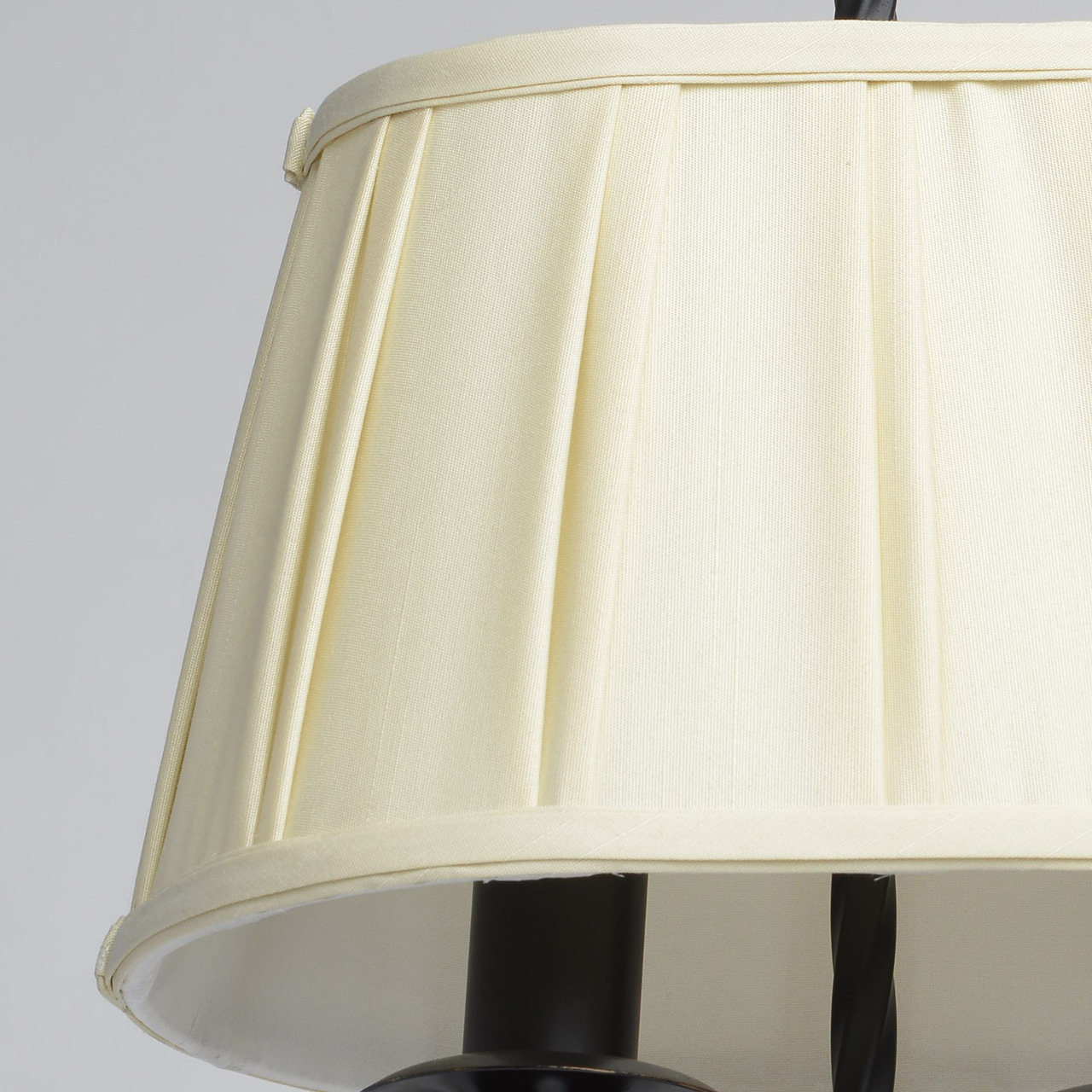 В очертаниях форм светильника Виктория присутствует романская строгость и массивность монументального произведения. Это ощущение достигается благодаря матово-чёрному кованому основанию, выполненному из качественного металла. Арматура изготовлена по сложным эскизам, полностью воплощающим очертания типичных светильников классического европейского средневекового стиля. В светильнике Виктория абажур сделан из плотной ткани молочного оттенка и собран в элегантную плиссированную складку, благодаря чему светильник приобретает мягкое свечение и гламурный шик!Преимущества модели