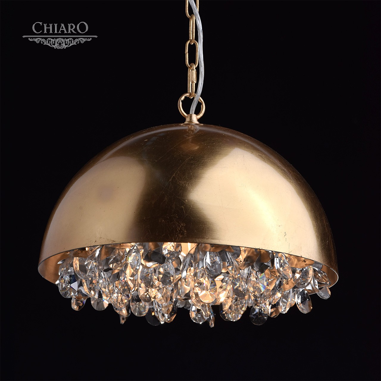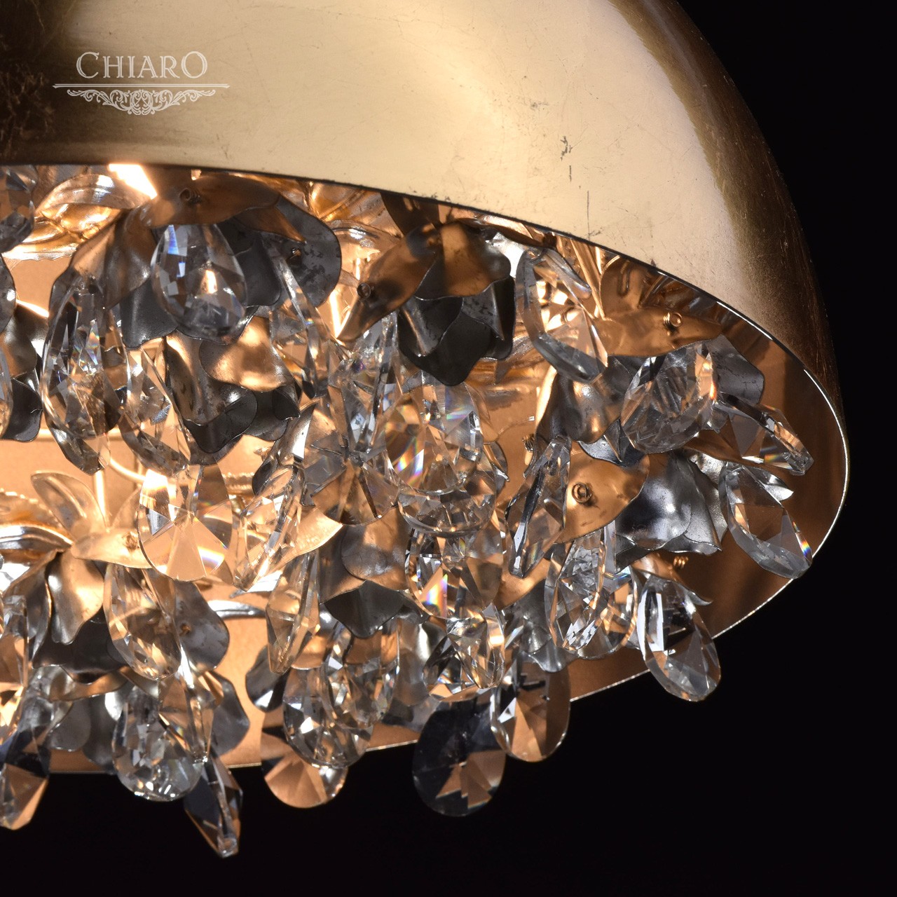Корпус светильника выполнен из металлического сплава и обработан по технологии поталь. Технология нанесения потали идентична технологии работы с сусальным золотом и с сусальным серебром. Корпус светильника покрыт золотой поталью. Изнутри, светильник декорирован подвесками из высококачественного хрусталя и цветами, выполненными из сплава металла и покрытыми серебряной поталью.Тип помещения