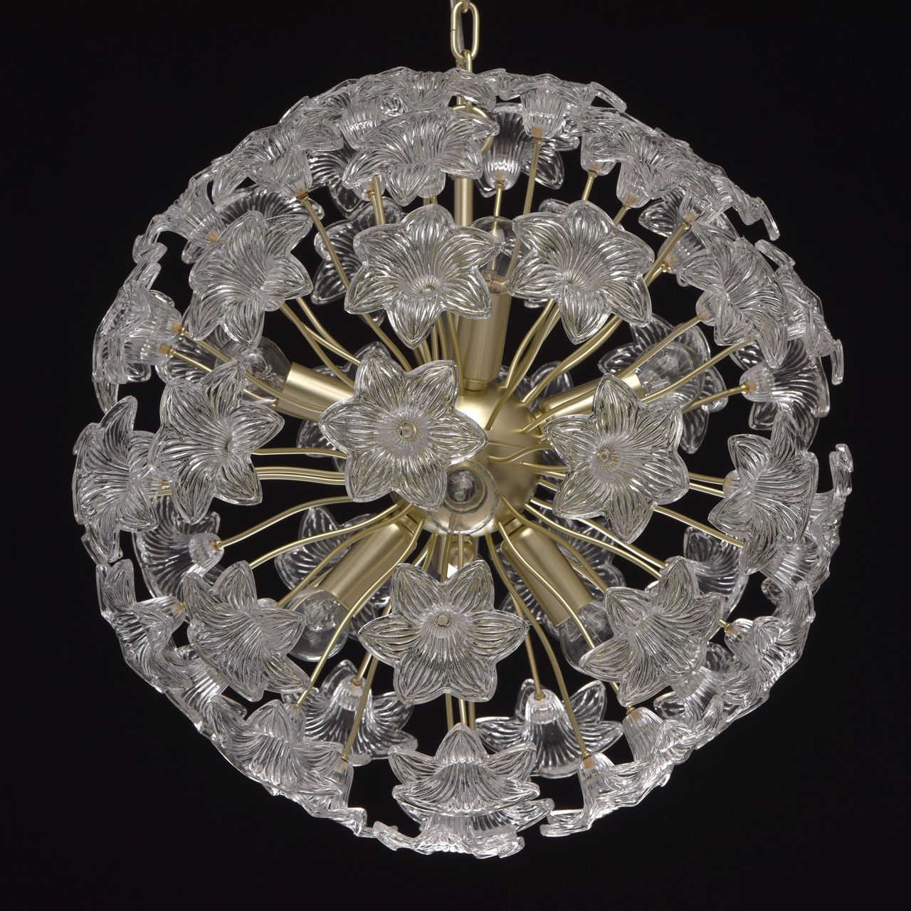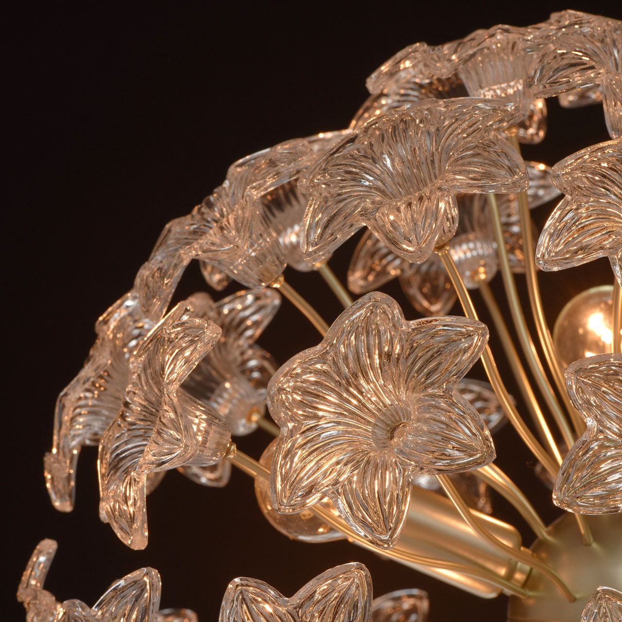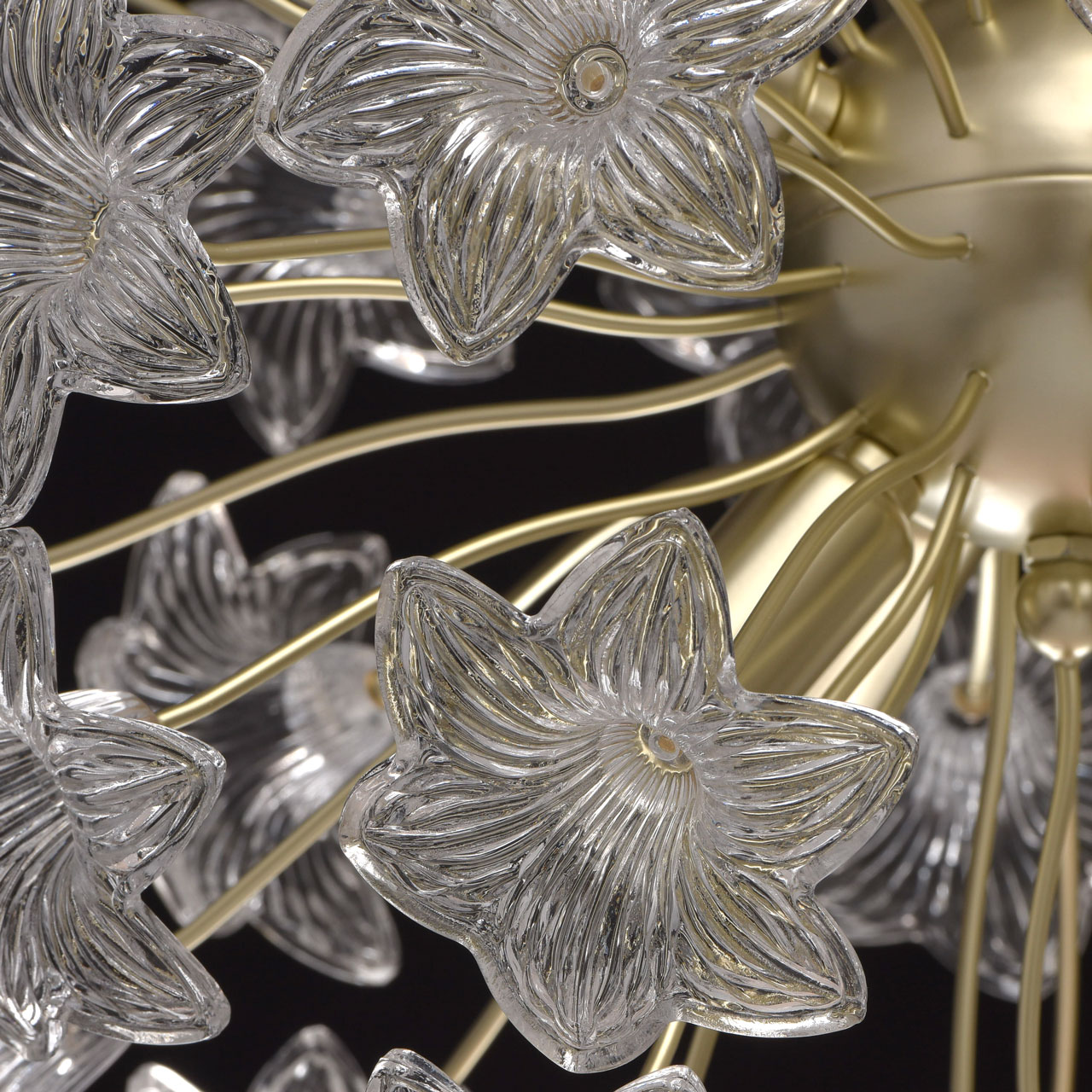 Основание: металл окрашено в цвет перламутрового золота. Декор в виде цветов выполнен из прозрачного стекла, отлитого в сложную форму.Тип помещения