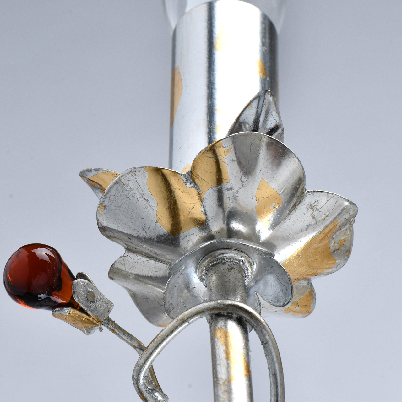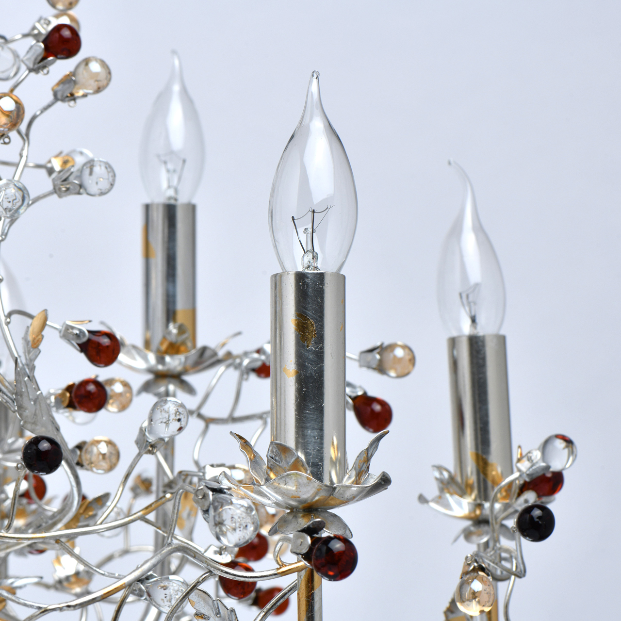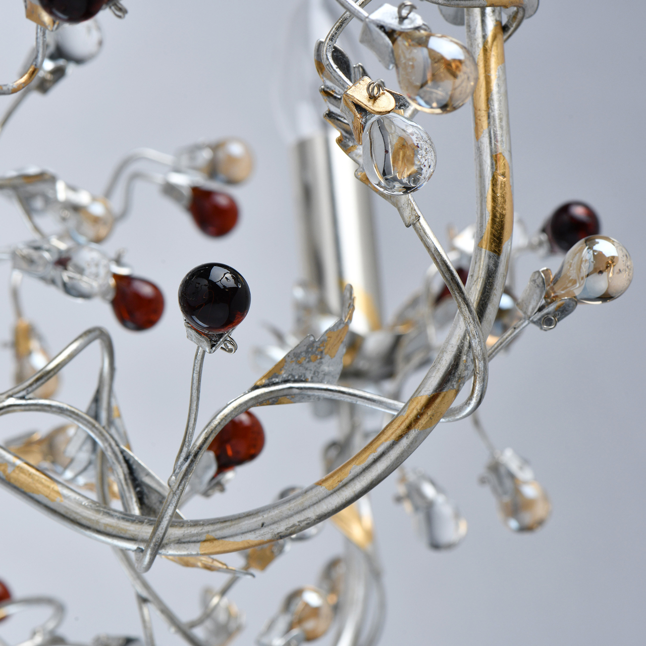 Основание светильника выполнено из сплава металла и обработано по технологии двухслойного покрытия: первый слой, основной - сусальное серебро, второй слой, декоративный - сусальное золото. Светильник декорирован элементами из прозрачного стекла и стекла, окрашенного в янтарный цвет и цвет шампань.Тип помещения