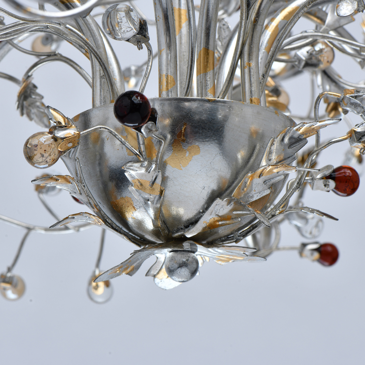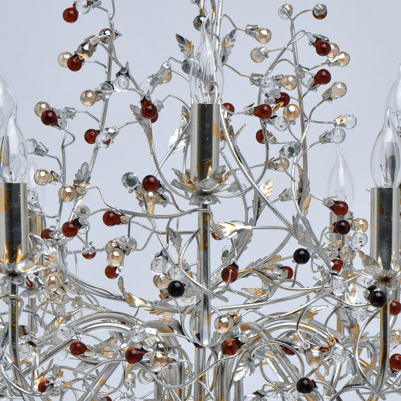 Флористический декор из разноцветного стекла. Покрытие сусальным золотом и серебром ручной работы. Открытые источники света в виде классических рожков-свечей обеспечивают высокие параметры освещенности Широкая семья включает бра, потолочные светильники на 6 и 9 рожков и подвесов на 6 и 9 рожков.Стилевые решения интерьера