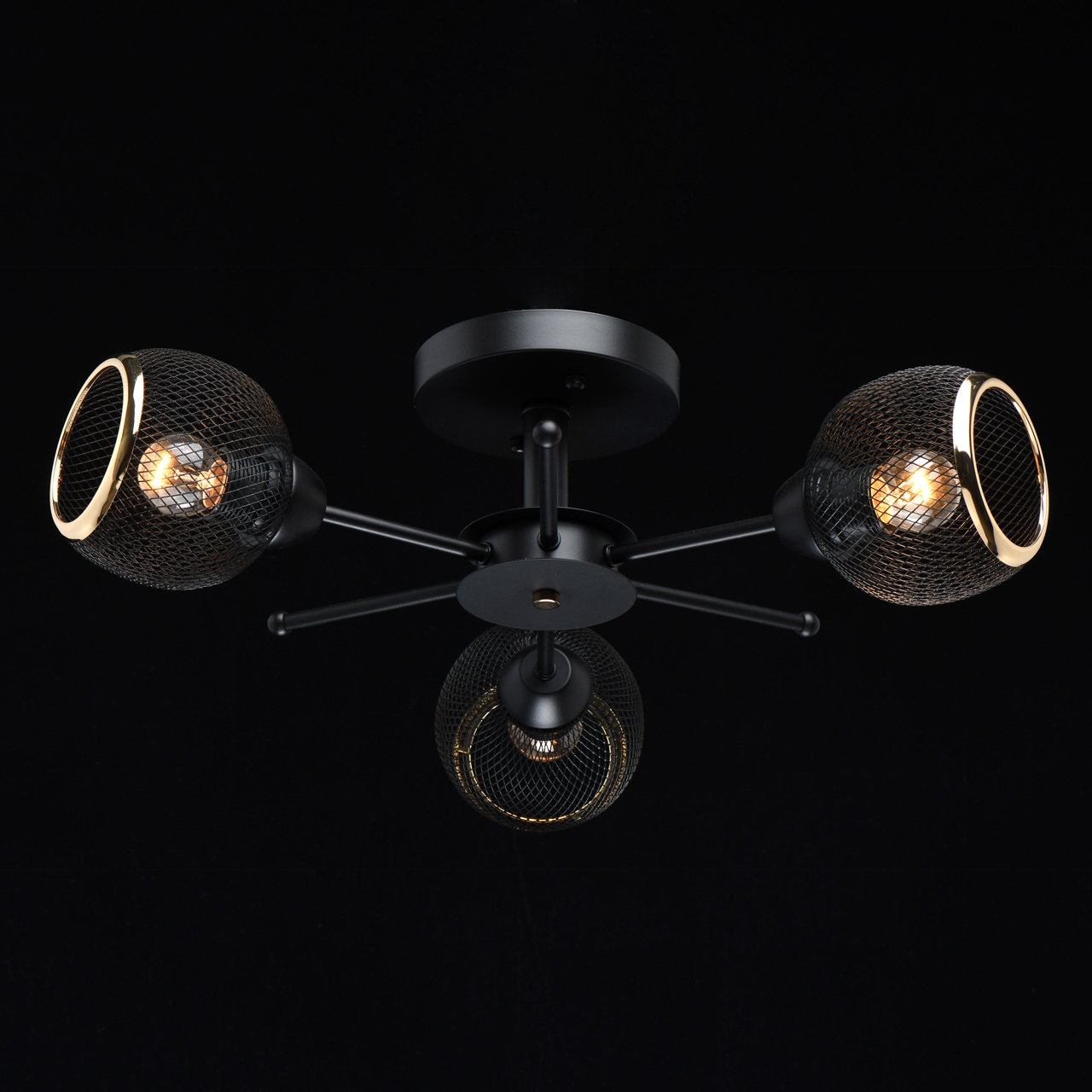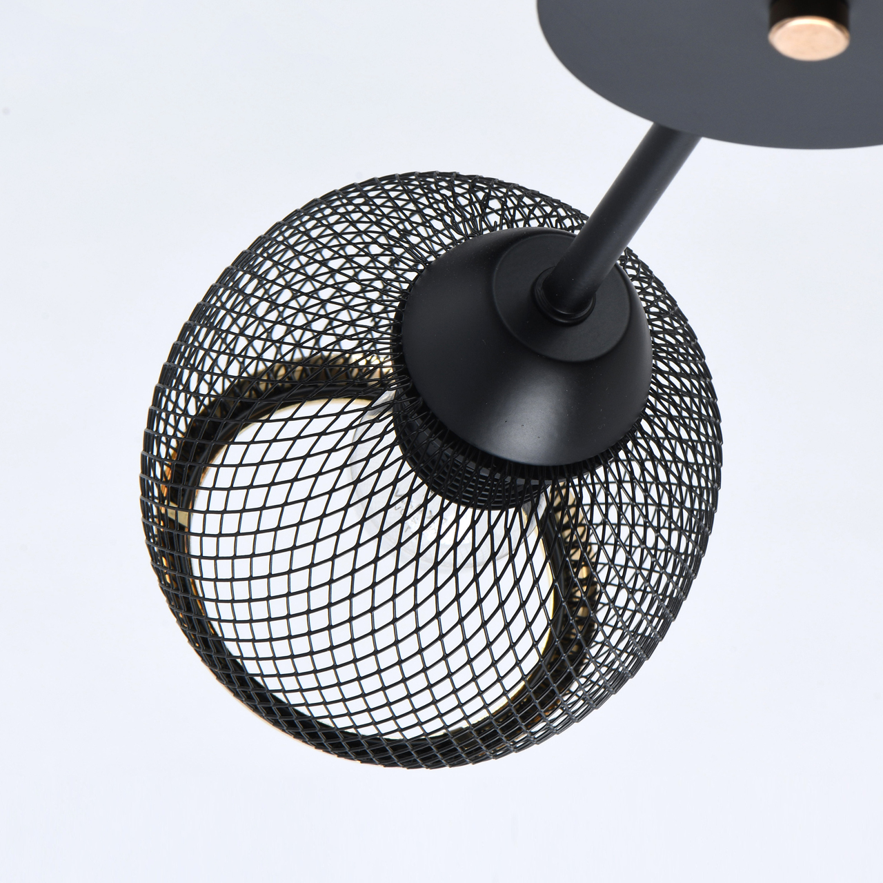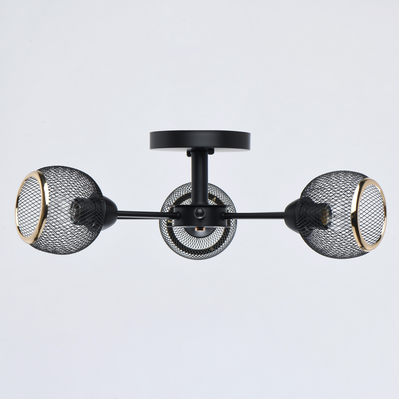 Дизайн-идея в контрасте цветов и фактур поверхностей поддержана темными патронами ламп. Компактная высота идеальна для стандартных потолков. Плафоны из декоративной сетки c золотым кантом затейливым узором рассеивают свет. Заменяемые источники света удобны в эксплуатации.Стилевые решения интерьера