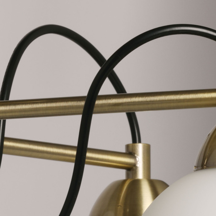 Благодаря сочетанию цвета античной бронзы и матового стекла люстра привнесет в интерьер атмосферу уюта. Современности и стиля светильнику придают контрастные черные наружные кабели. Свет, направленный вниз создает яркое зональное освещение. Заменяемые источники света удобны в эксплуатации.Металлическое основание потолочной люстры гальванизировано в цвет античной бронзы. Светильник декорирован стеклянными плафонами, выдувными в форму вручную и матированными.