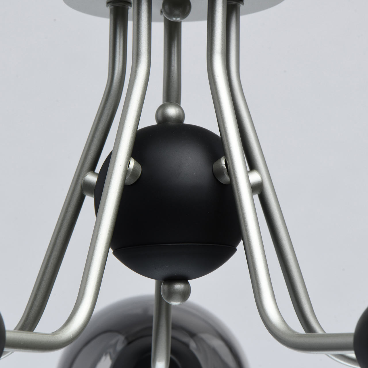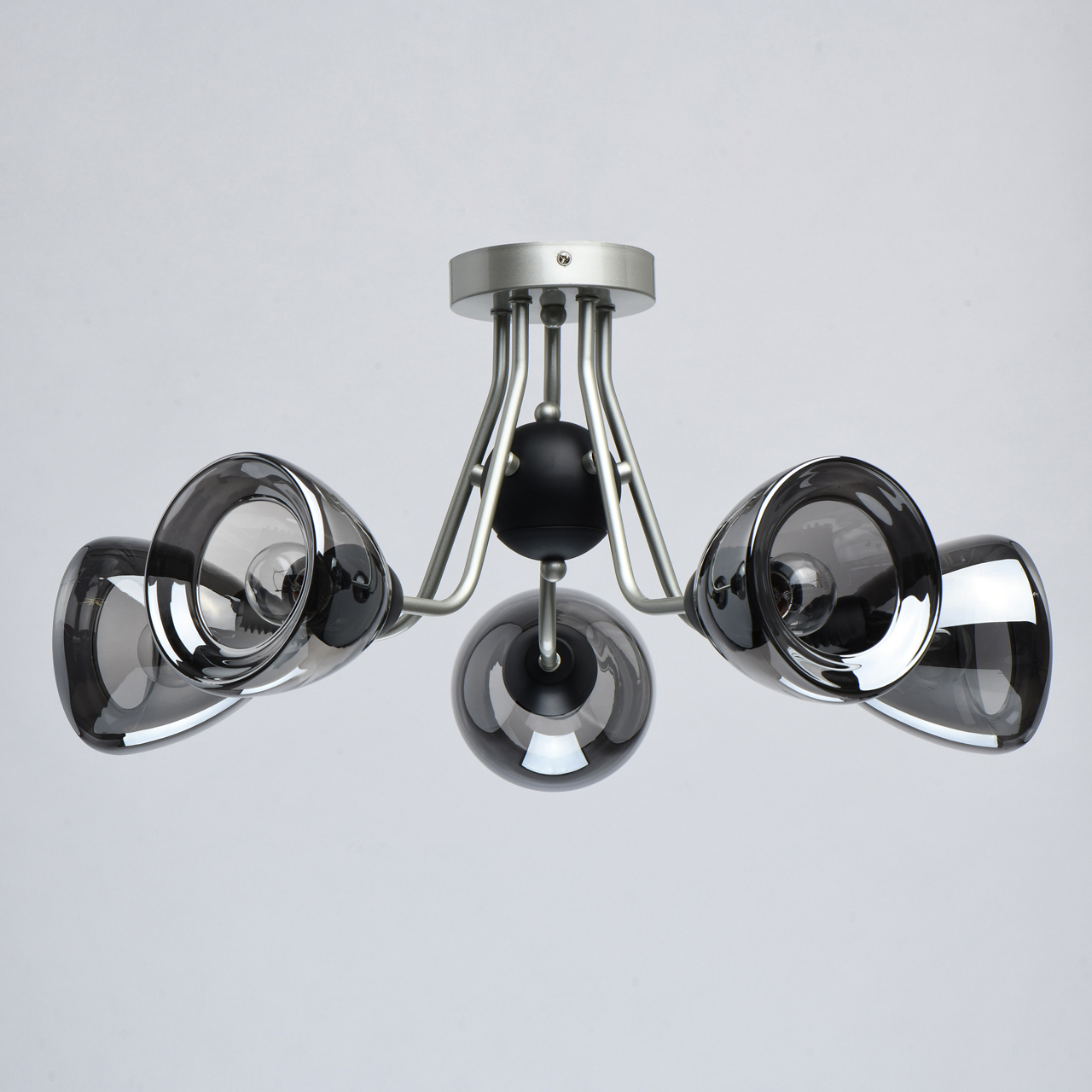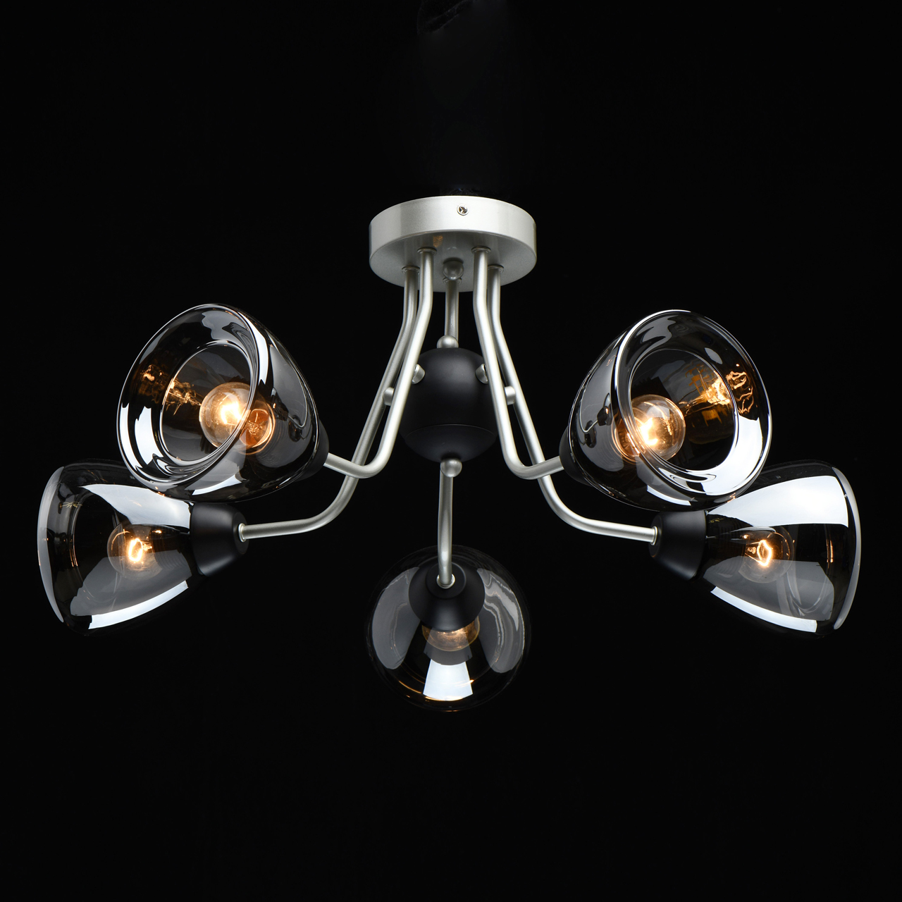 Металлическое основание светильника окрашено в цвет перламутрового серебра. Потолочная чаша и держатели плафонов окрашены в черный цвет. Стеклянные плафоны отлиты в сложную форму и гальванизированы в дымчатый цвет.Тип помещения
