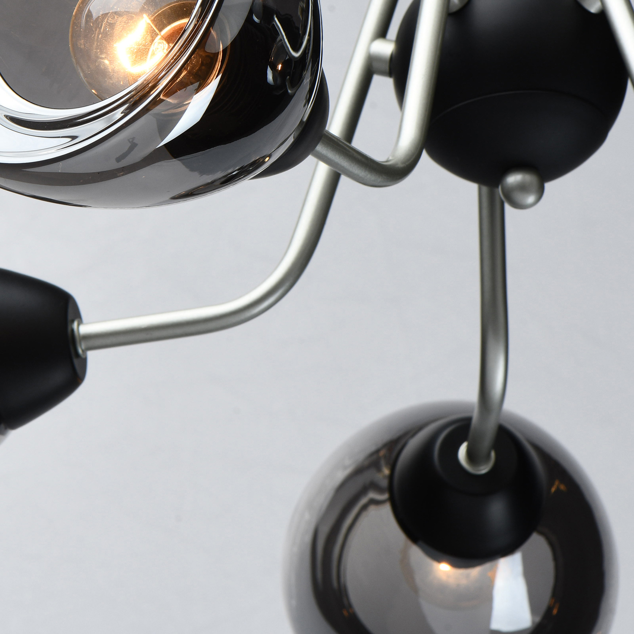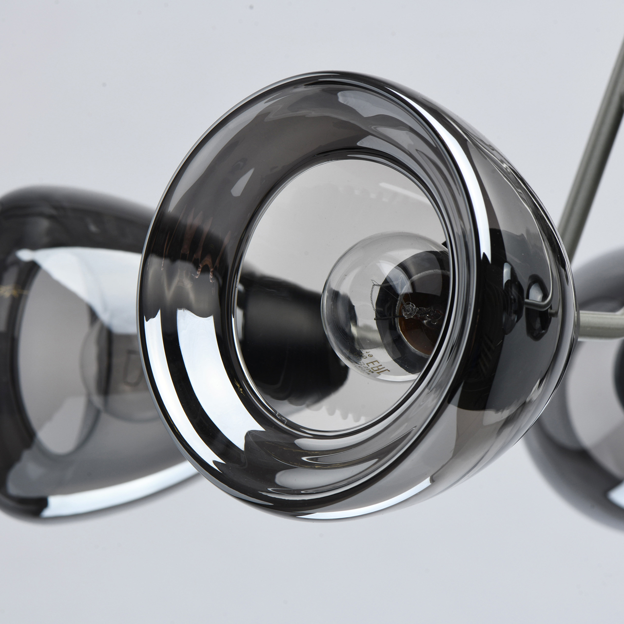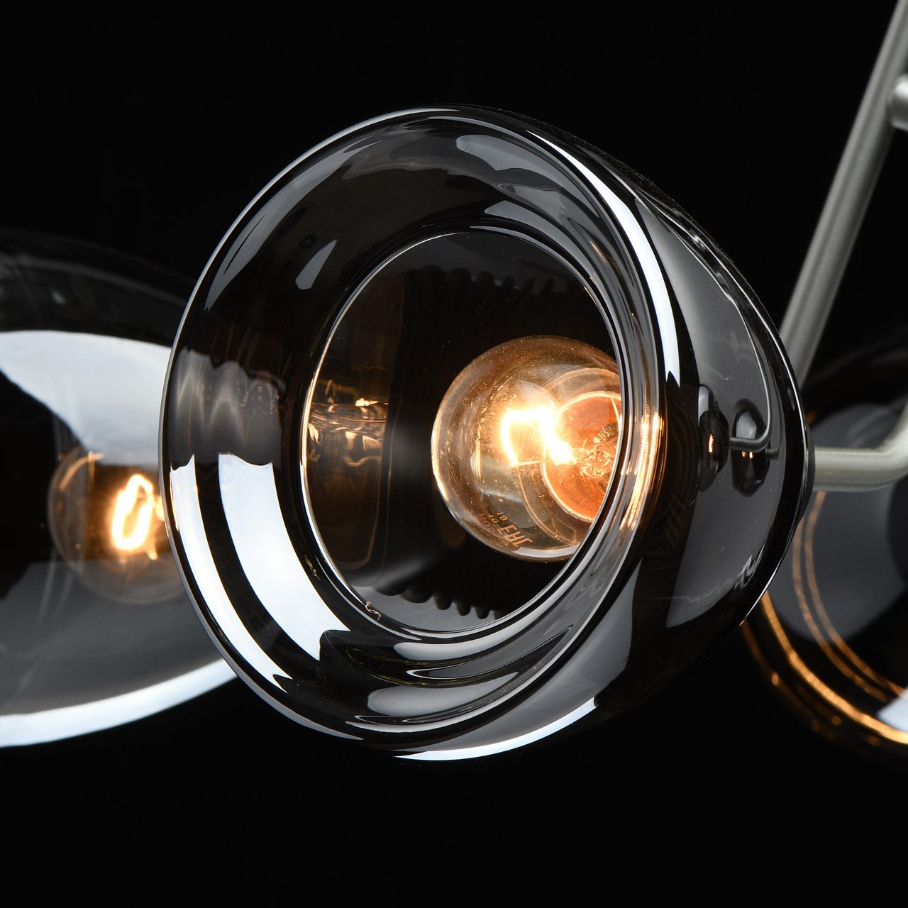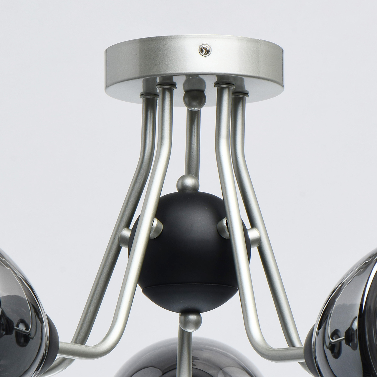 Металлическое основание светильника окрашено в цвет перламутрового серебра. Потолочная чаша и держатели плафонов окрашены в черный цвет. Стеклянные плафоны отлиты в сложную форму и гальванизированы в дымчатый цвет.Тип помещения