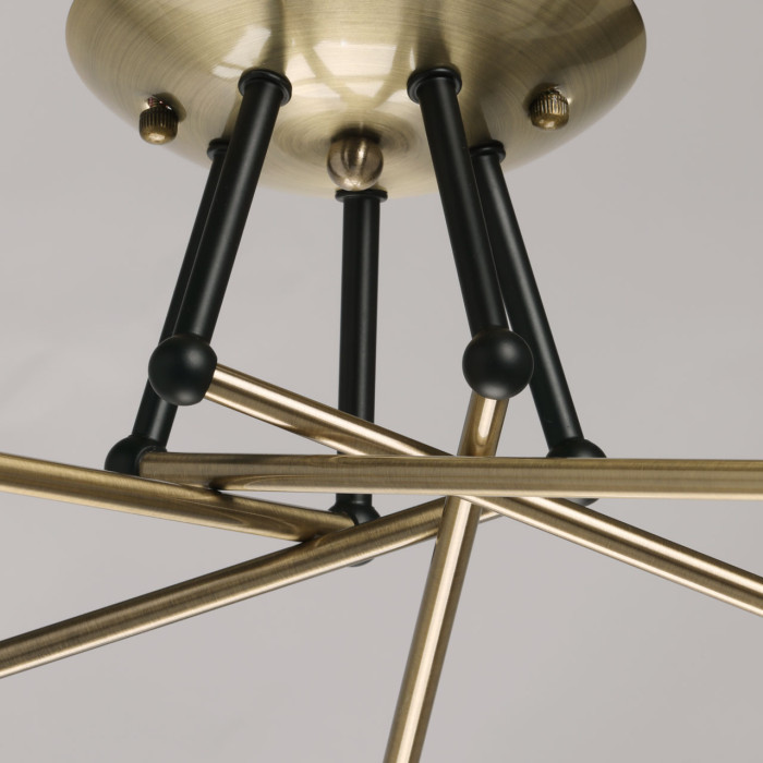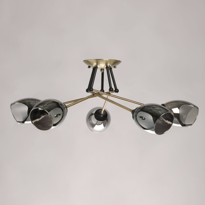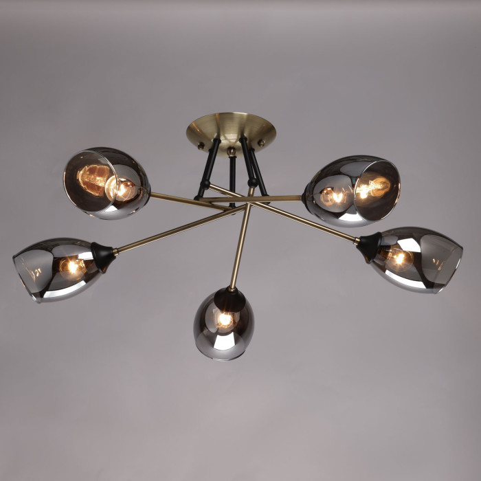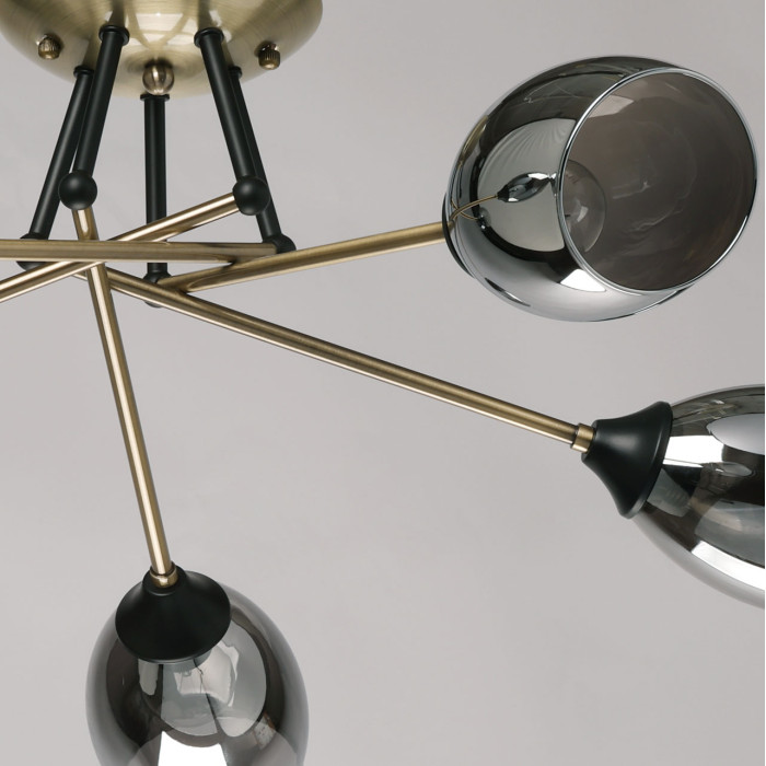 Актуальная стилистика лофта, сочетание металлов цвета античной бронзы и черного. Компактная высота светильника идеальна для стандартной высоты потолка. Стеклянные плафоны гальванизированы в дымчатый цвет, создают комфортный свет. Геометричность рожков придает потолочной люстре технологичности. Заменяемые источники света удобны в эксплуатации.Металлическое основание потолочной люстры гальванизировано в цвет античной бронзы. Отдельные элементы основания окрашены в черный цвет. Традиционные источники света закрыты стеклянными плафонами, гальванизированными в дымчатый цвет.