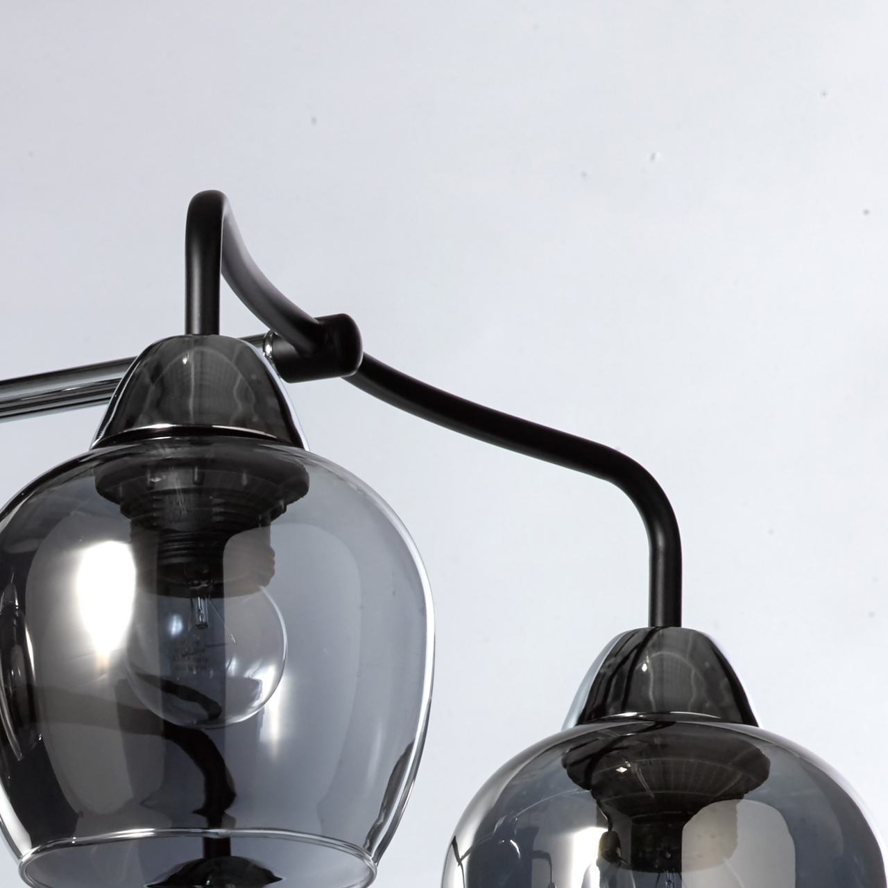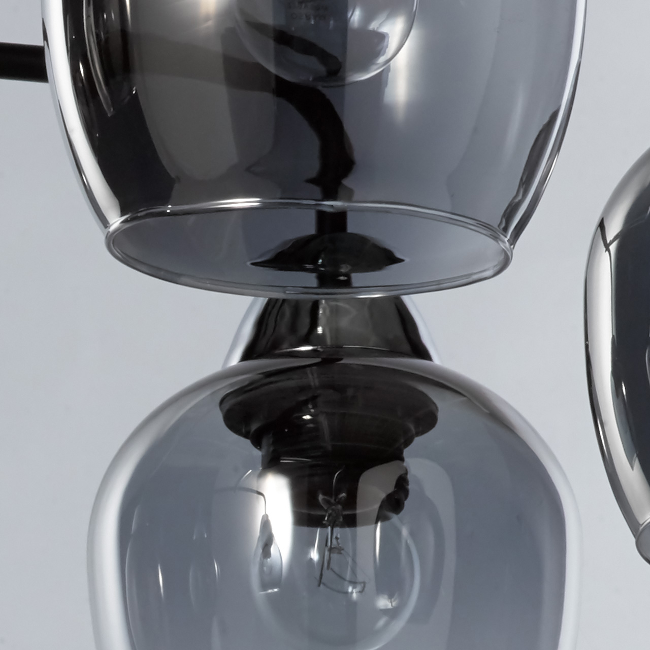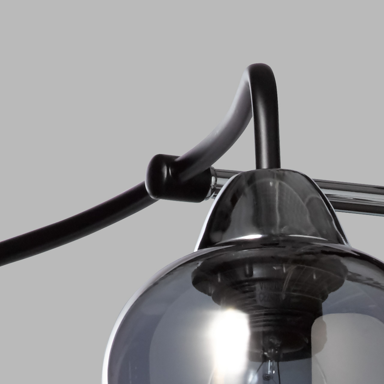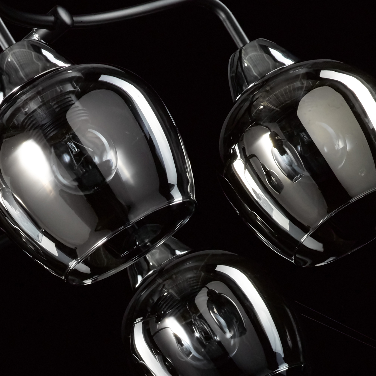 Основание светильника выполнено из металла и гальванизировано в цвет хрома. Отдельные элементы основания окрашены в черный цвет. Стеклянные плафоны отлиты в форму и гальванизированы в дымчатый цвет. У основания, плафоны окрашены в черный цвет. Края плафонов оплавлены.Тип помещения