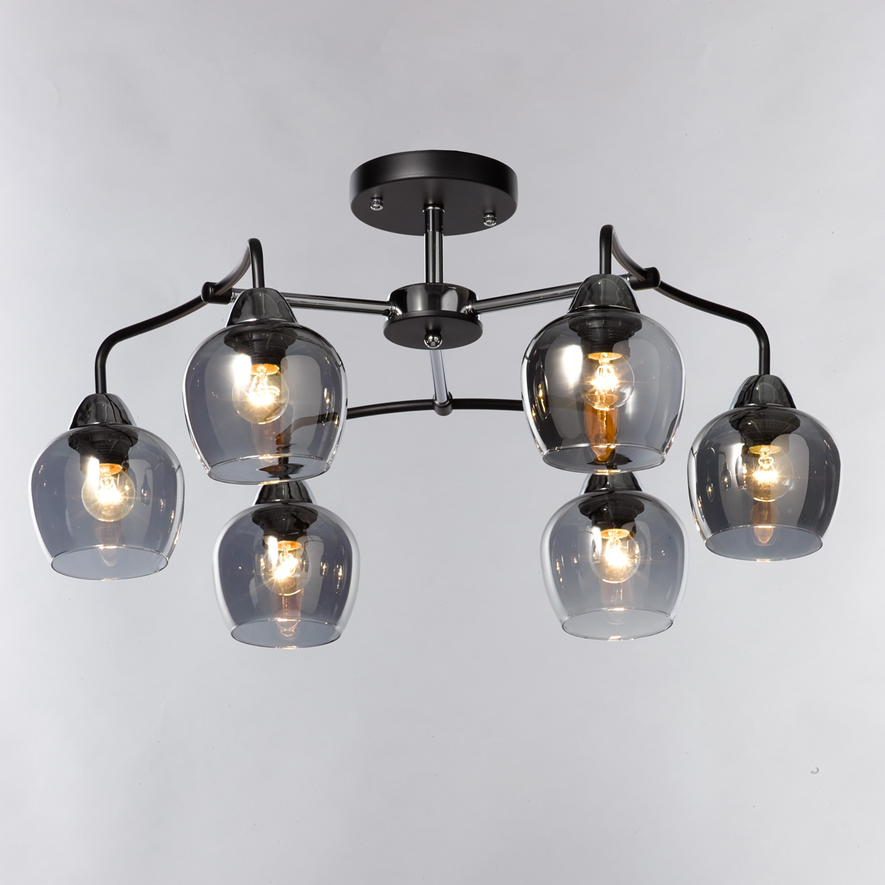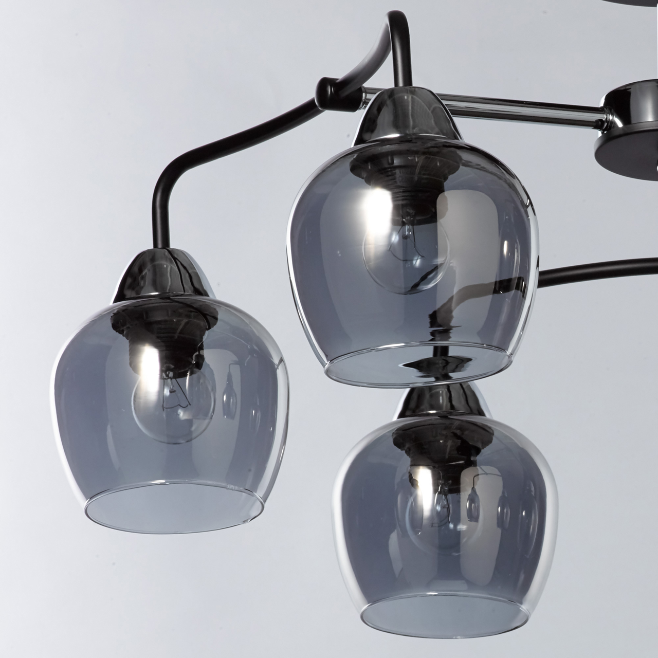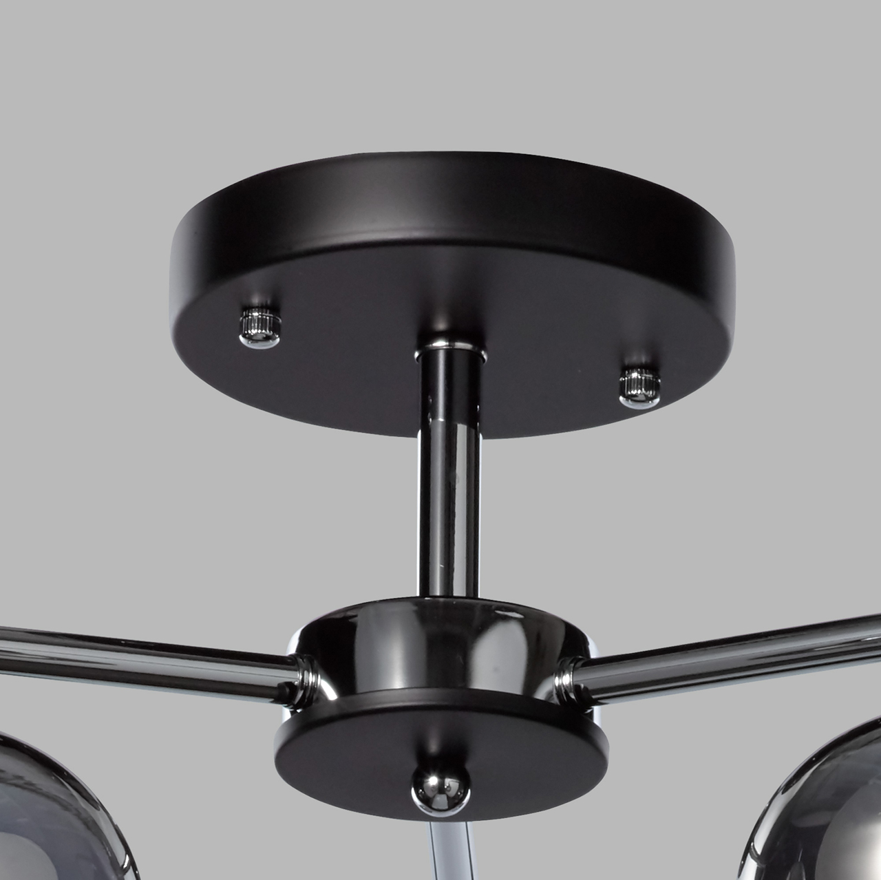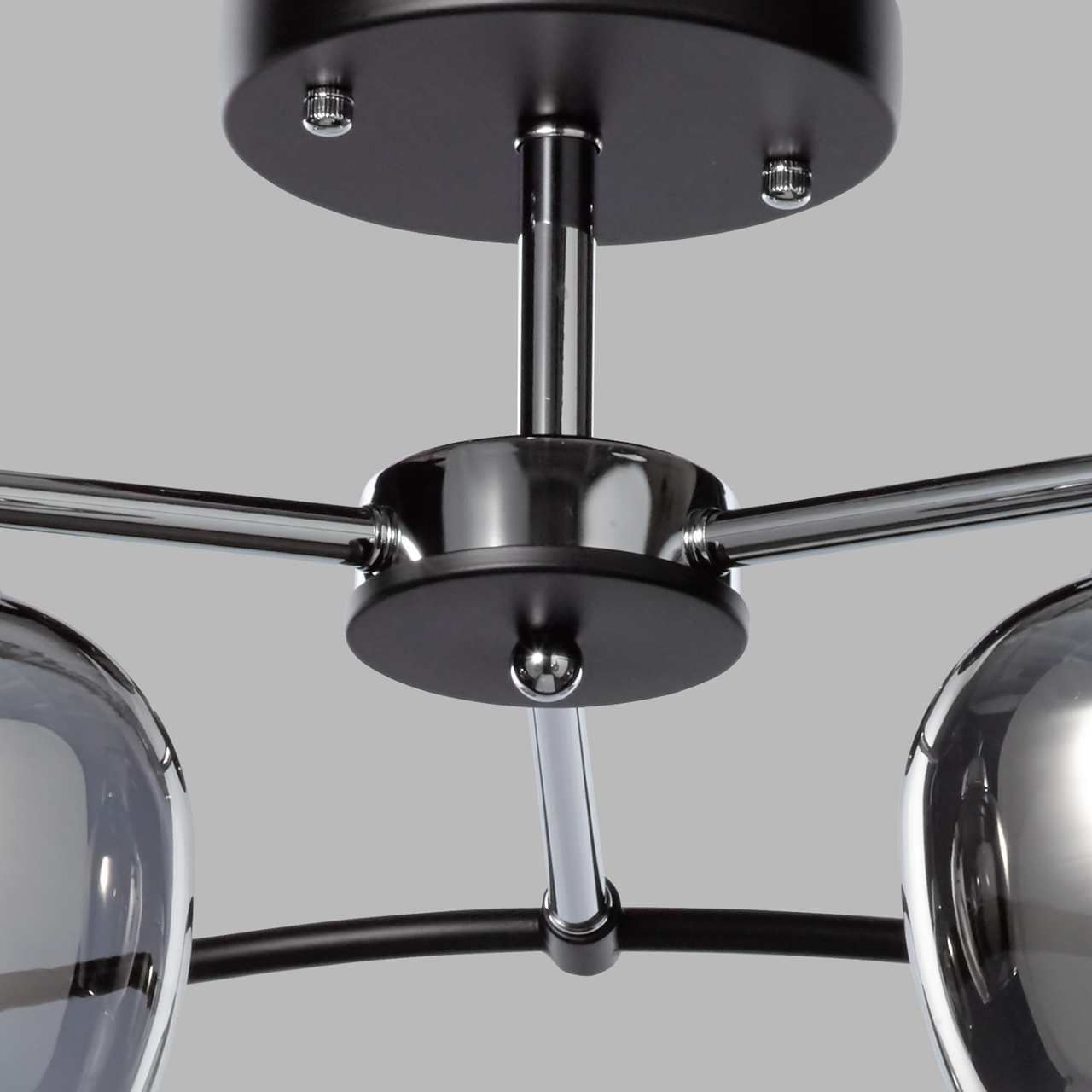 Актуальная диайн-идея светильника. Контрастное сочетание металлов черного цвета и хрома. Тонированные в дымчатый цвет плафоны создают комфортный свет. Широкий диаметр обеспечивает высокие показатели освещенности. Компактная высота модели идеальна для стандартной высоты потолка.Преимущества модели