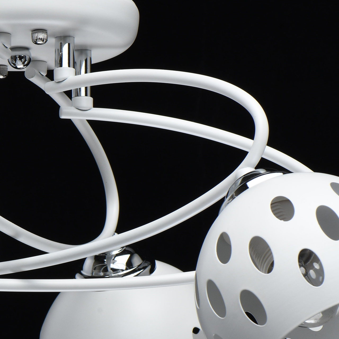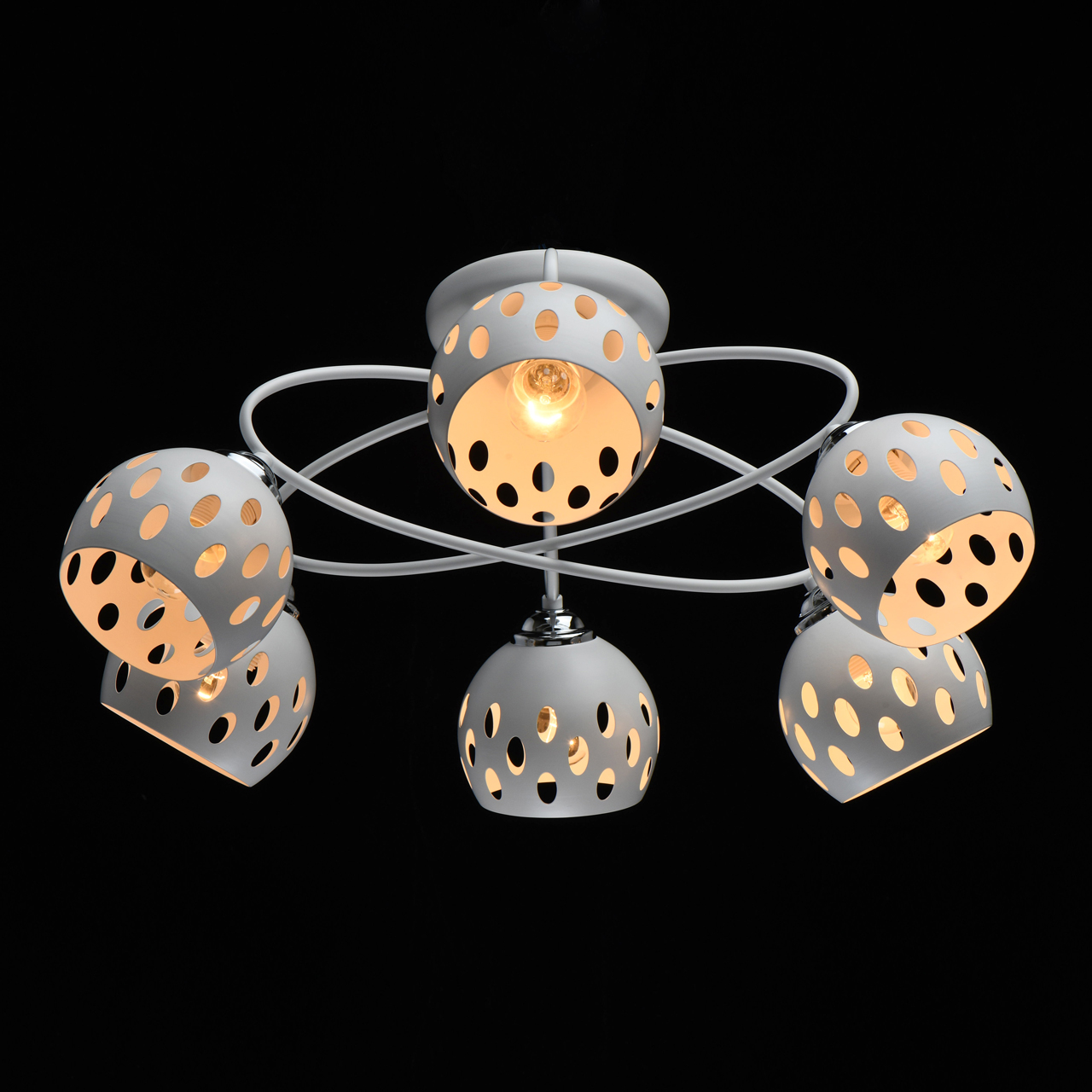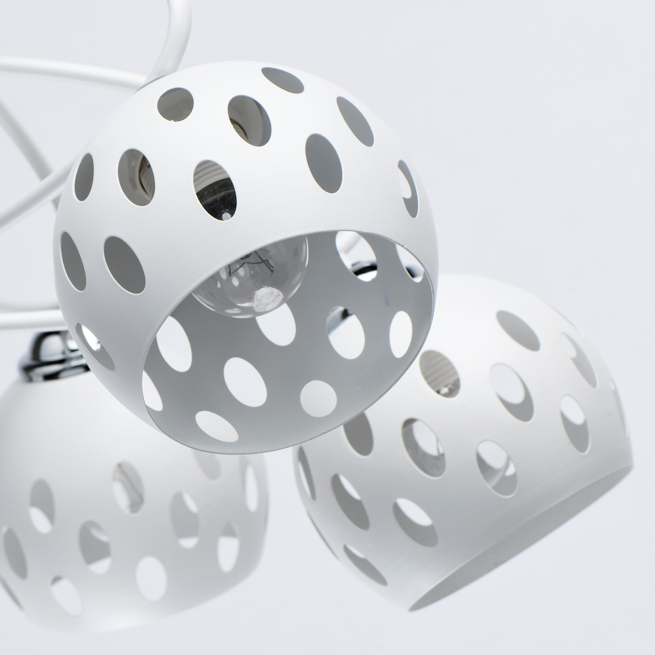 Основание светильника выполнено из металла и окрашено в белый цвет. Отдельные элементы основания гальванизированы в цвет хрома. На металлических плафонах по технологии лазерной резки нанесены симметричные отверстия.Тип помещения