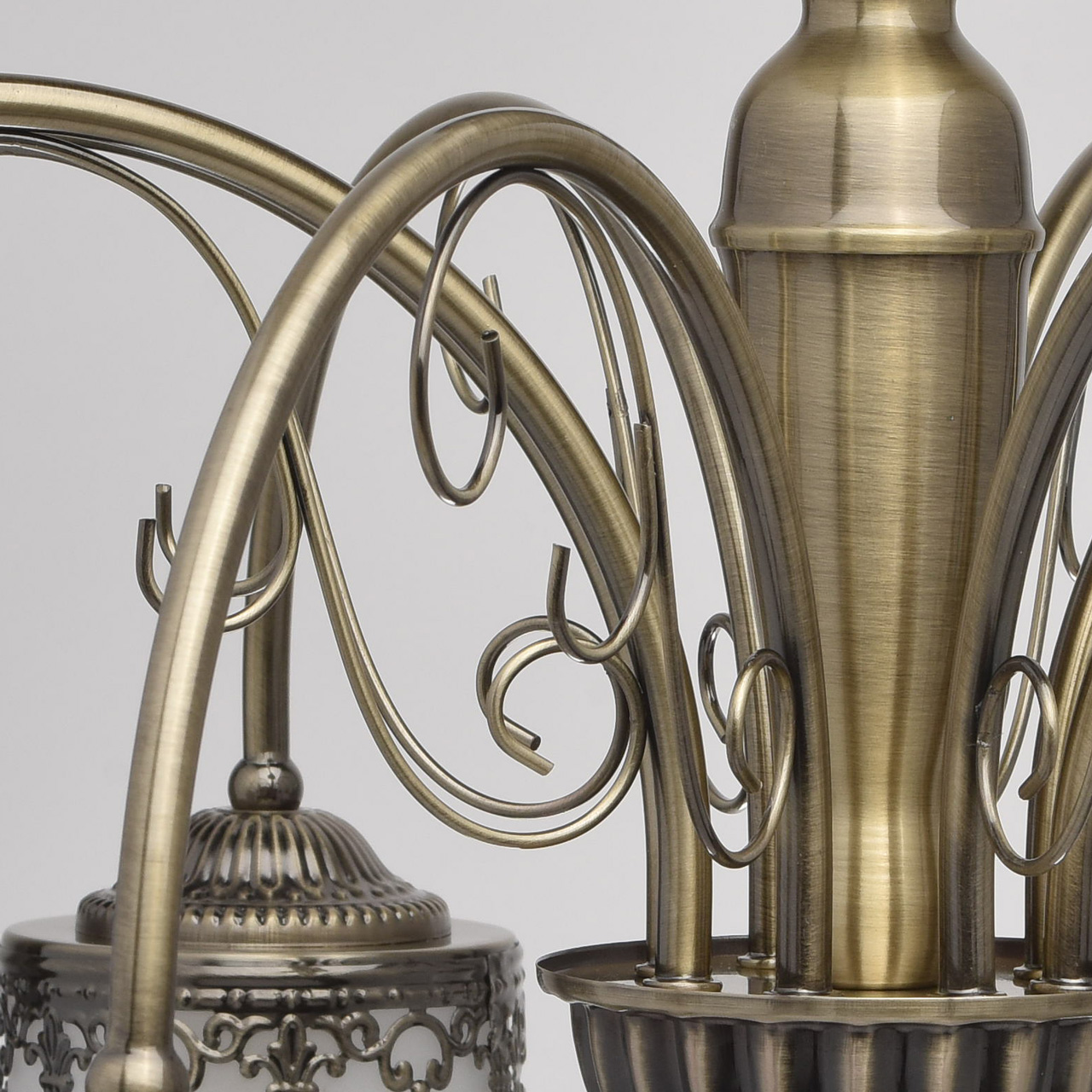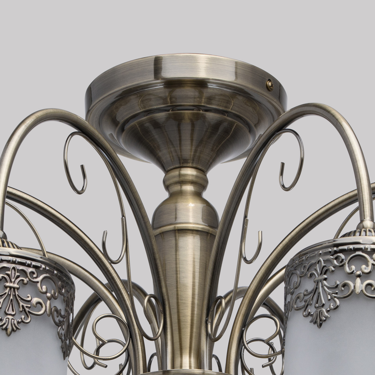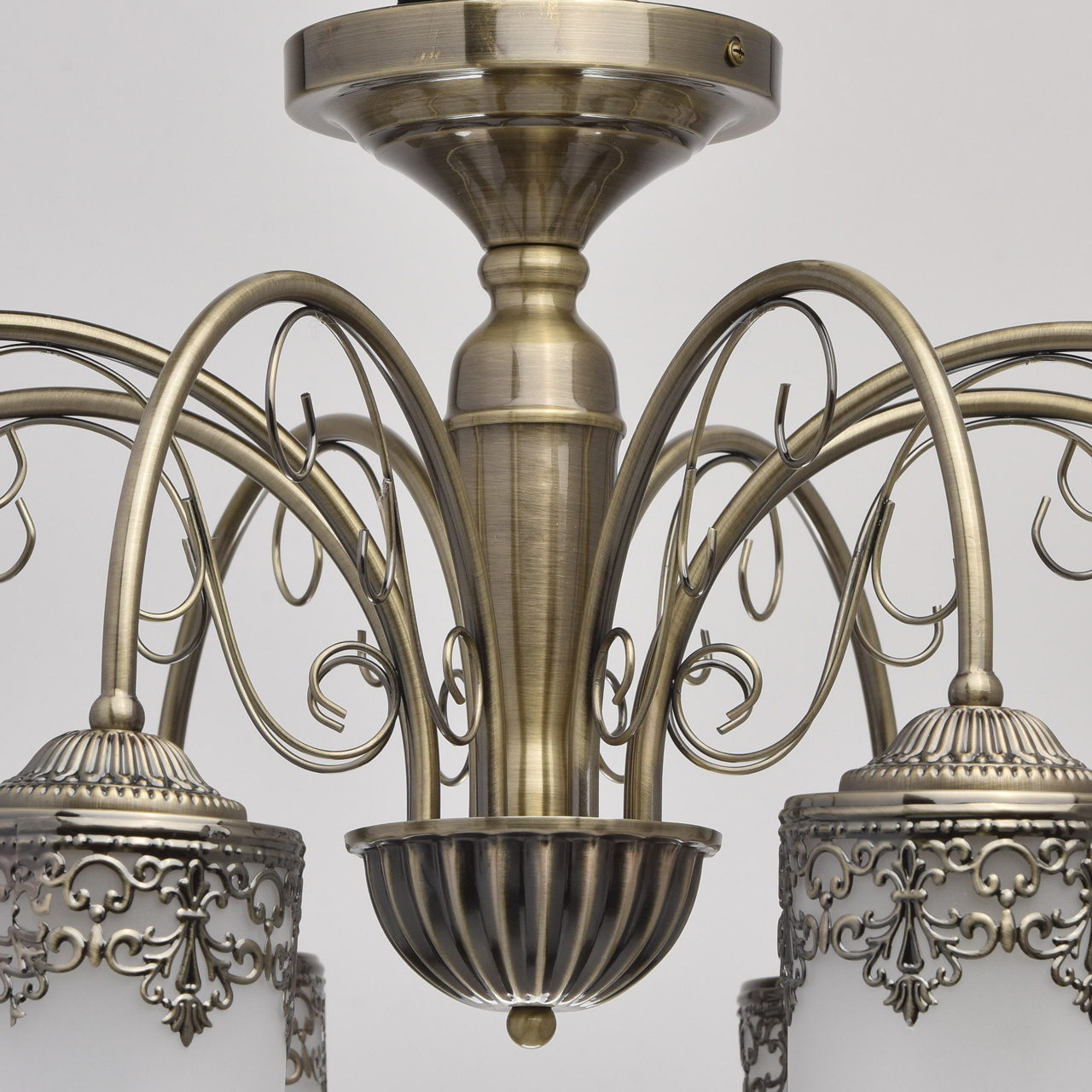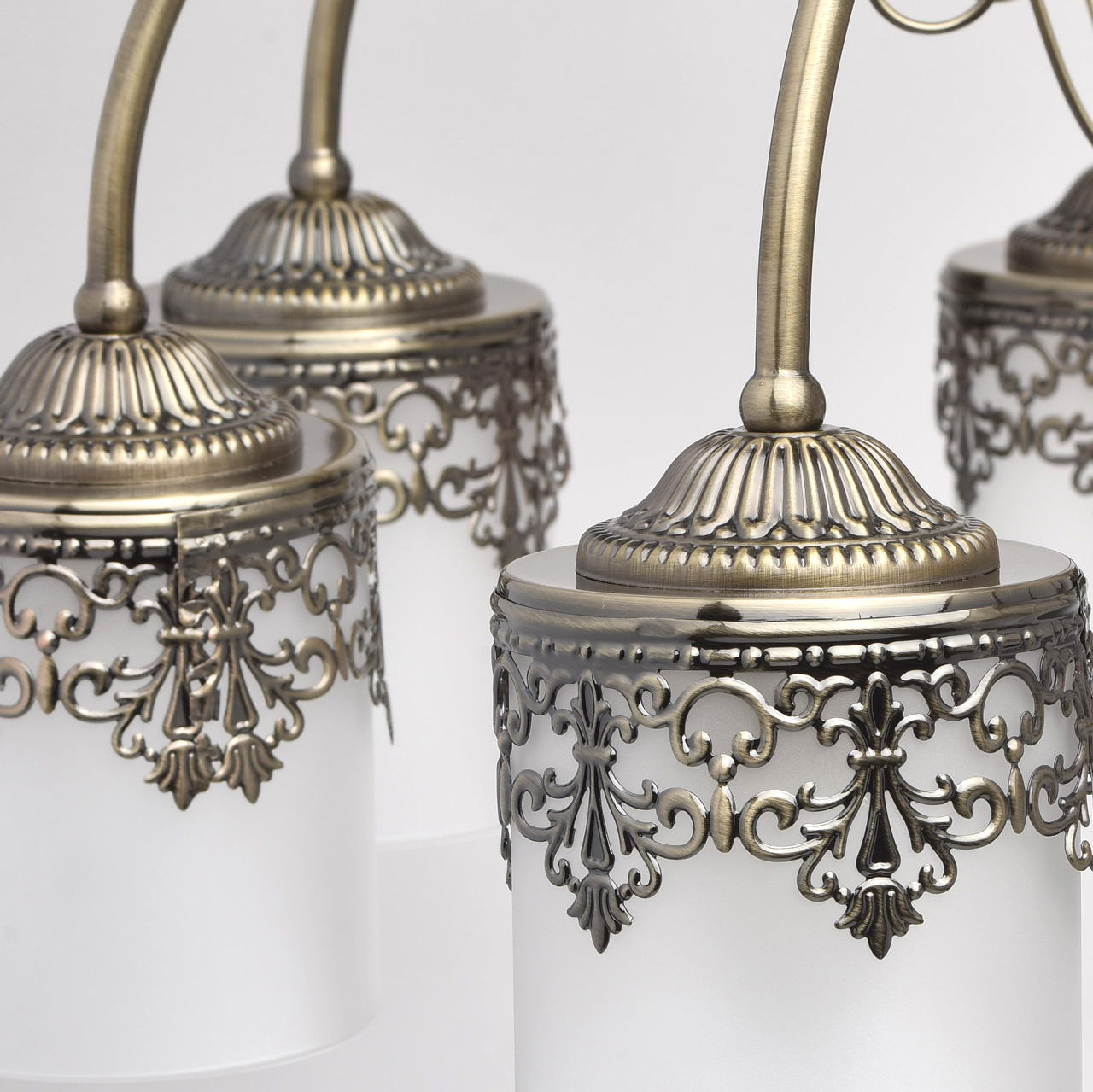 Металлическое основание цвета античной бронзы. Плафоны: матовое стекло. Декор: металлический орнамент.Технология производства