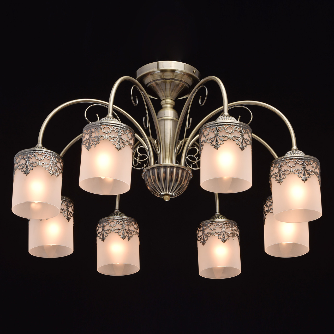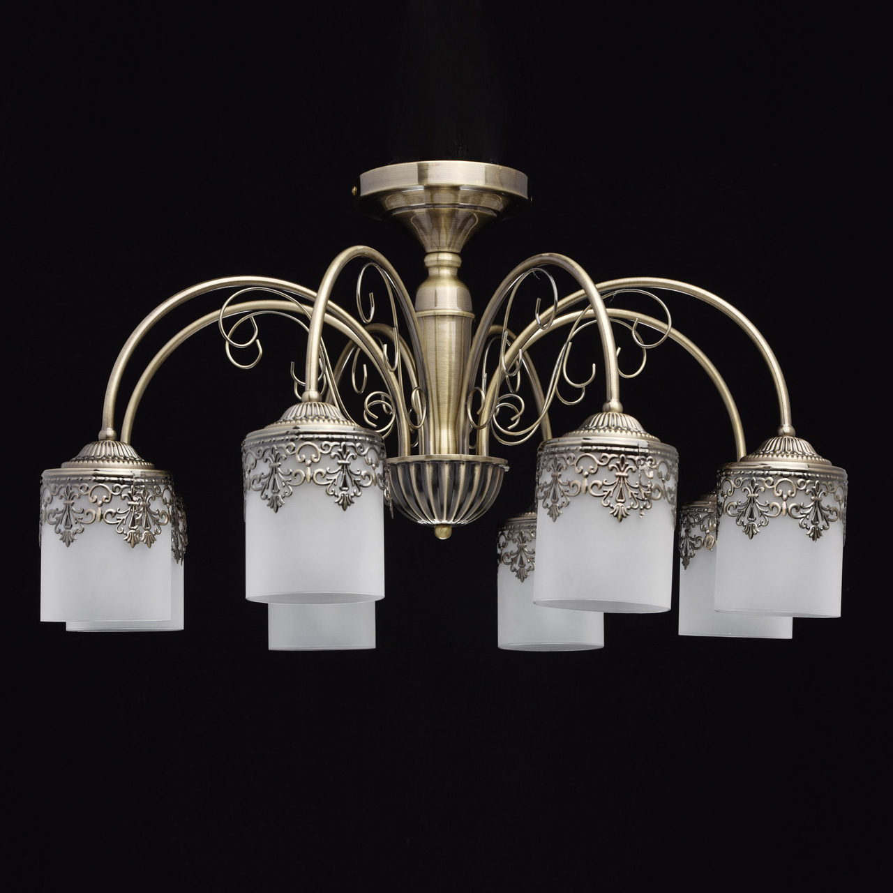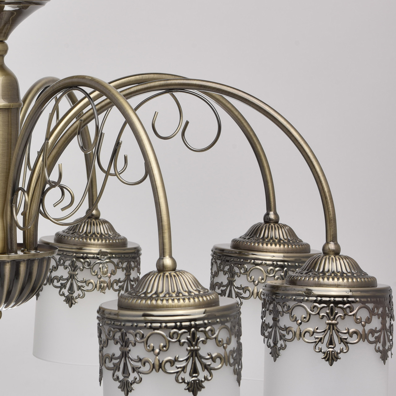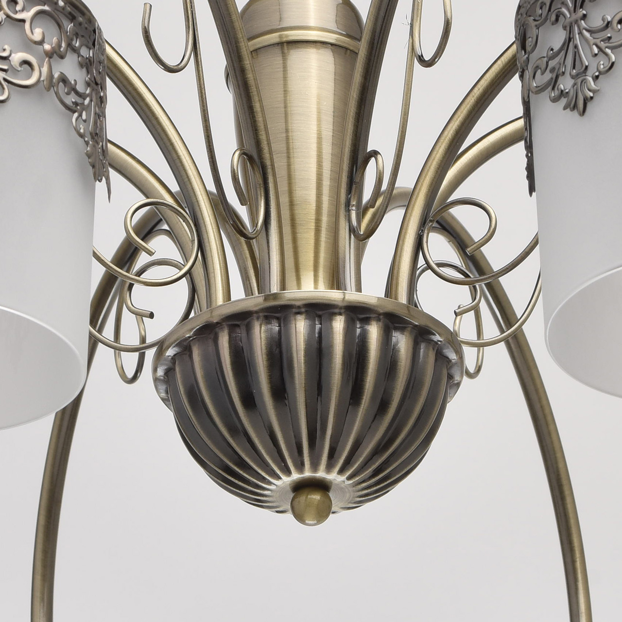 Металлическое основание цвета античной бронзы. Плафоны: матовое стекло. Декор: металлический орнамент.Технология производства