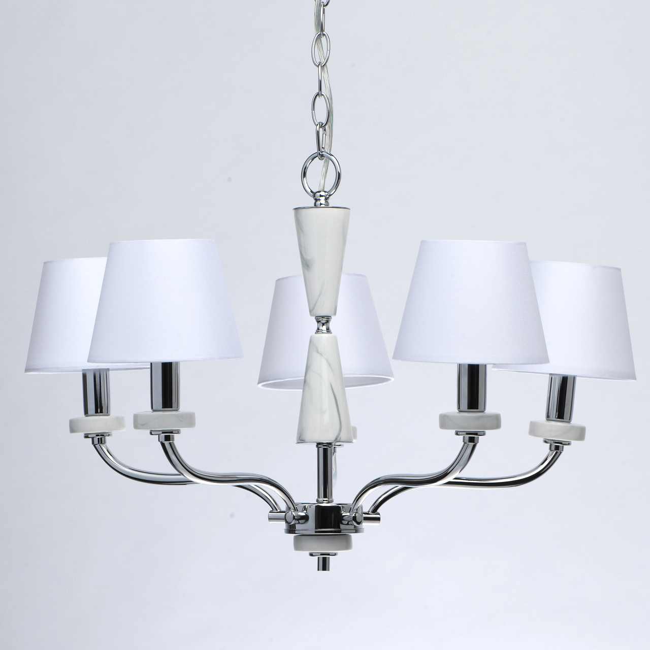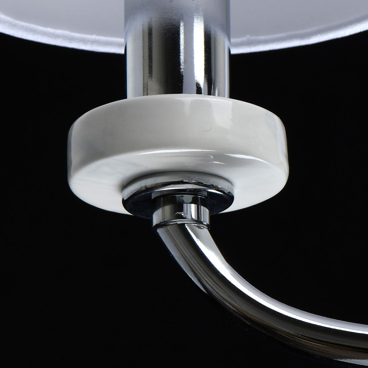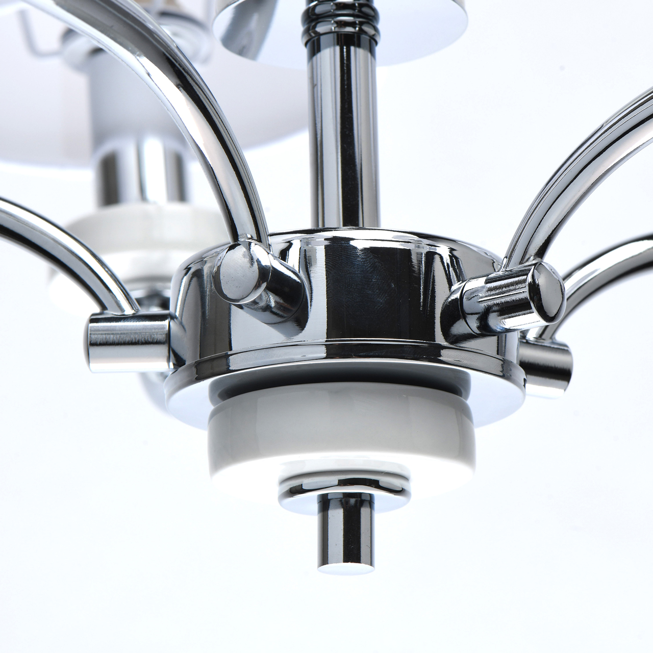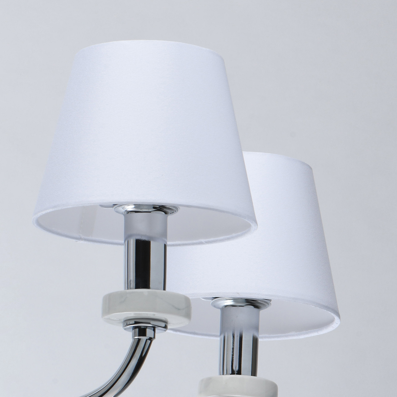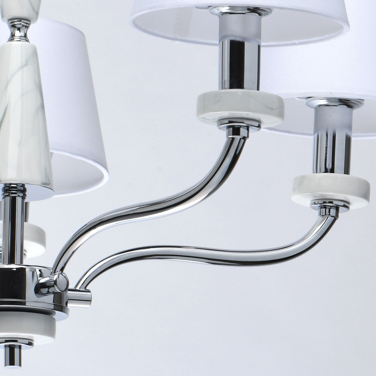 Основание светильника выполнено из металла и гальванизировано в цвет хрома. Светильник декорирован белыми текстильными абажурами с термостойким акрилом внутри. Абажуры прошиты и отделаны кантом. Декоративные розетки и декор центральной оси выполнены из глазурированного фарфора с надглазурной росписью, имитирующей мрамор.Тип помещения