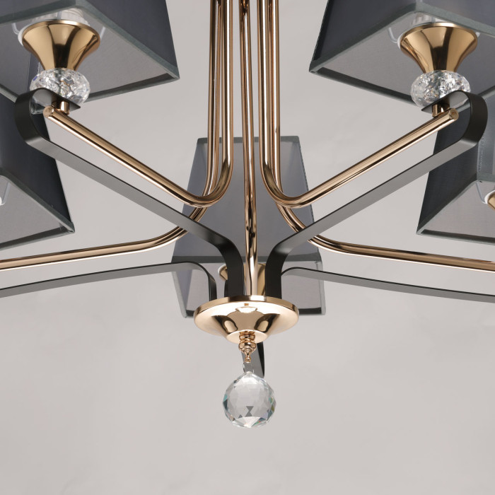 Отдельные элементы основания гальванизированы в цвет золота. Традиционные источники света закрыты текстильными абажурами серого цвета с прозрачным термостойким акрилом внутри. Абажуры прошиты и отделаны кантом сверху и снизу. Люстра декорирована прозрачным хрусталем.