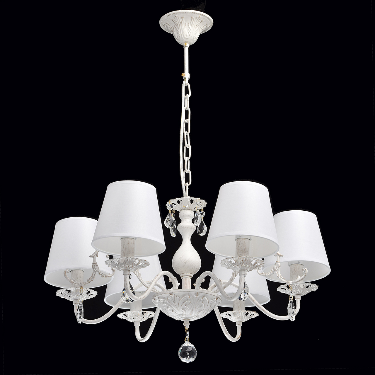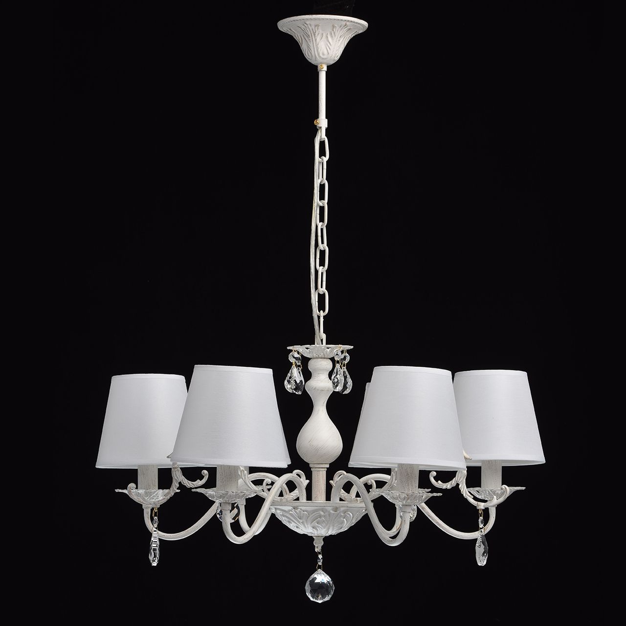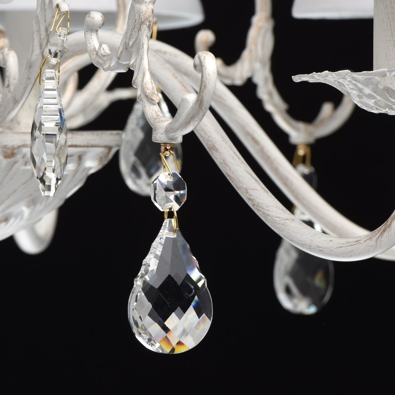 Металлическое основание окрашено в белый цвет с золотистой патиной. Абажуры - текстиль белого цвета. Декор - хрусталь.Технология производства