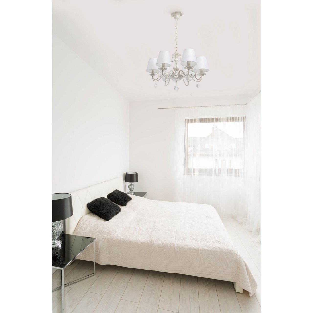 Изящный дизайн в классическом стиле и благородный белый цвет позволяет люстре встроиться в большинство интерьеров любой цветовой гаммы. Тонкие изогнутые рожки и ажурные розетки делают люстру воздушной и легкой. За счет белых тканевых абажуров создается мягкое приятное равномерное освещение Хрустальные подвесы создают удивительную игру света. Наличие бра в семье дает возможность комплексного освещения помещения.Стилевые решения интерьера